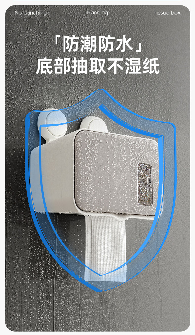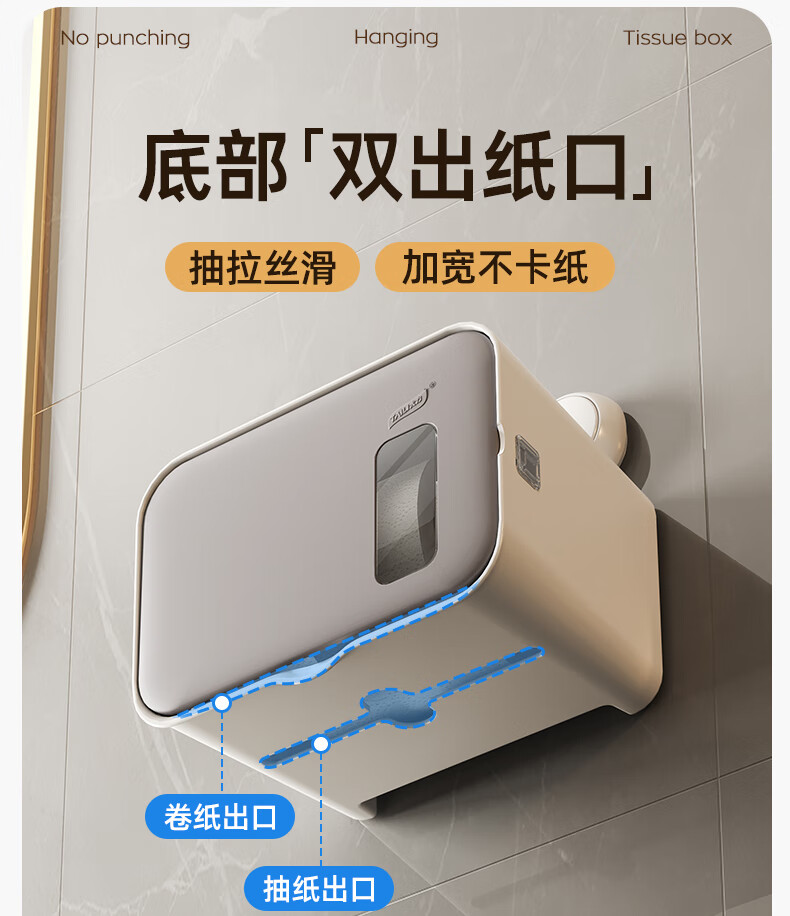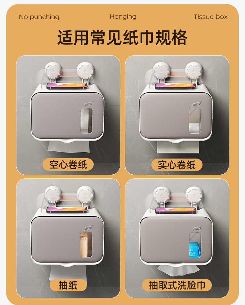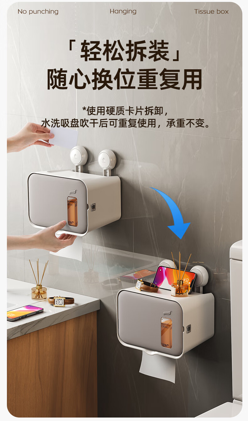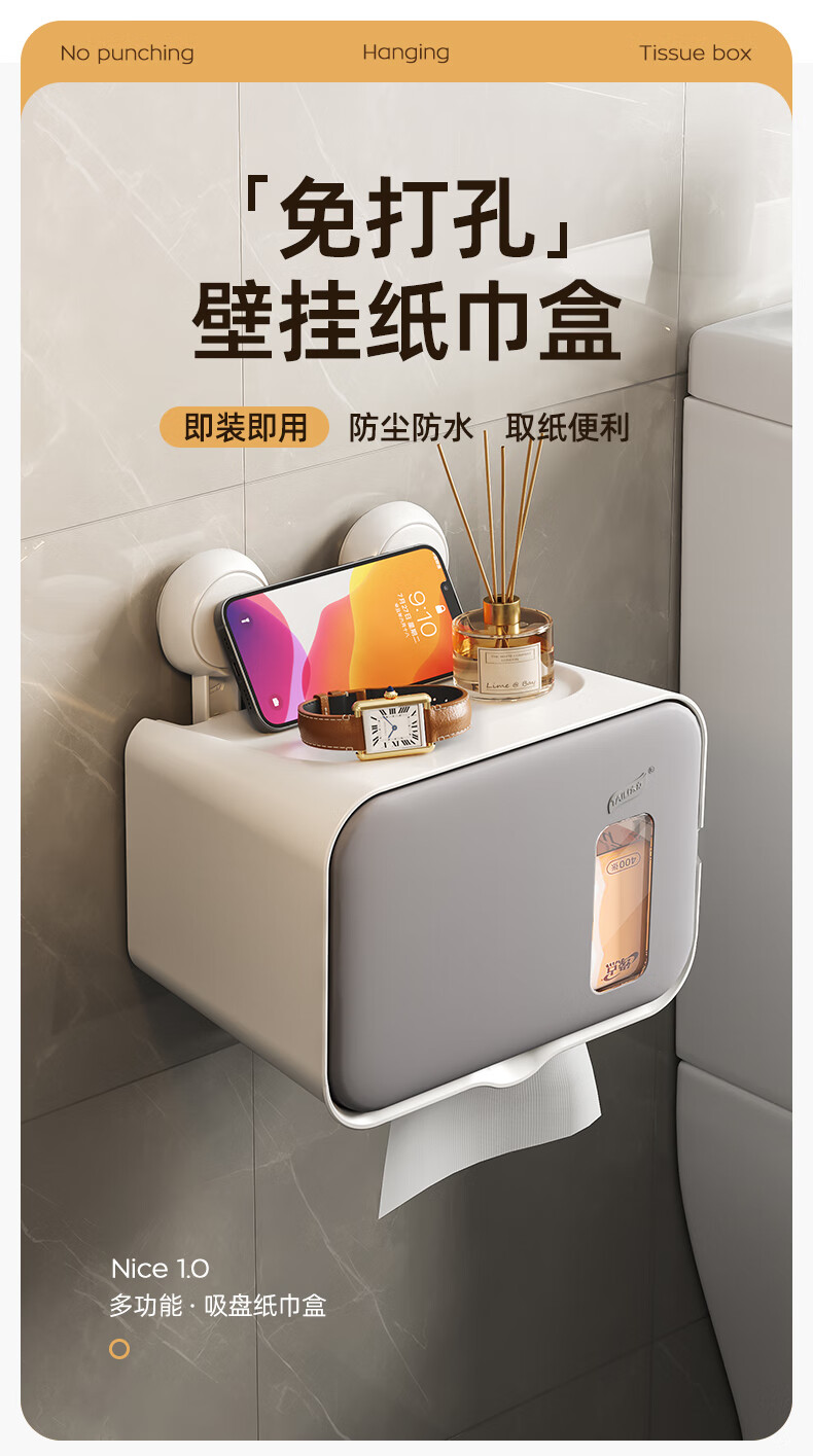太力卫生间吸盘纸巾盒免打孔壁挂式抽纸盒置物架厕纸多功能卷纸挂盒 灰白色【卷/抽纸两用】