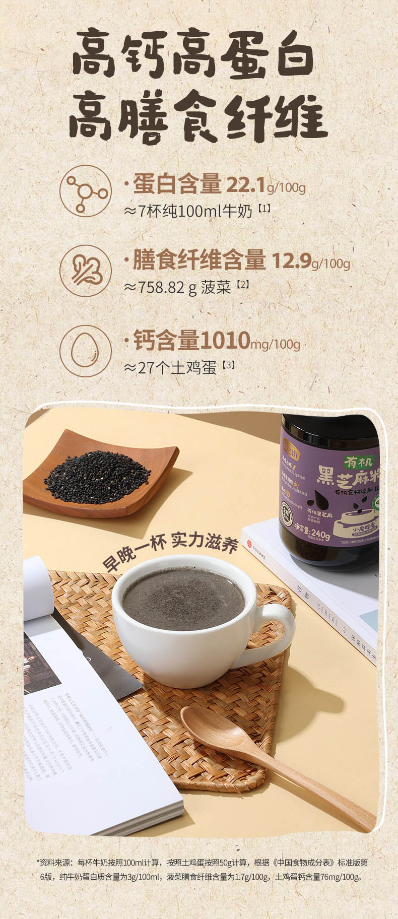 燕之坊有机黑芝麻粉240g熟纯黑芝麻糊无添加营养早餐无糖高钙即食代餐粉