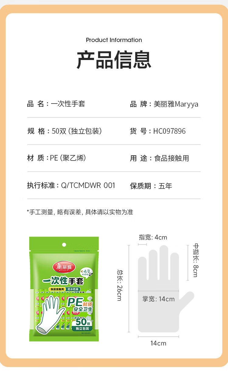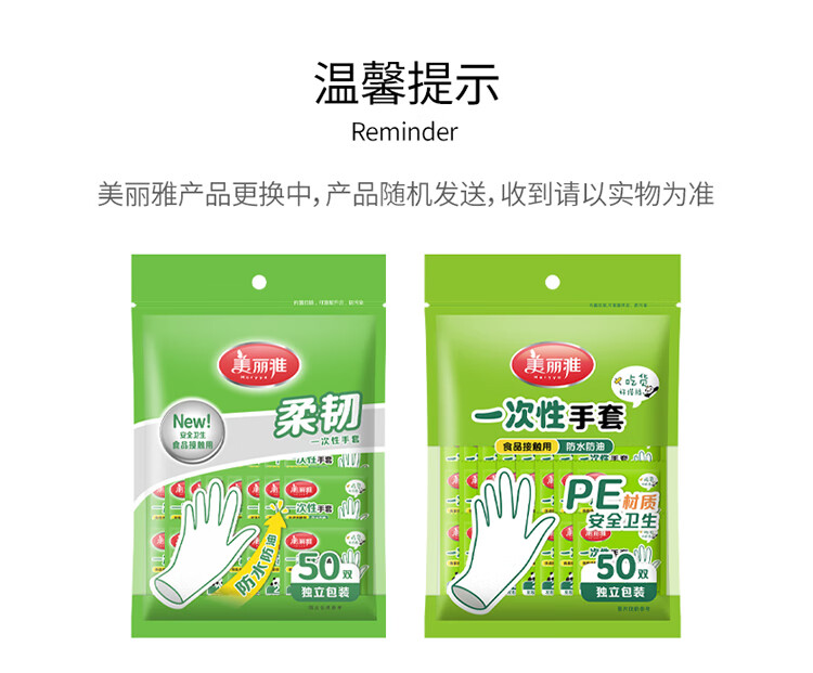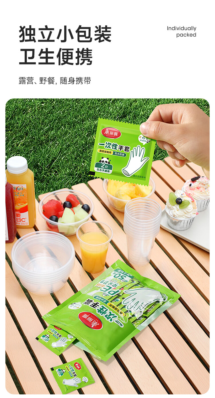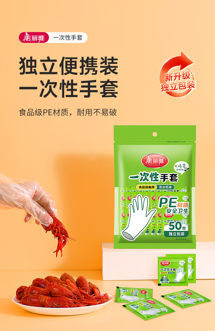 美丽雅 一次性手套独立包装50双 食品用升级加厚手套pe厨房餐饮家务手套