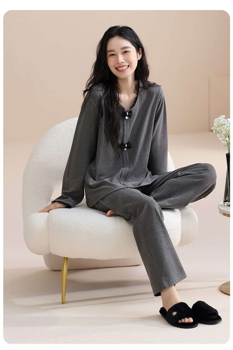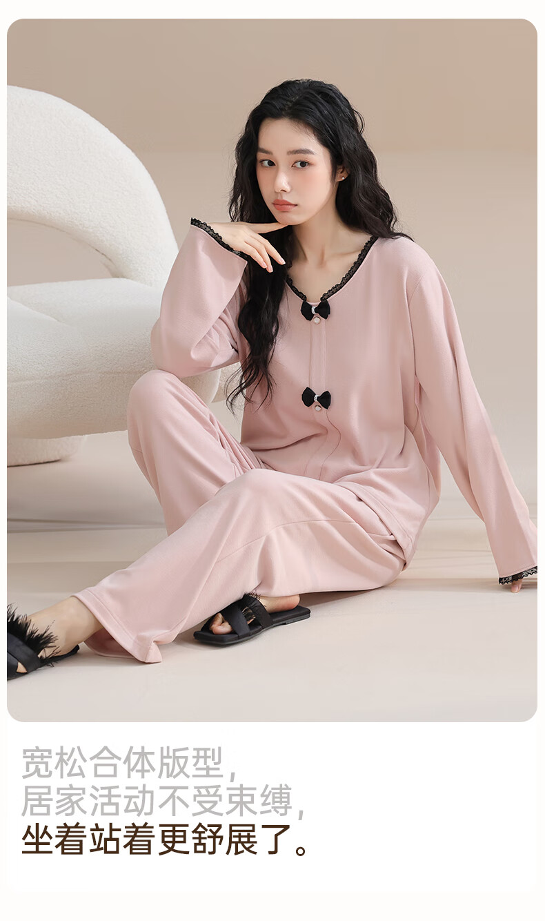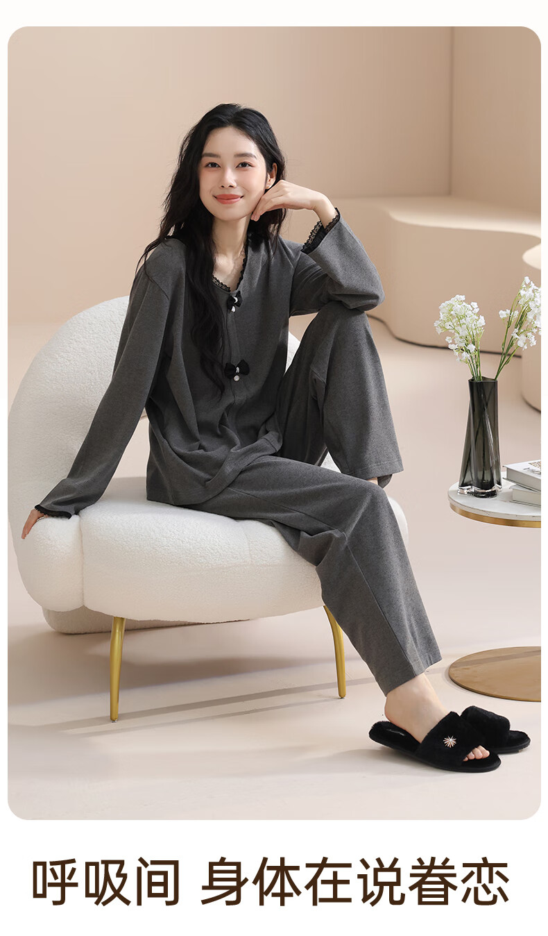 玛伦萨纯棉睡衣女春秋季可外穿2025新款长袖长裤女士全棉柔软家居服 黑色 M