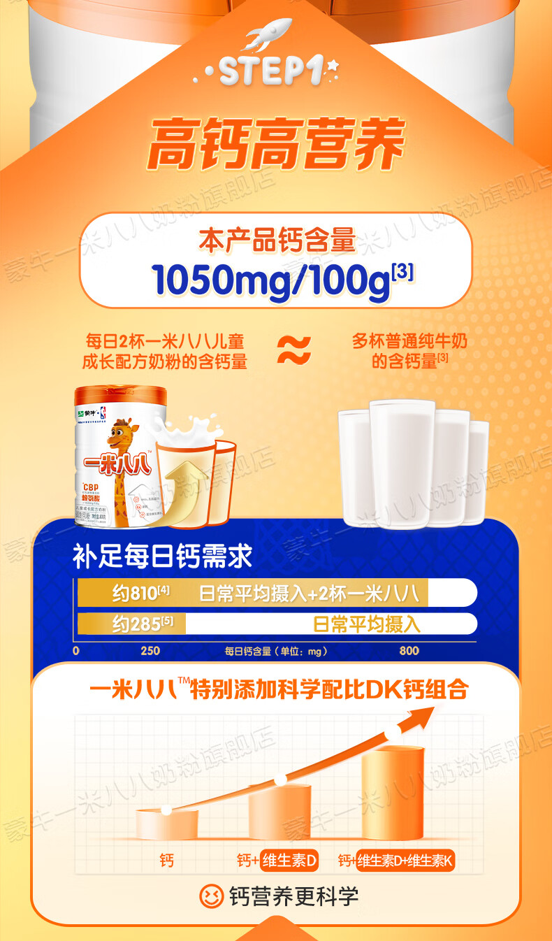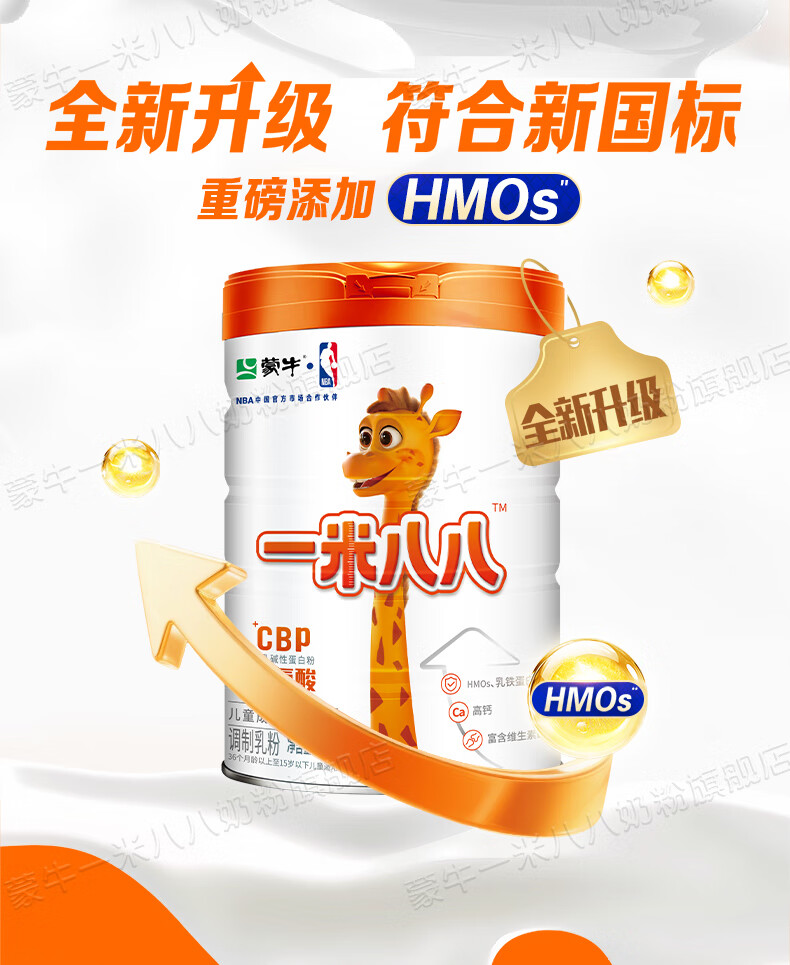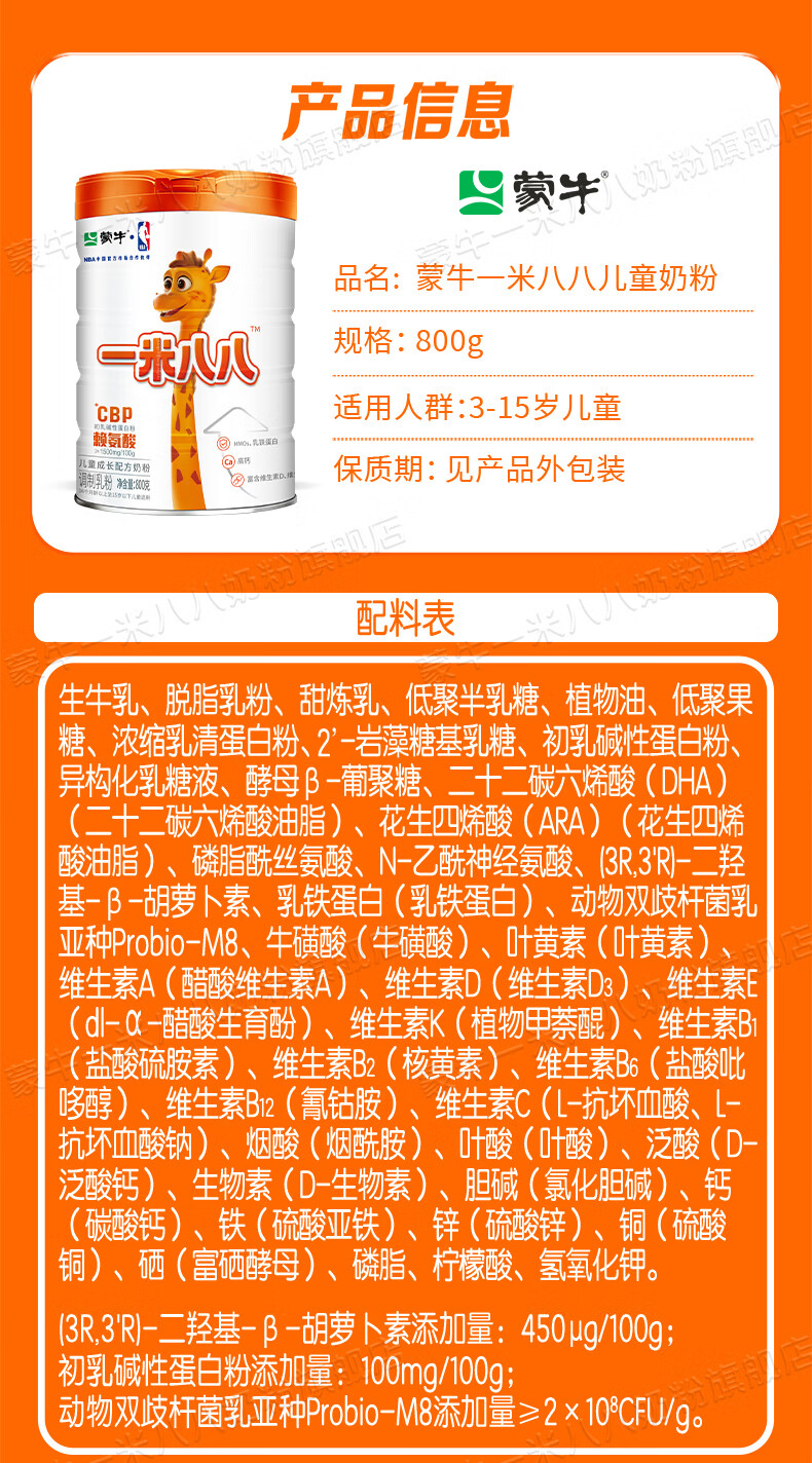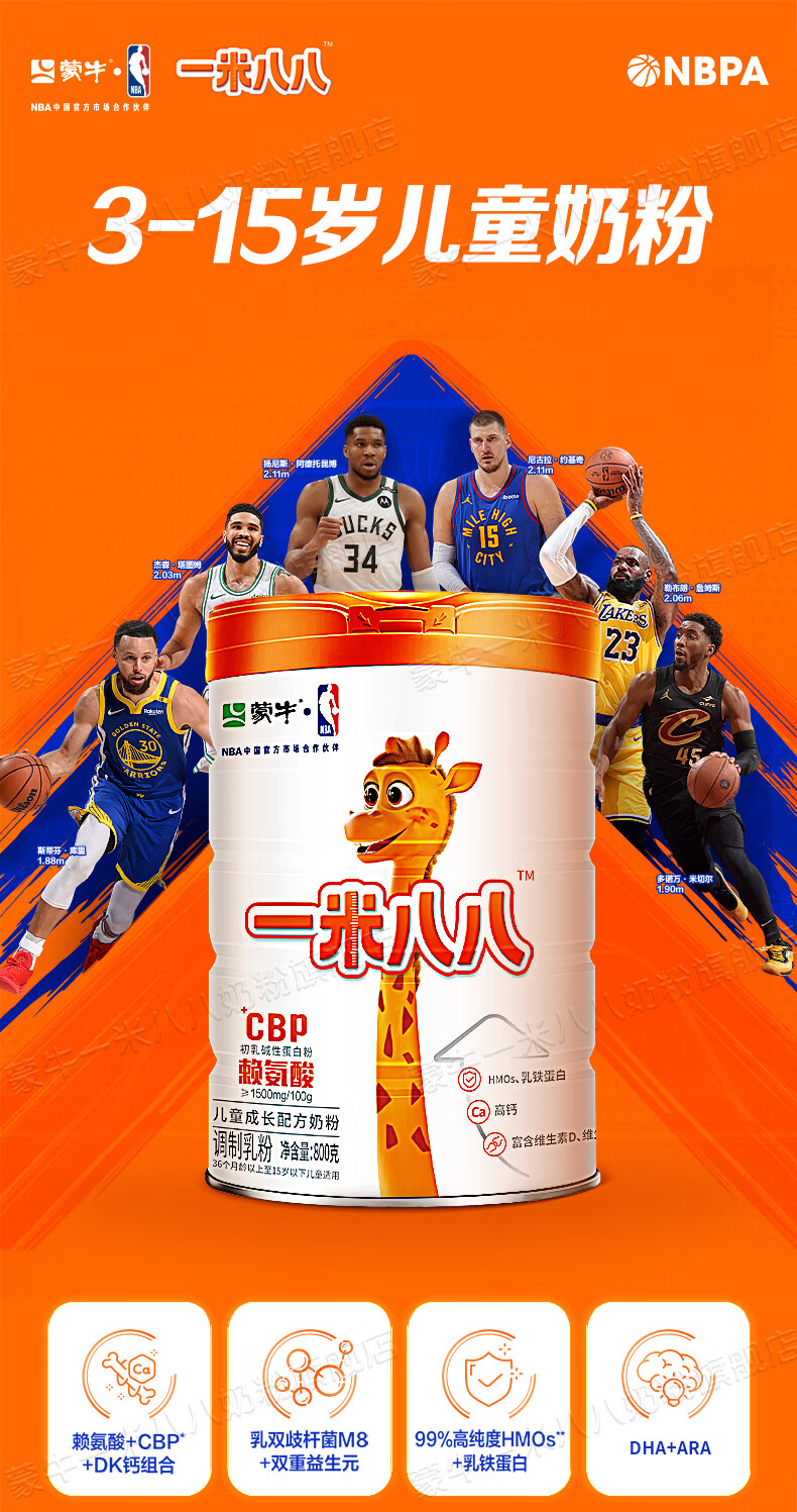蒙牛一米八八【NBA联名】儿童成长奶粉CBP赖氨酸高钙3-15岁800g*2罐