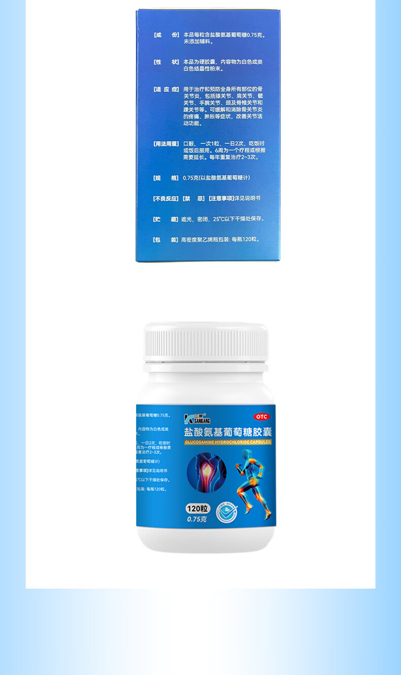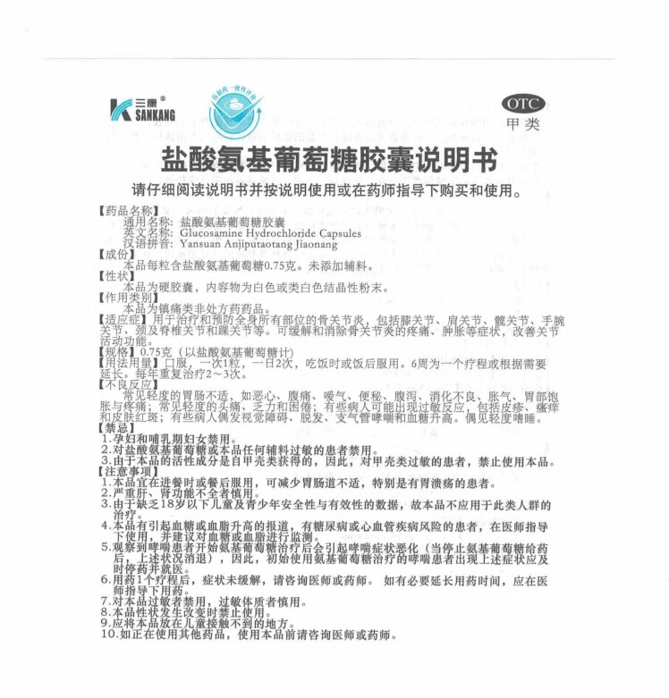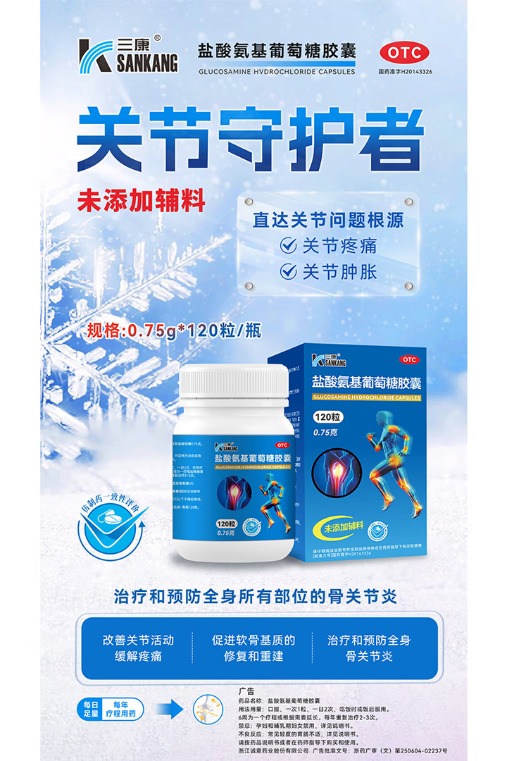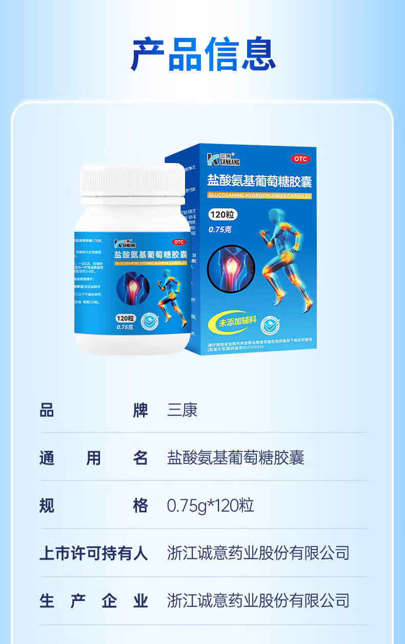 【三康】盐酸氨基葡萄糖胶囊 0.75g*120粒 氨糖 治疗骨关节炎 预防骨关节炎