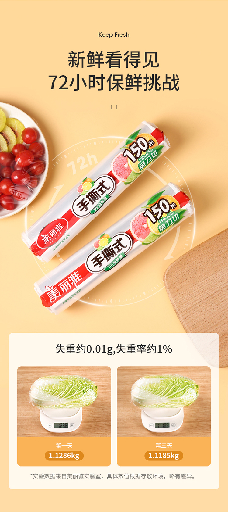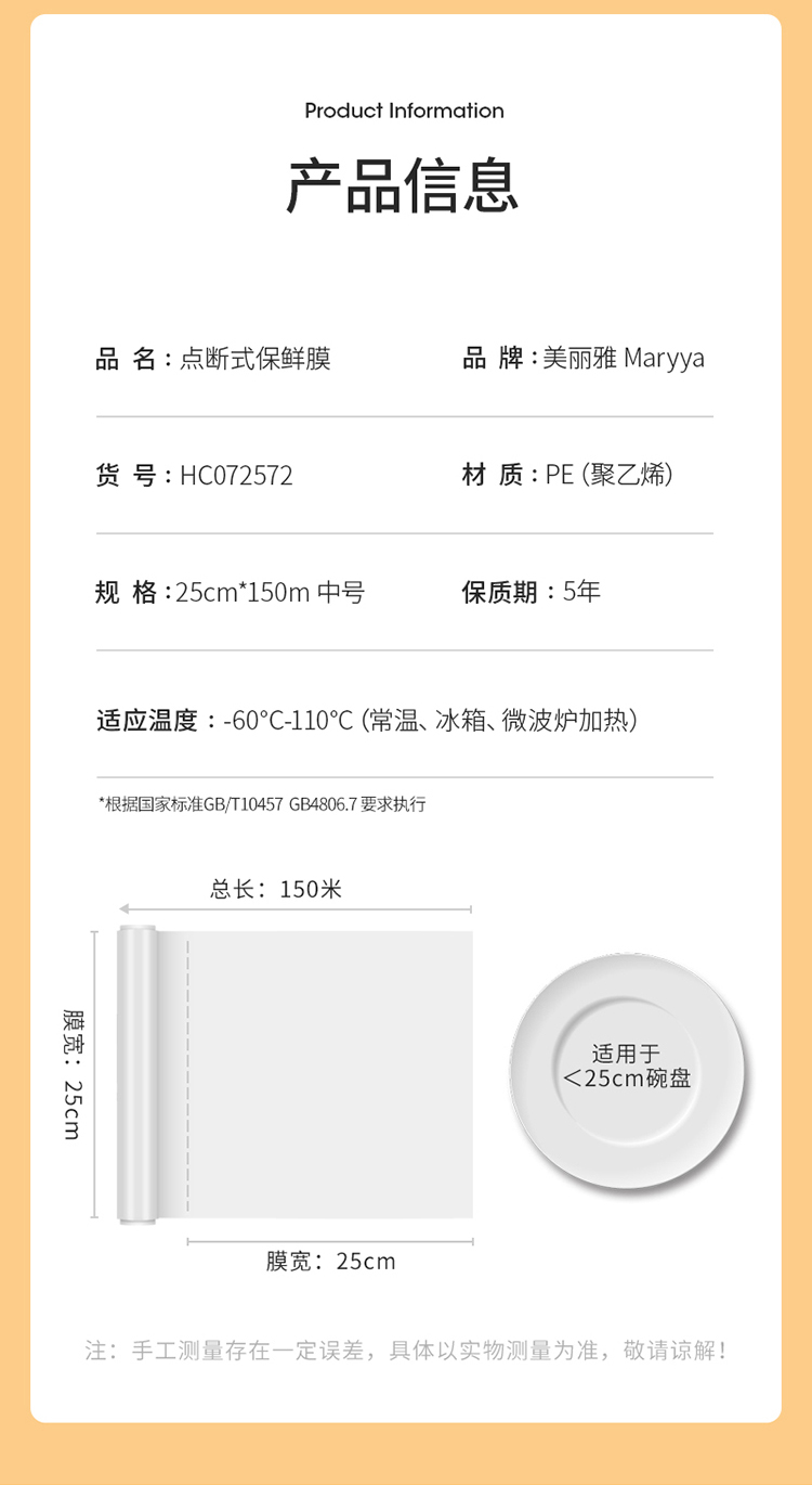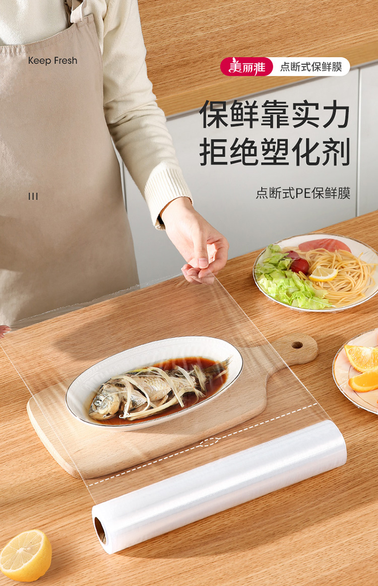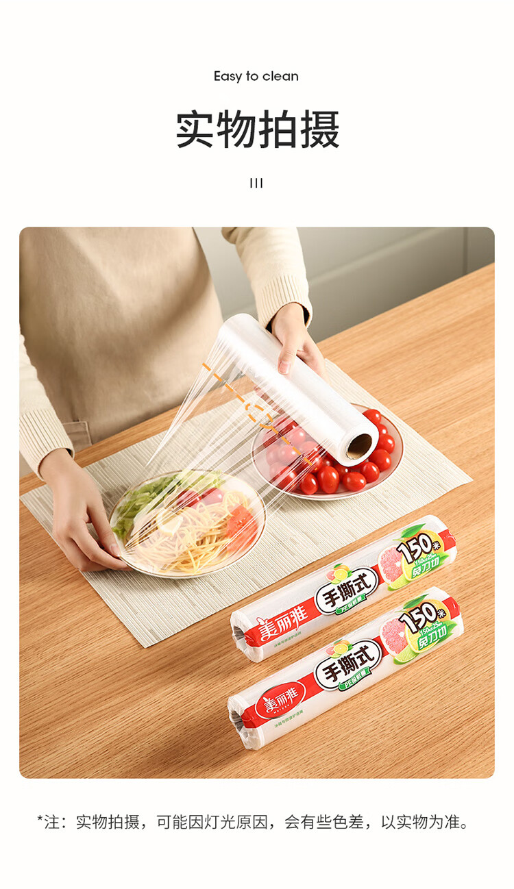 美丽雅 耐高温保鲜膜食品用 微波炉冰箱适用 中号断点式25cm*150米