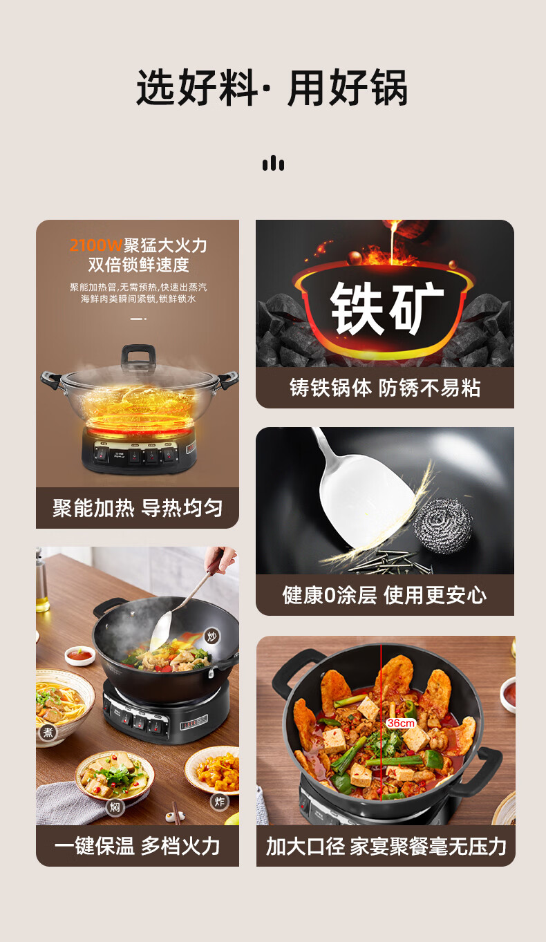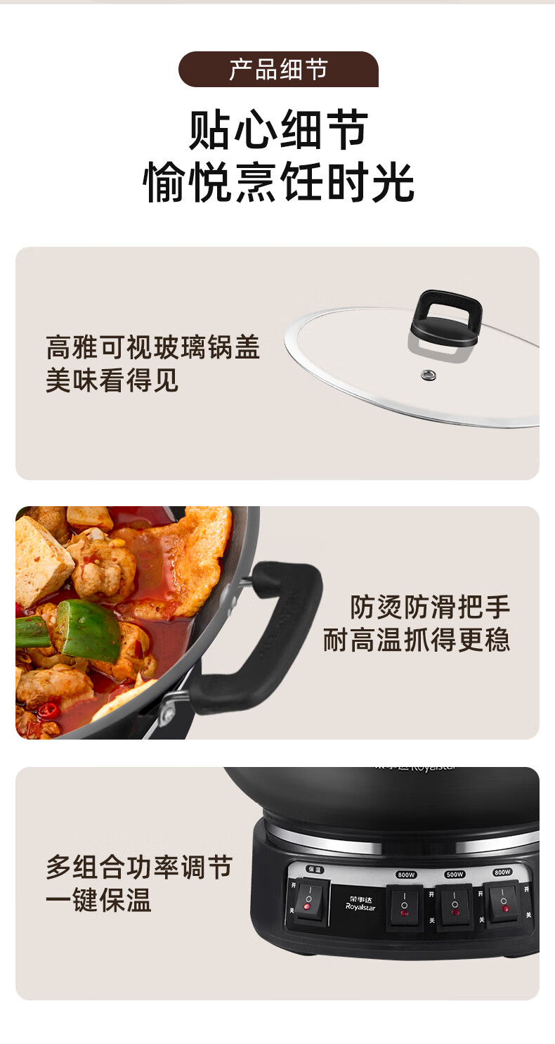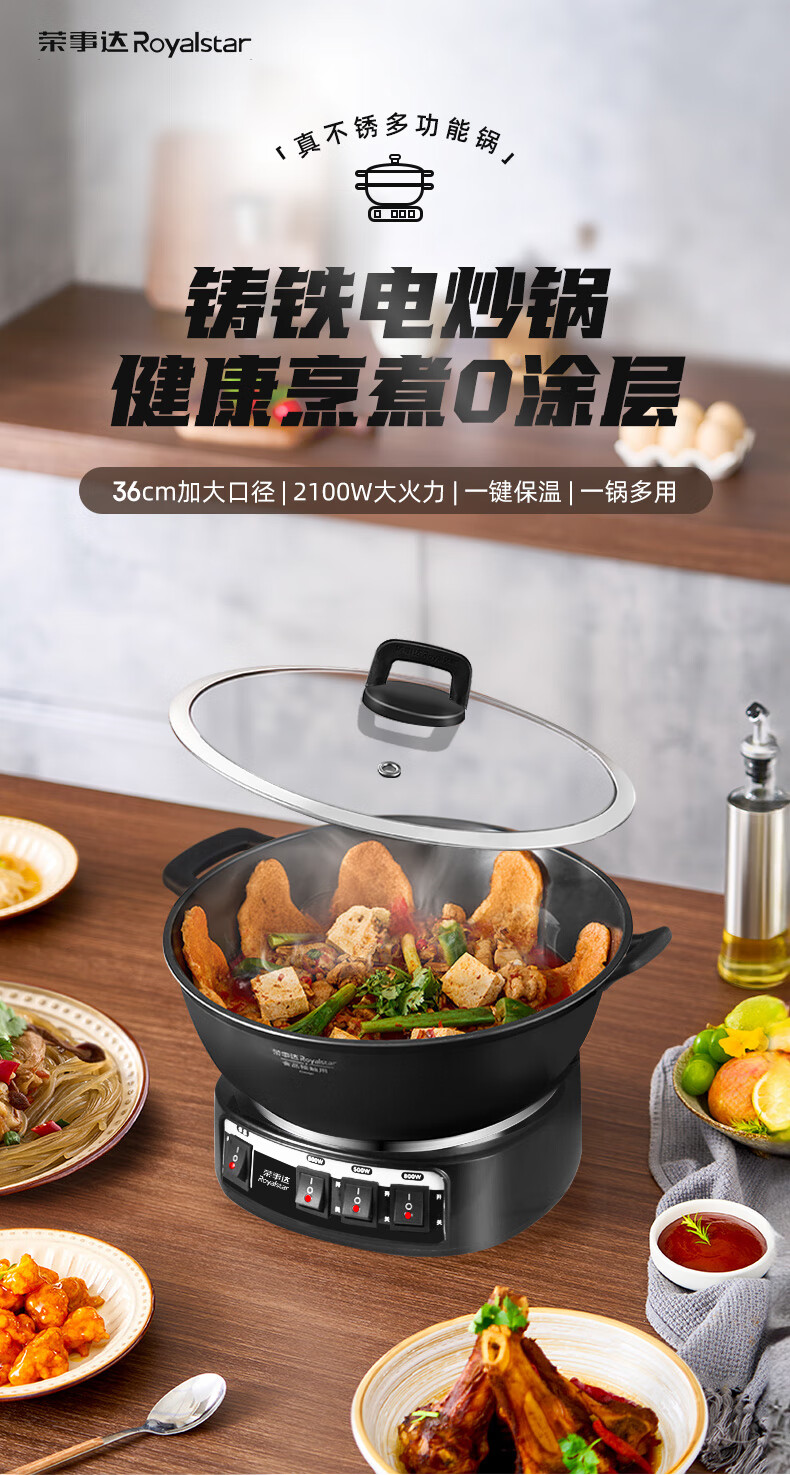 荣事达(Royalstar)电炒锅电蒸锅电煮锅山东锅家用铸铁炖蒸煮不粘锅一体多功能蒸笼蒸包子电火锅RS-FT36