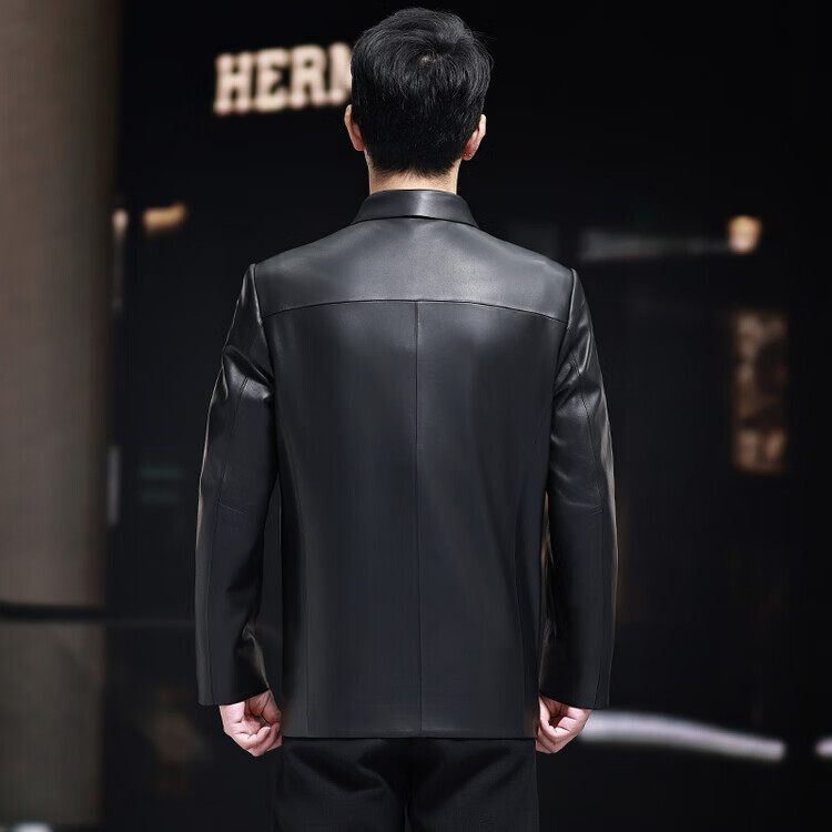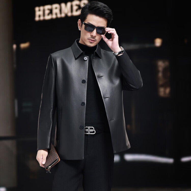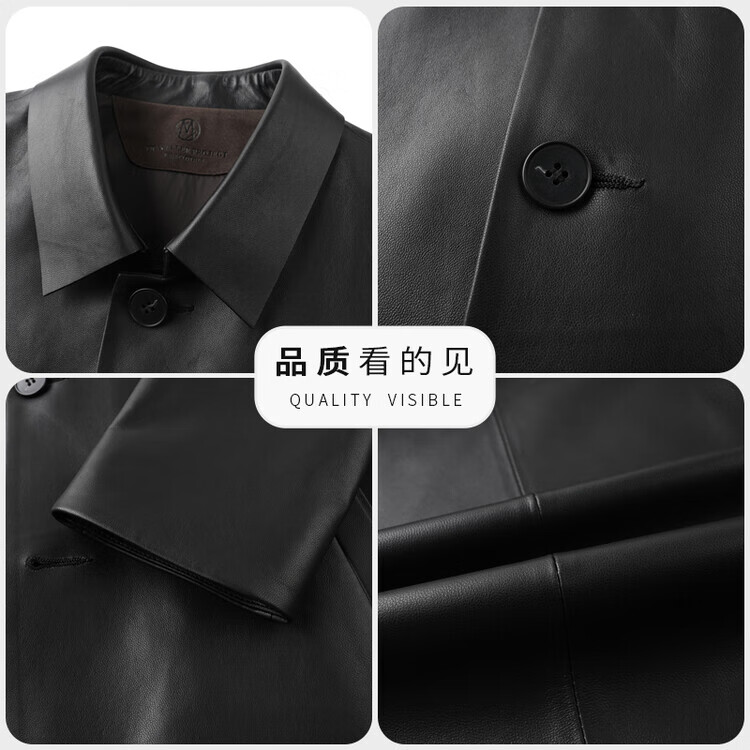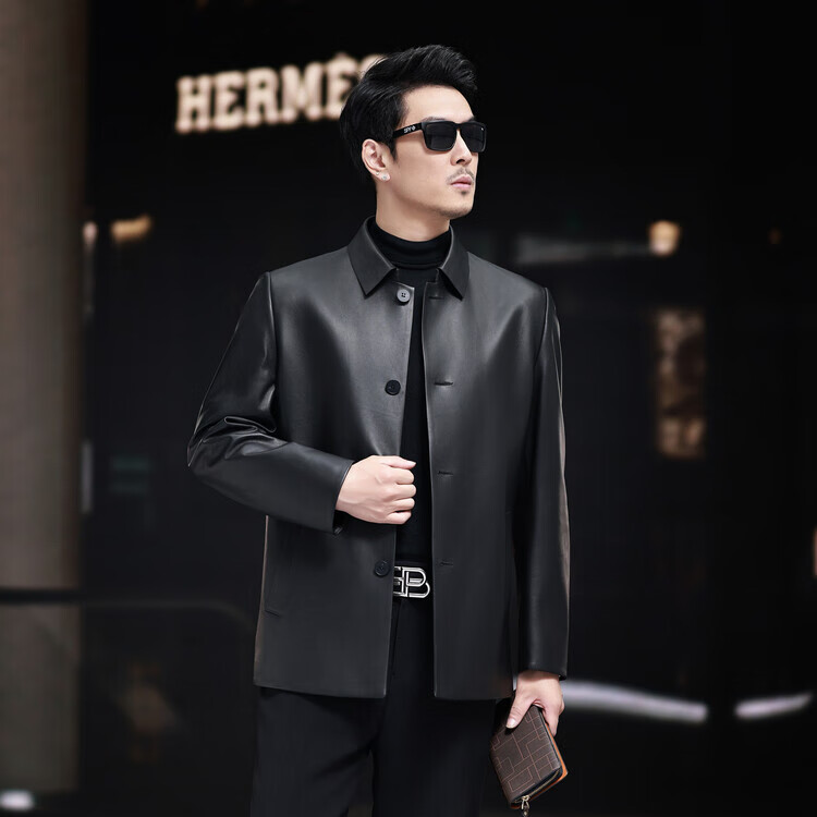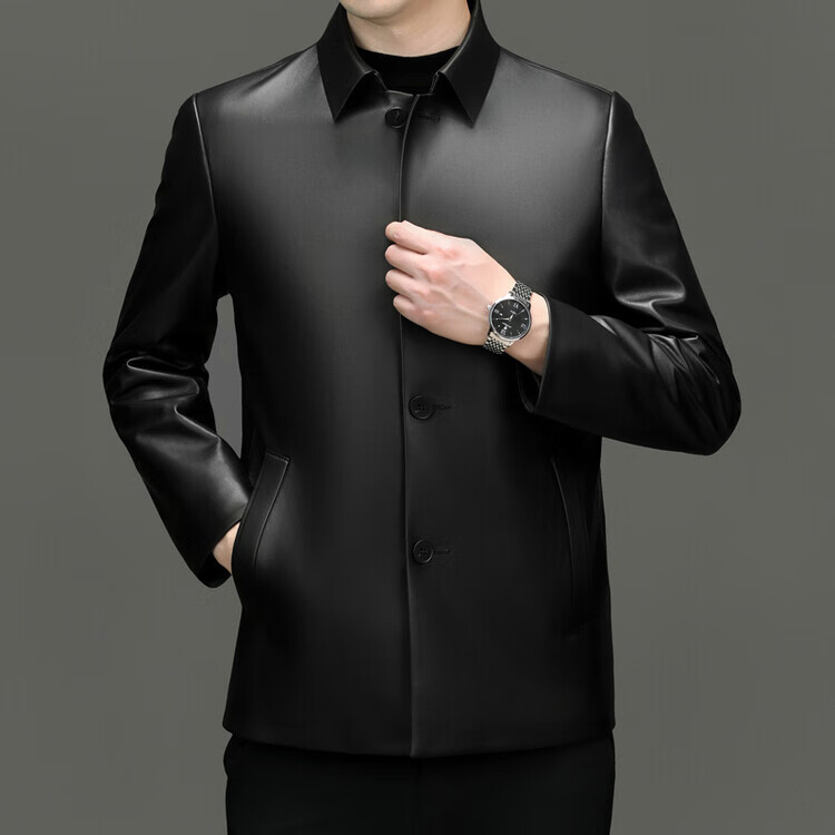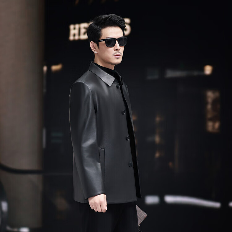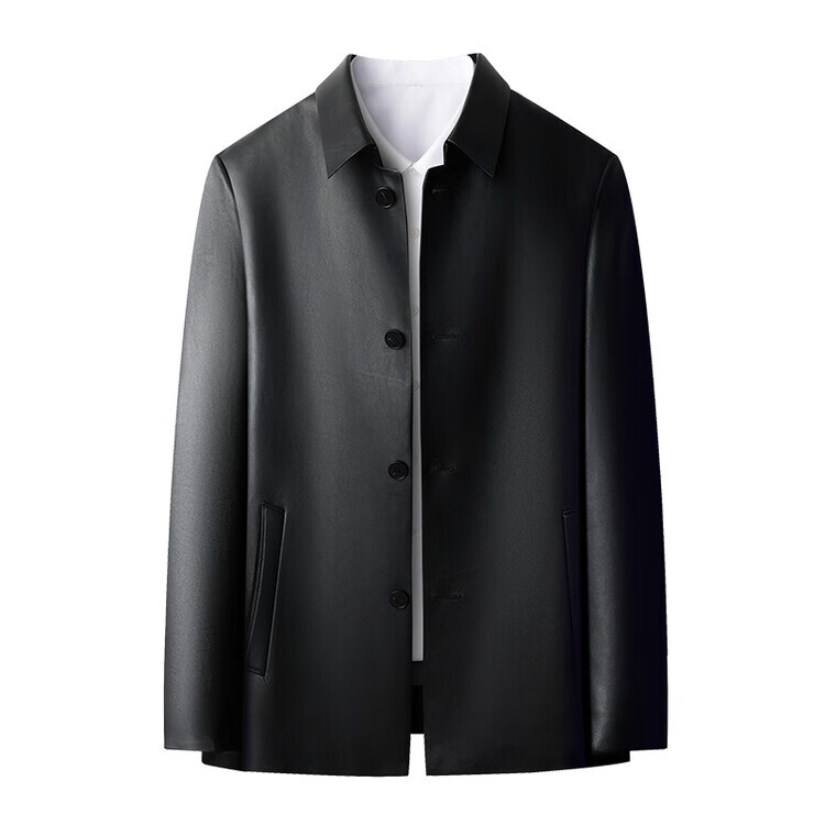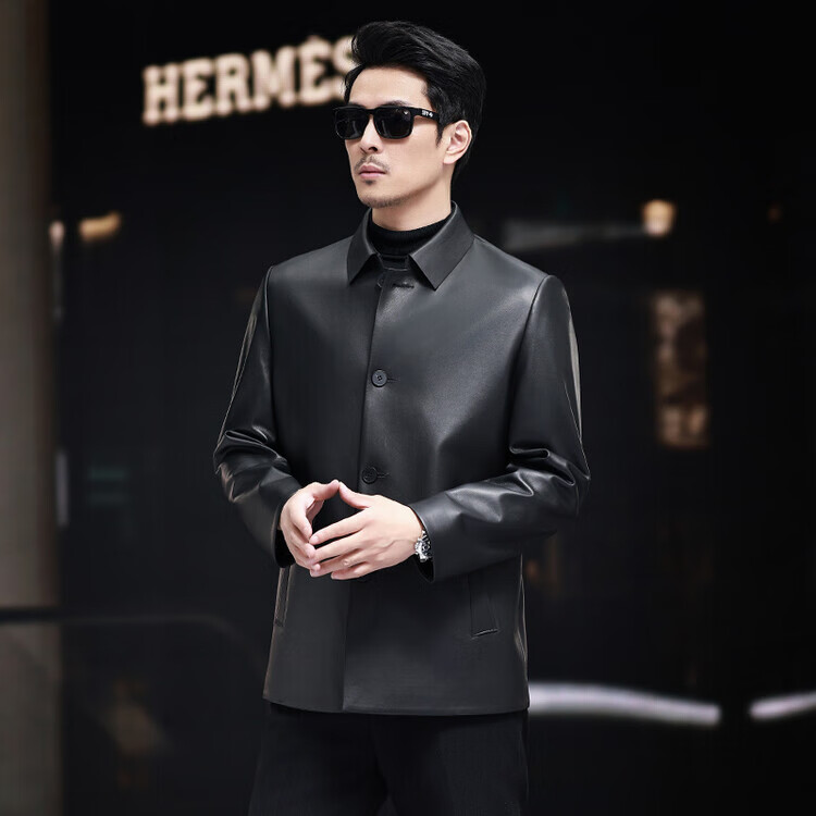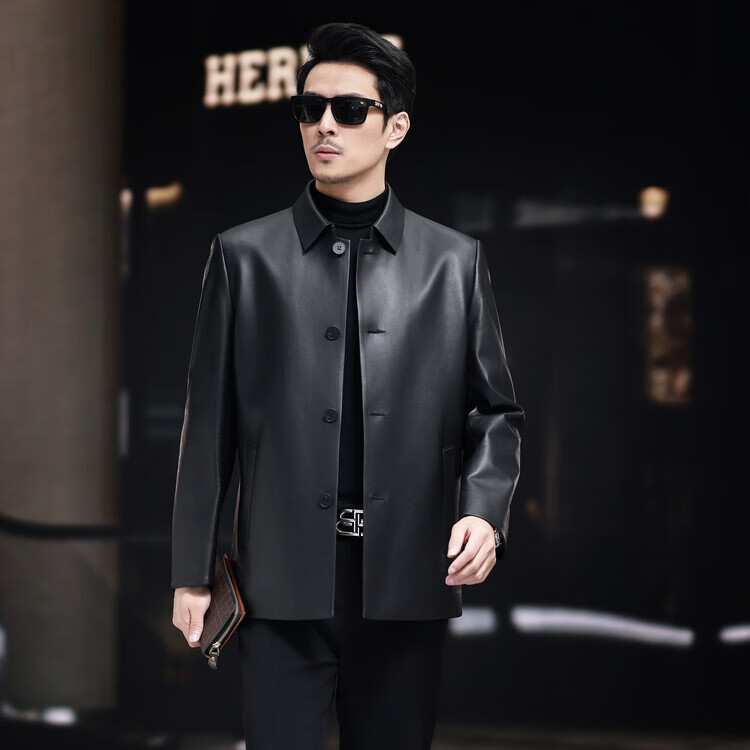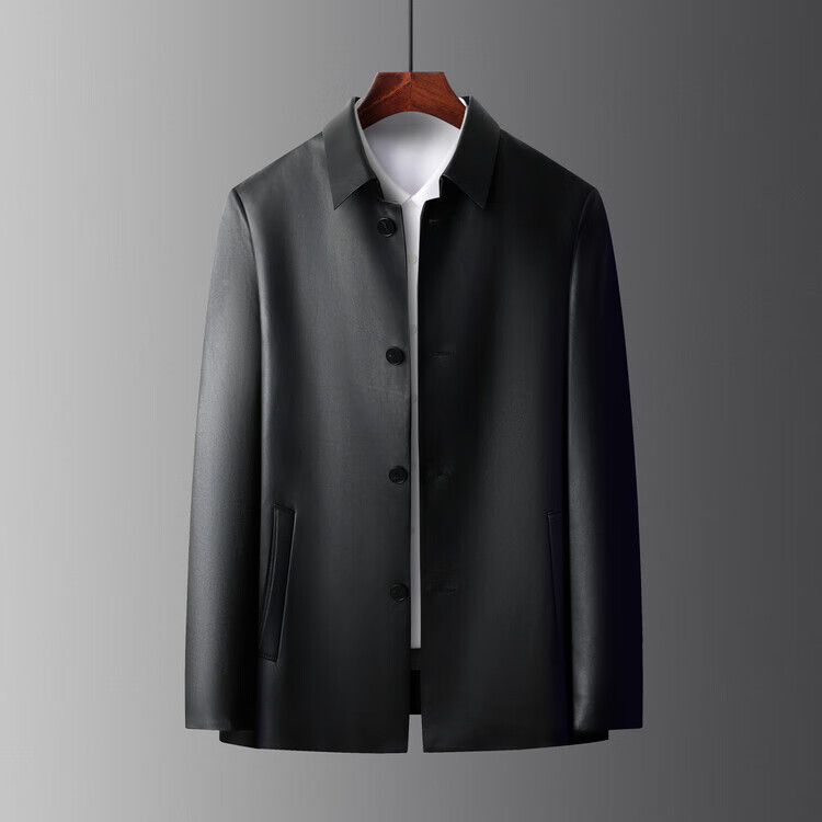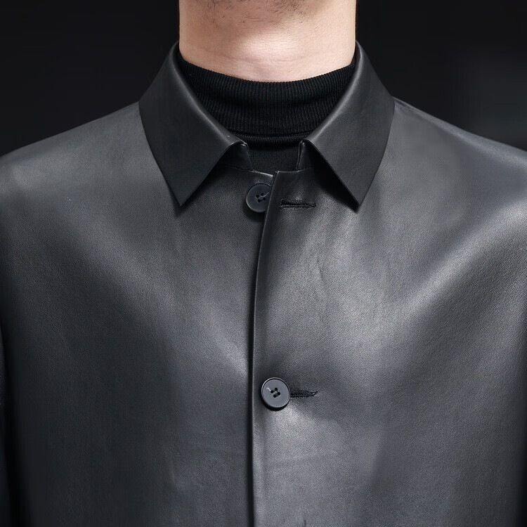 恒源祥春秋海宁真皮皮衣男皮夹克绵羊皮中长款外套薄款翻领风衣加绒加厚 黑色 XL 180