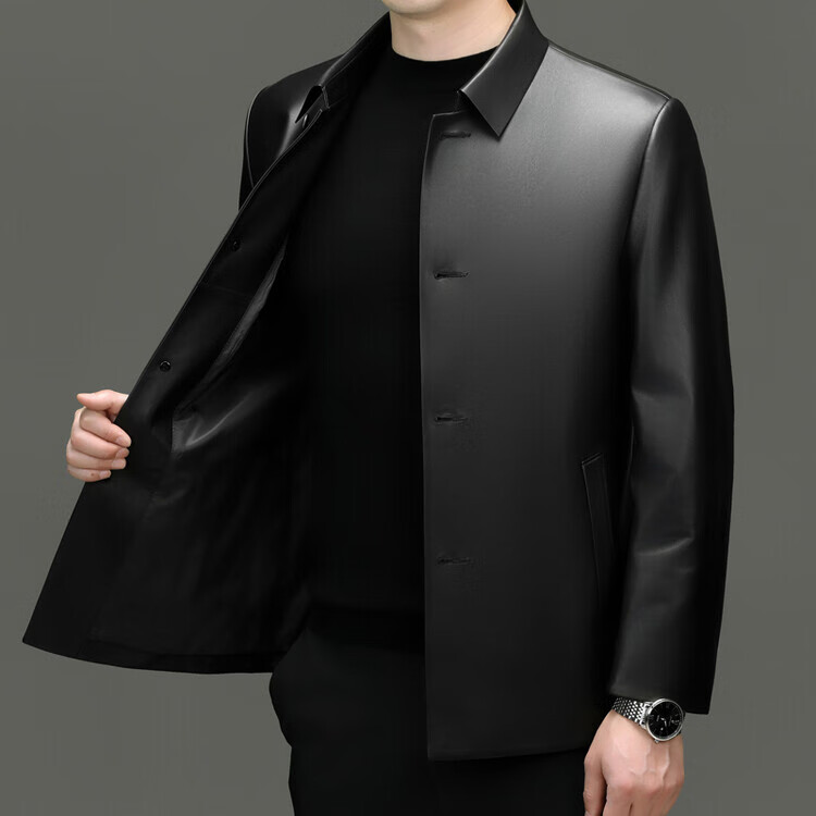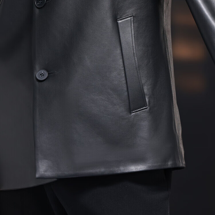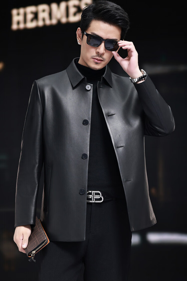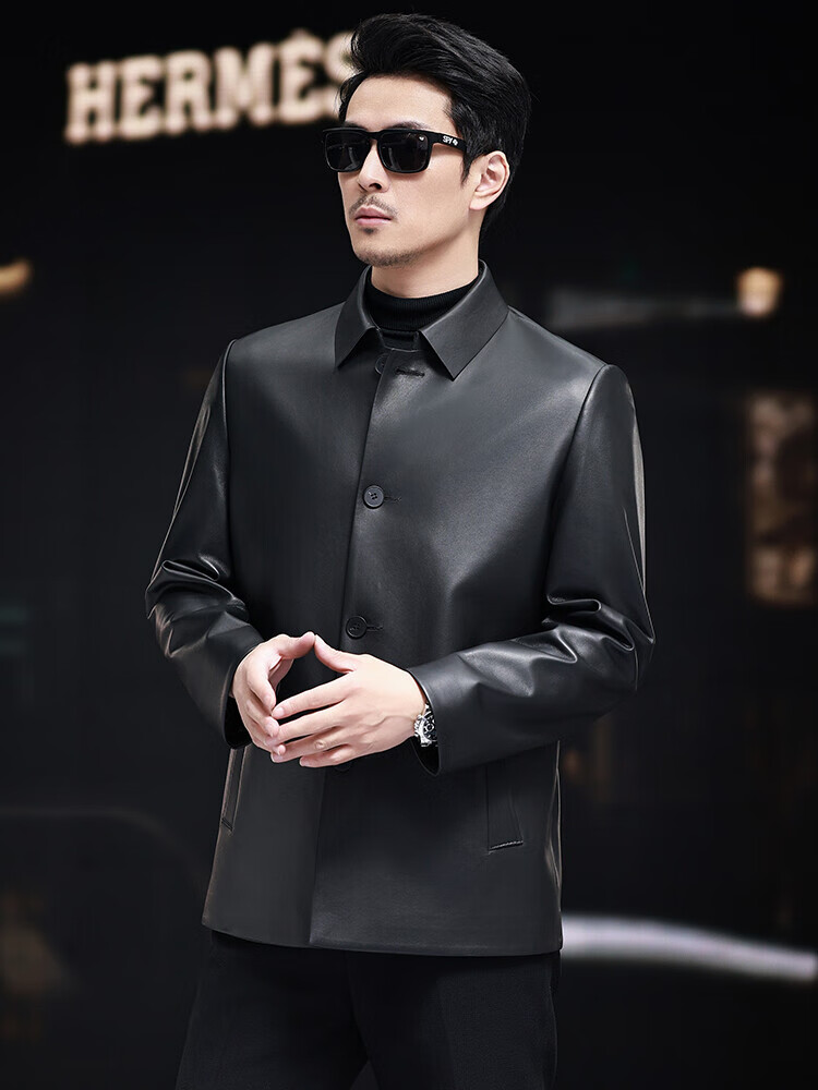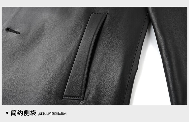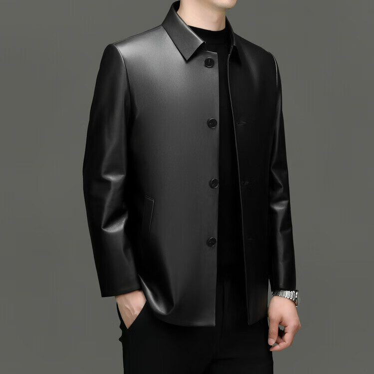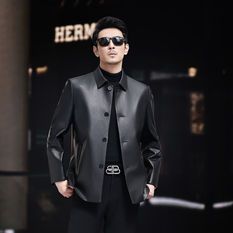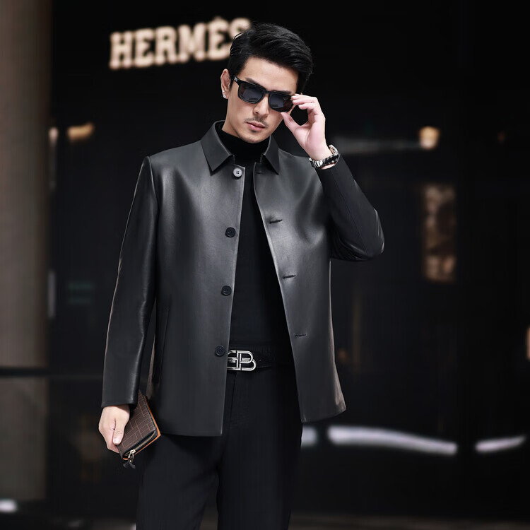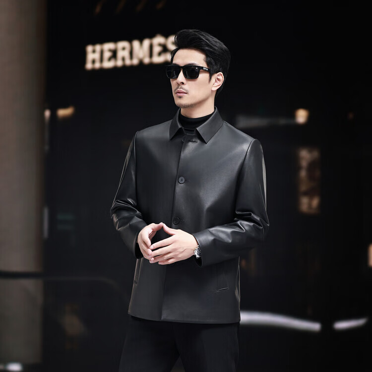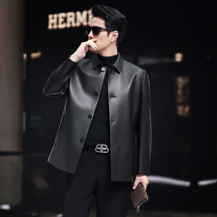恒源祥春秋海宁真皮皮衣男皮夹克绵羊皮中长款外套薄款翻领风衣加绒加厚 黑色 XL 180