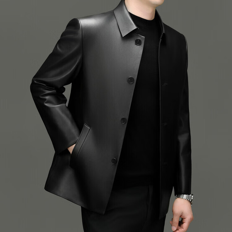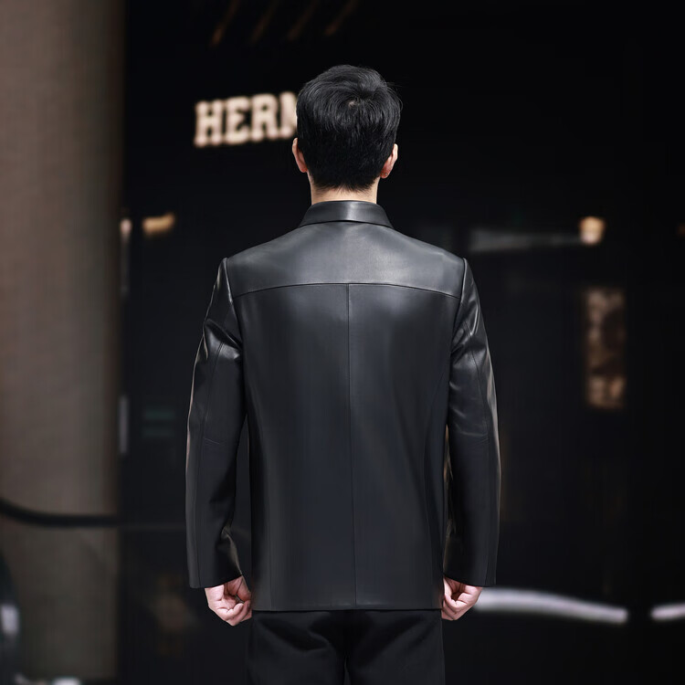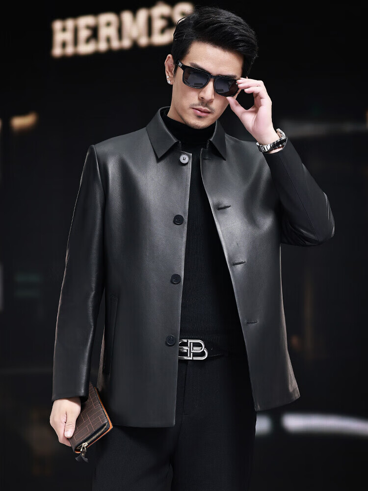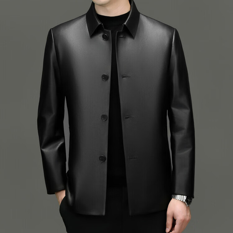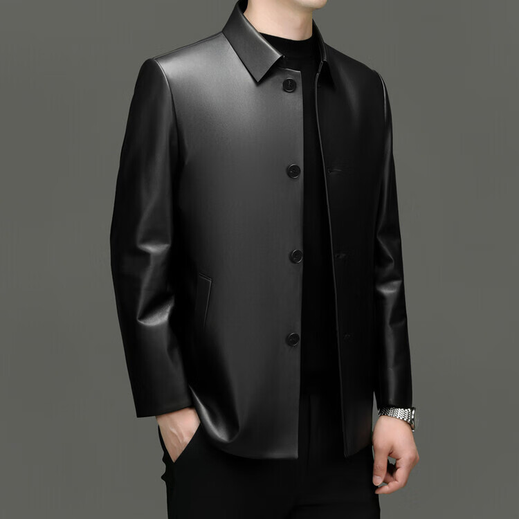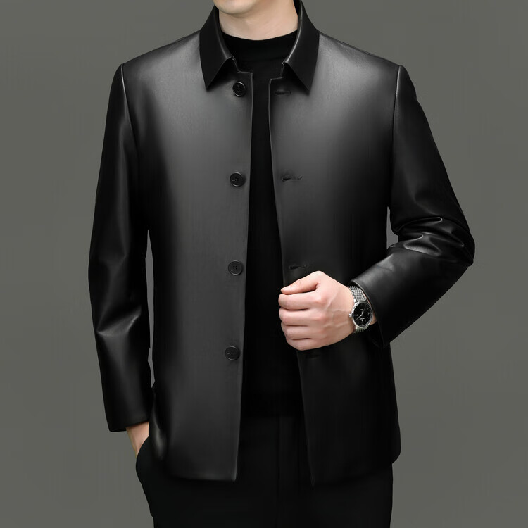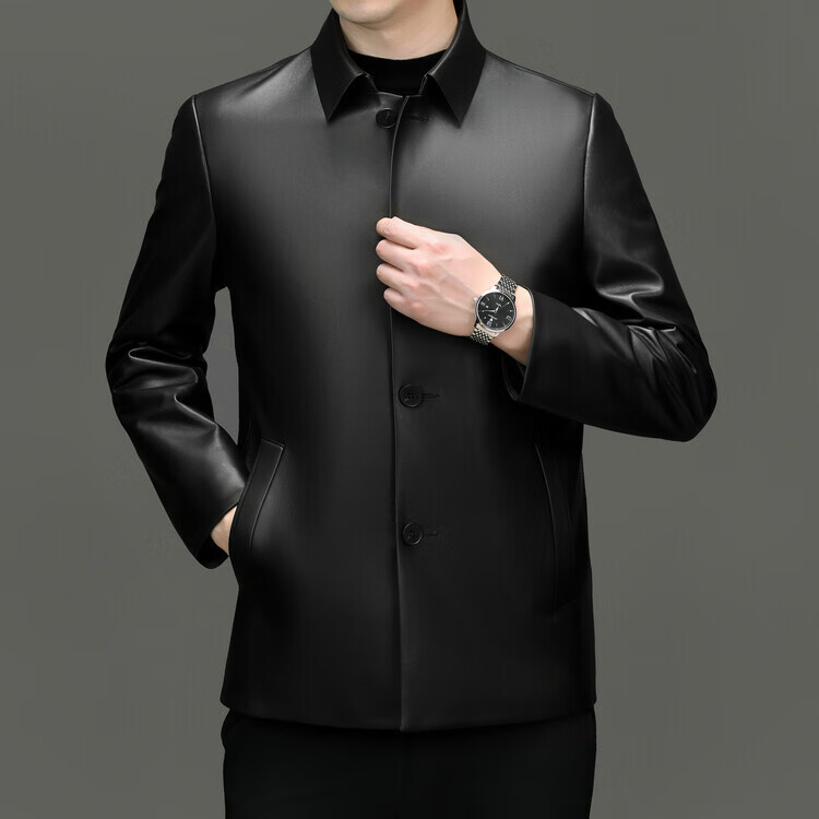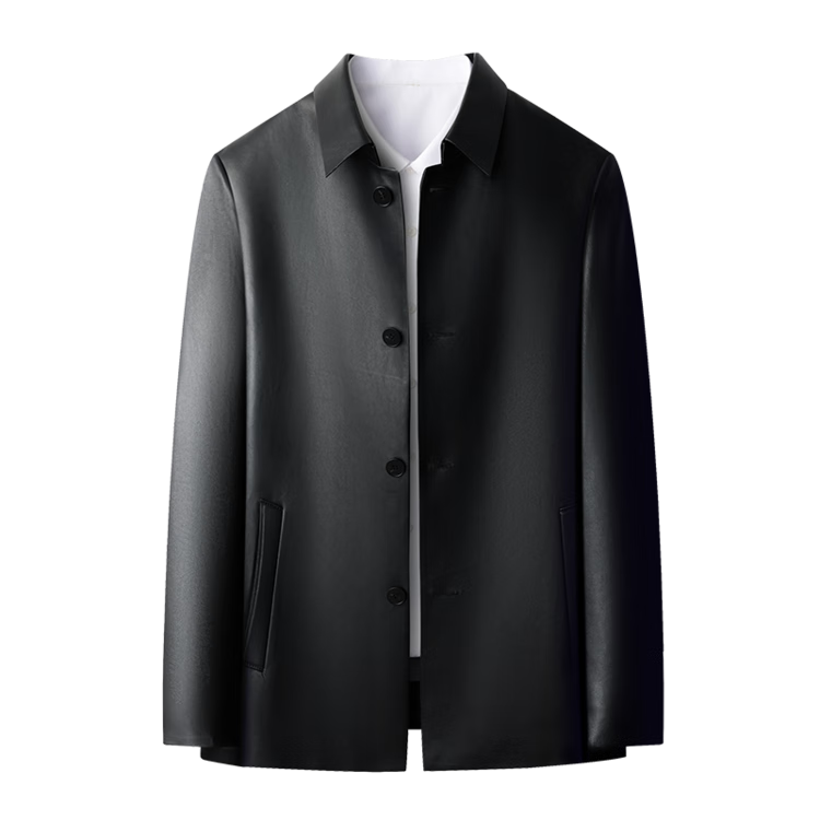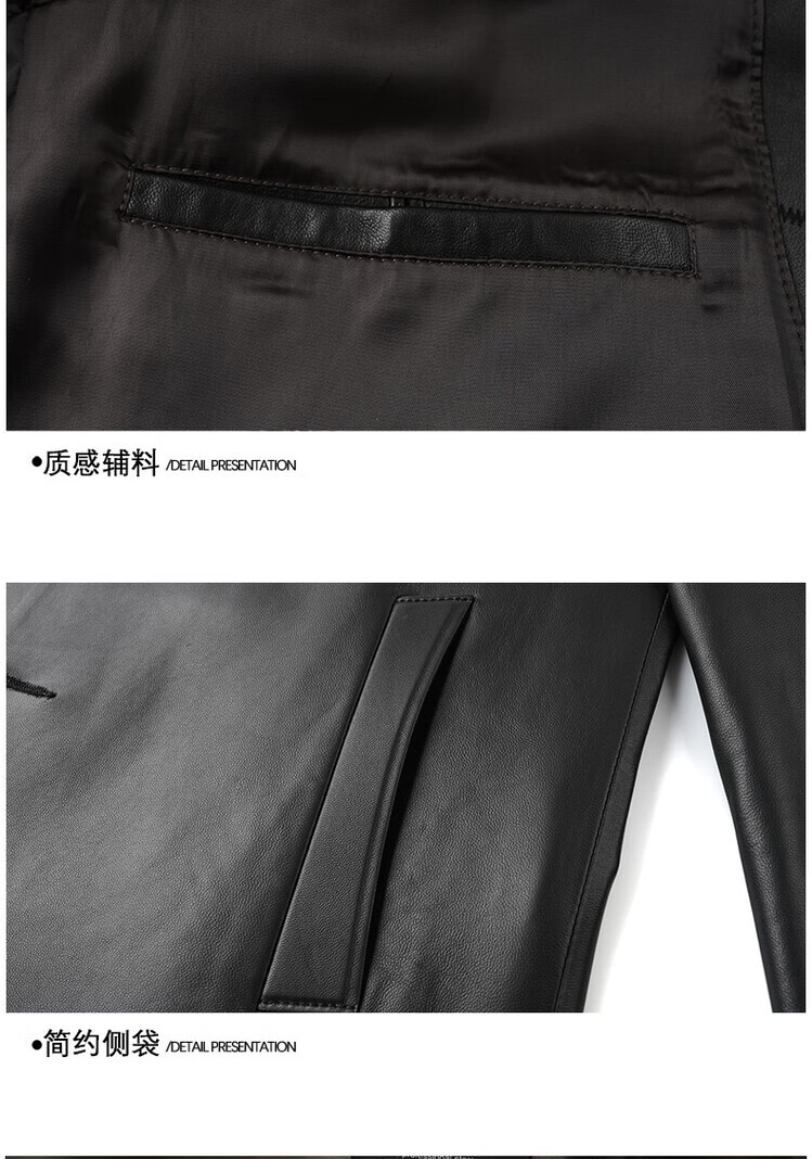 恒源祥春秋海宁真皮皮衣男皮夹克绵羊皮中长款外套薄款翻领风衣加绒加厚 黑色 XL 180