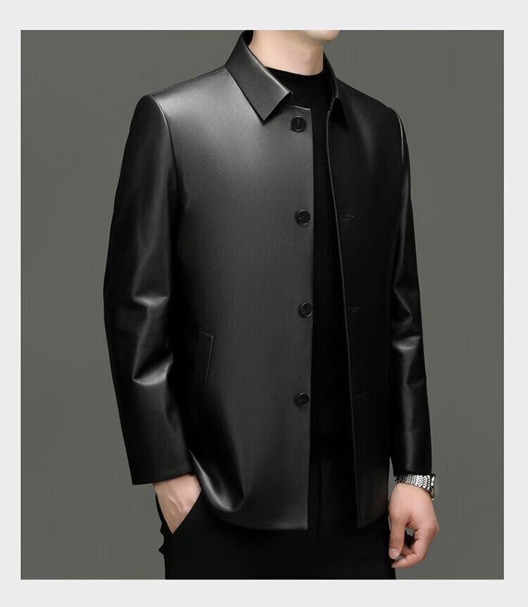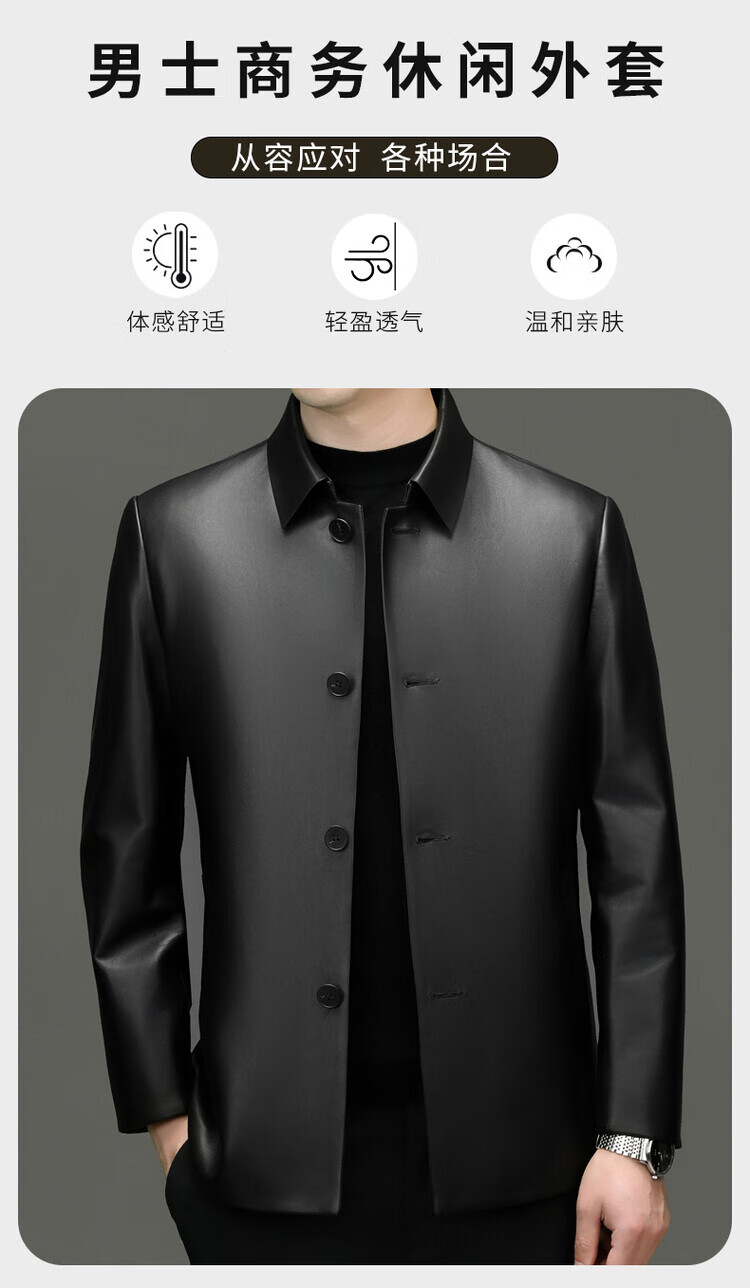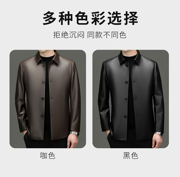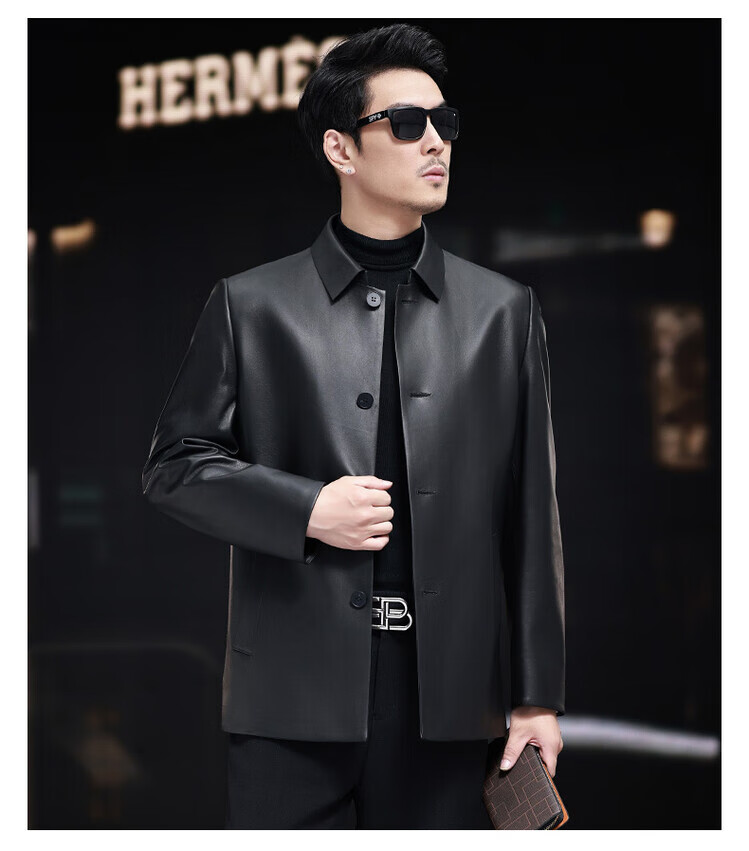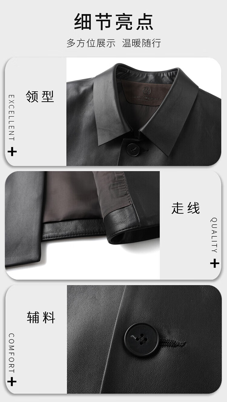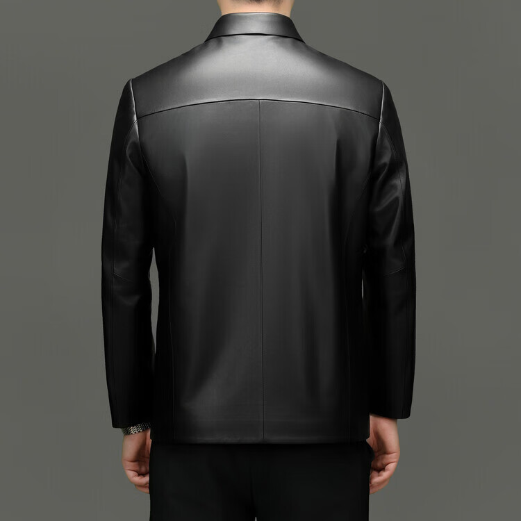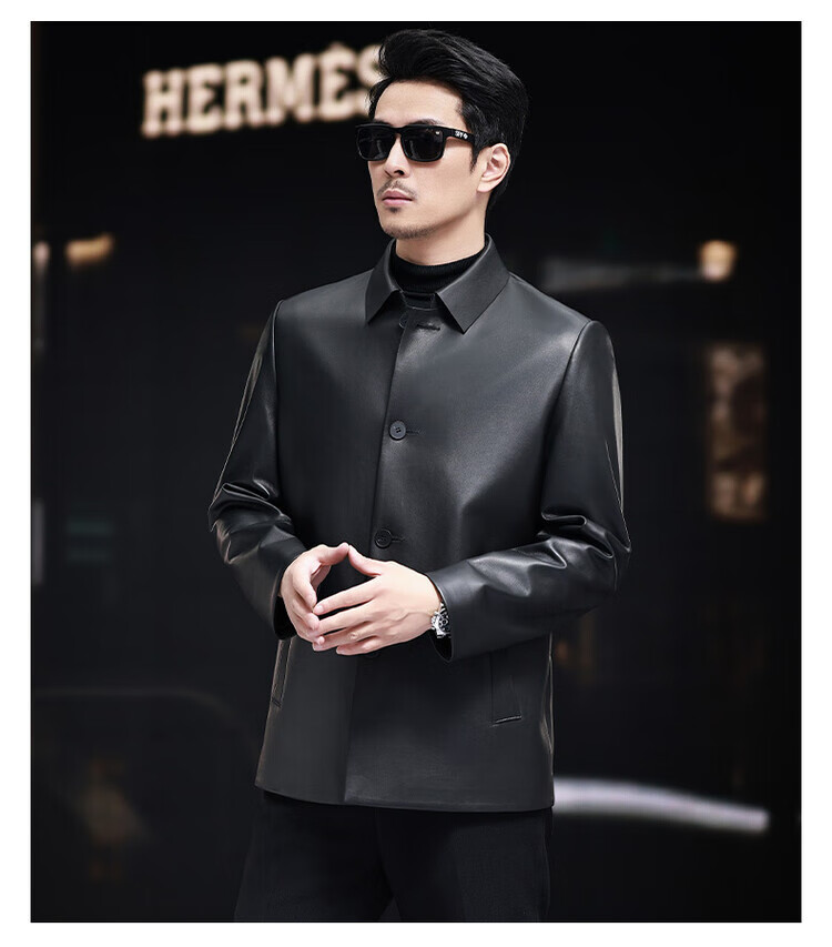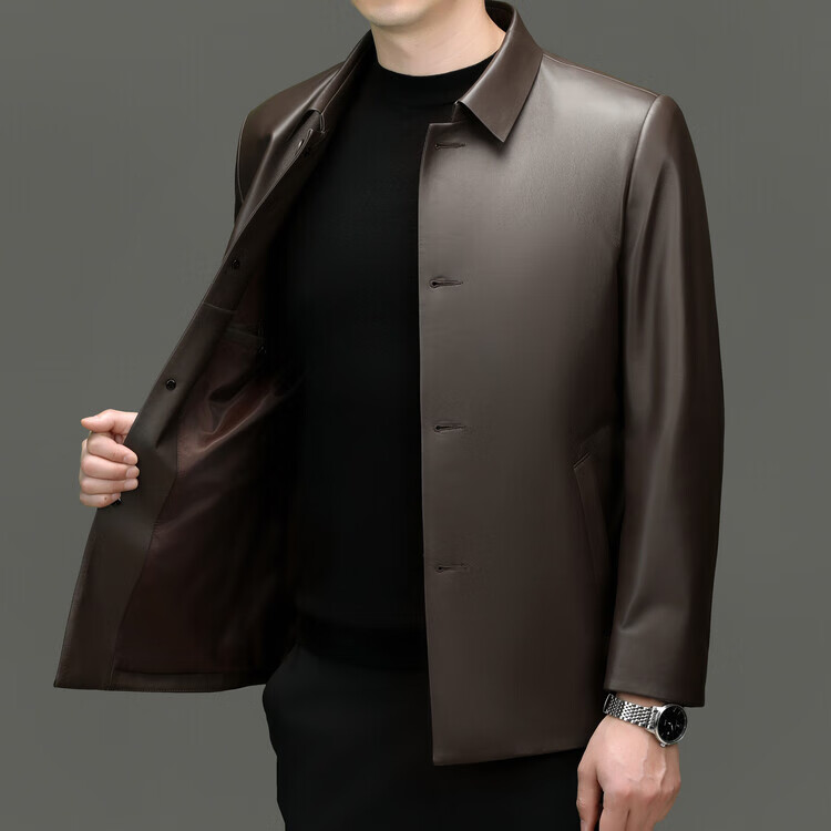恒源祥春秋海宁真皮皮衣男皮夹克绵羊皮中长款外套薄款翻领风衣加绒加厚 黑色 XL 180