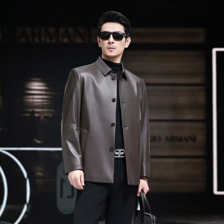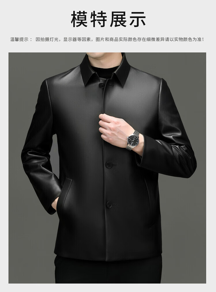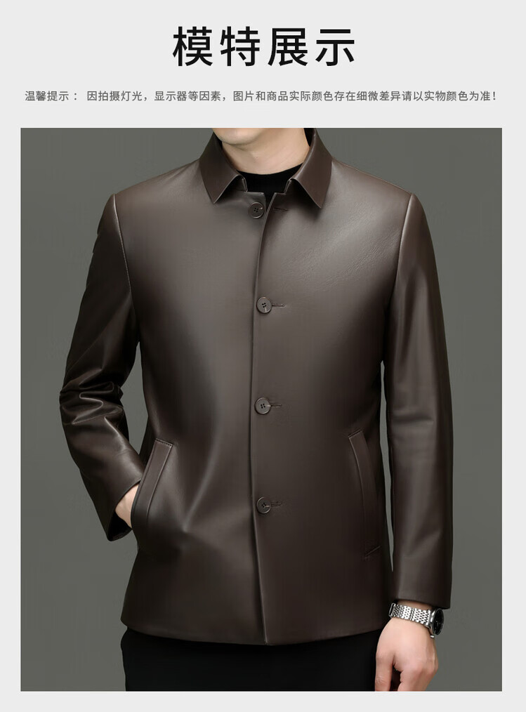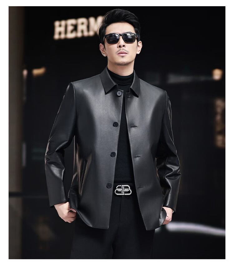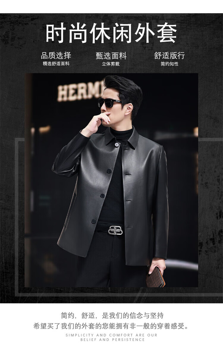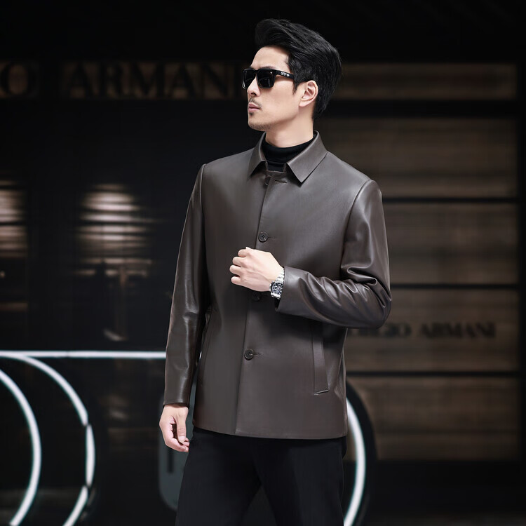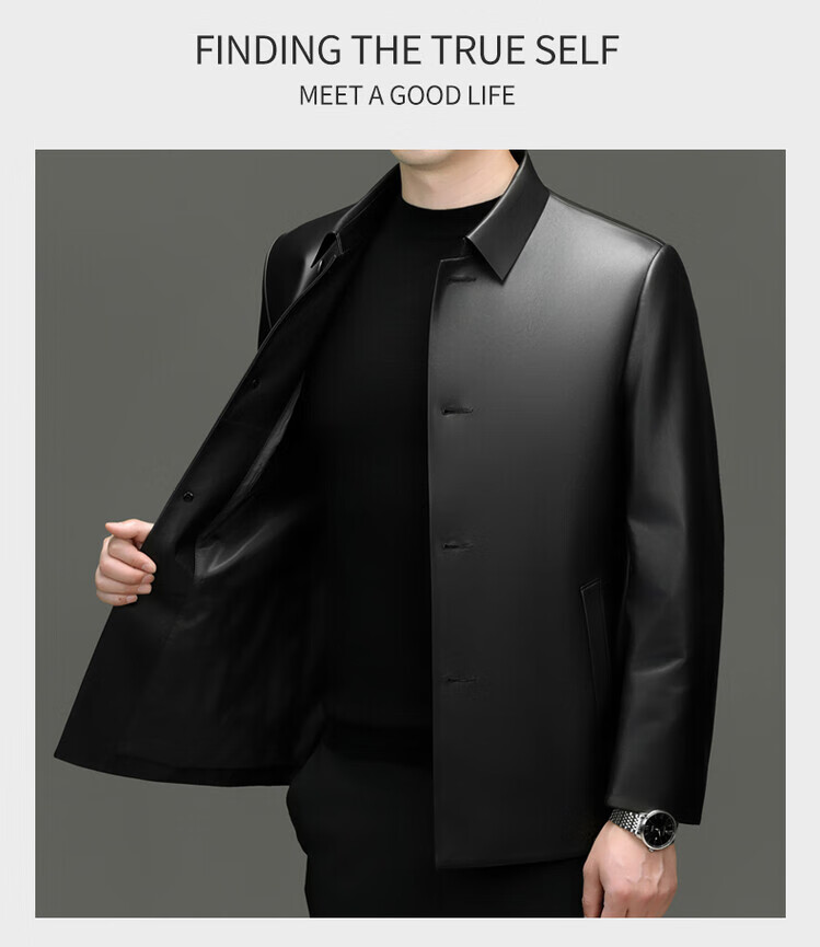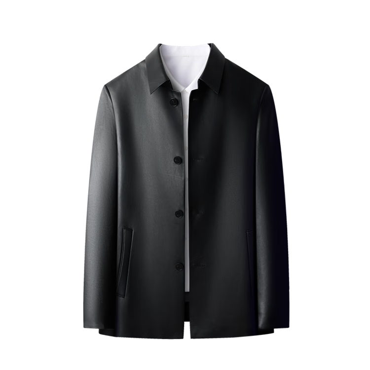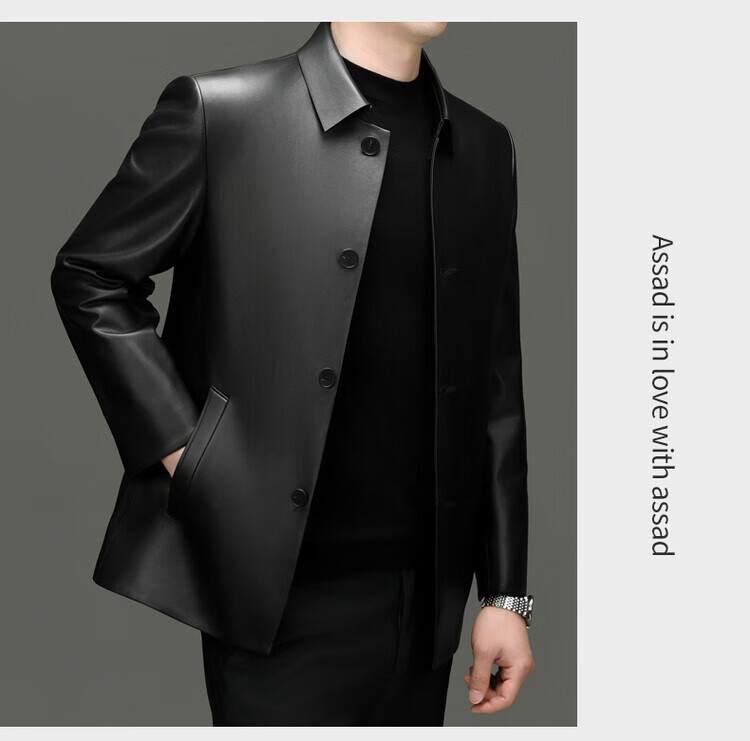 恒源祥春秋海宁真皮皮衣男皮夹克绵羊皮中长款外套薄款翻领风衣加绒加厚 黑色 XL 180