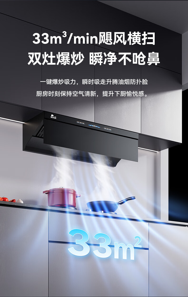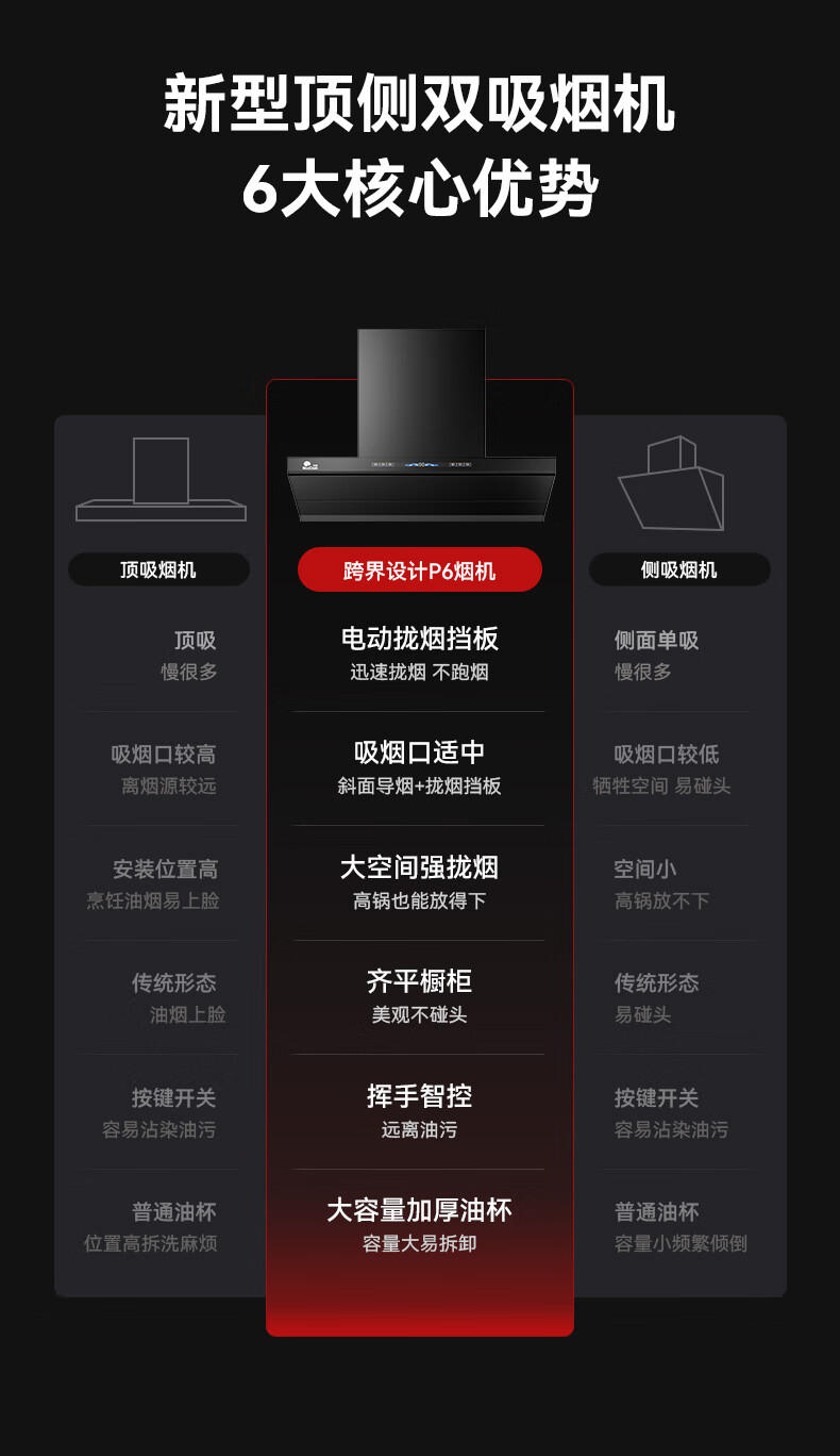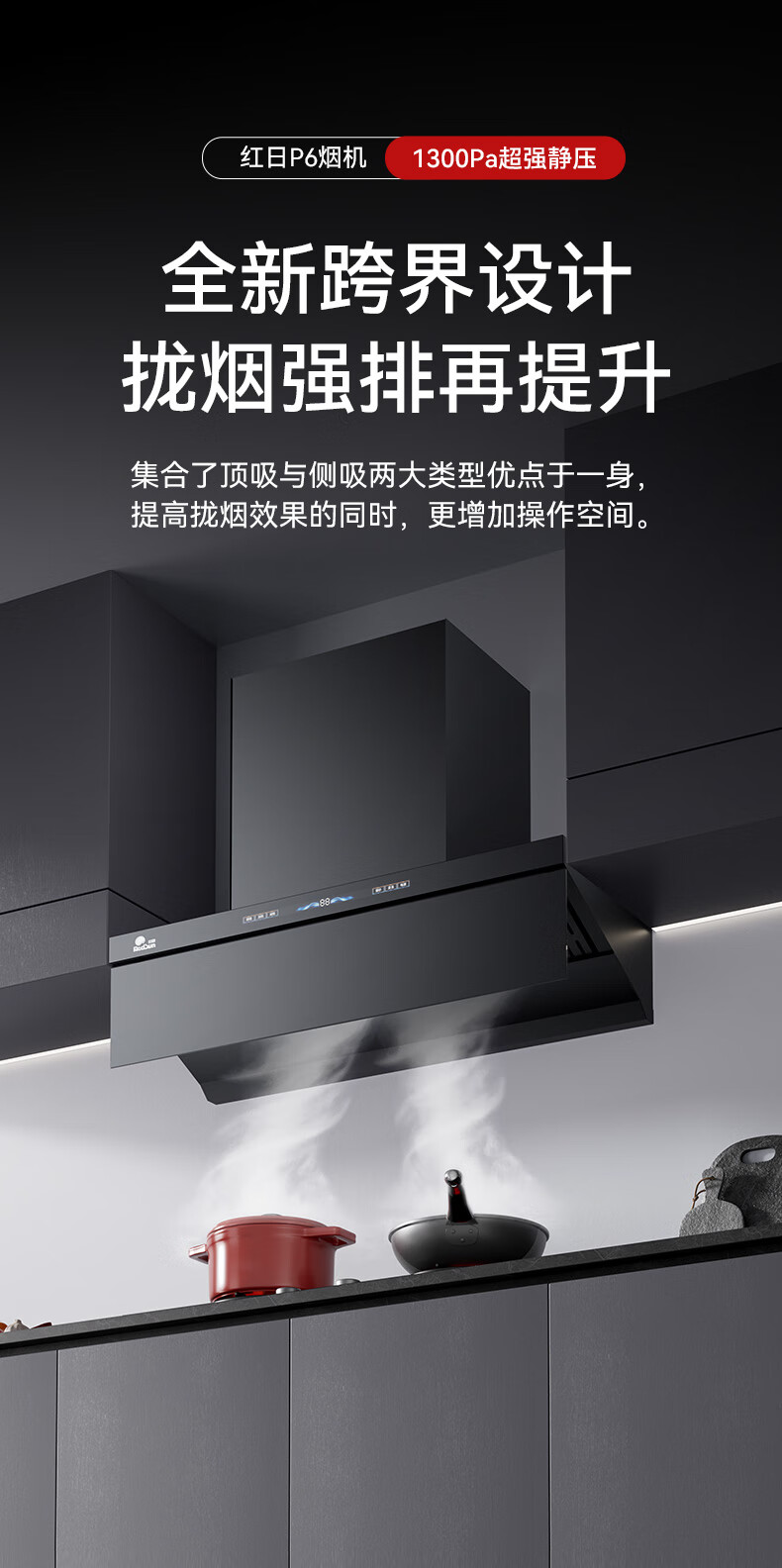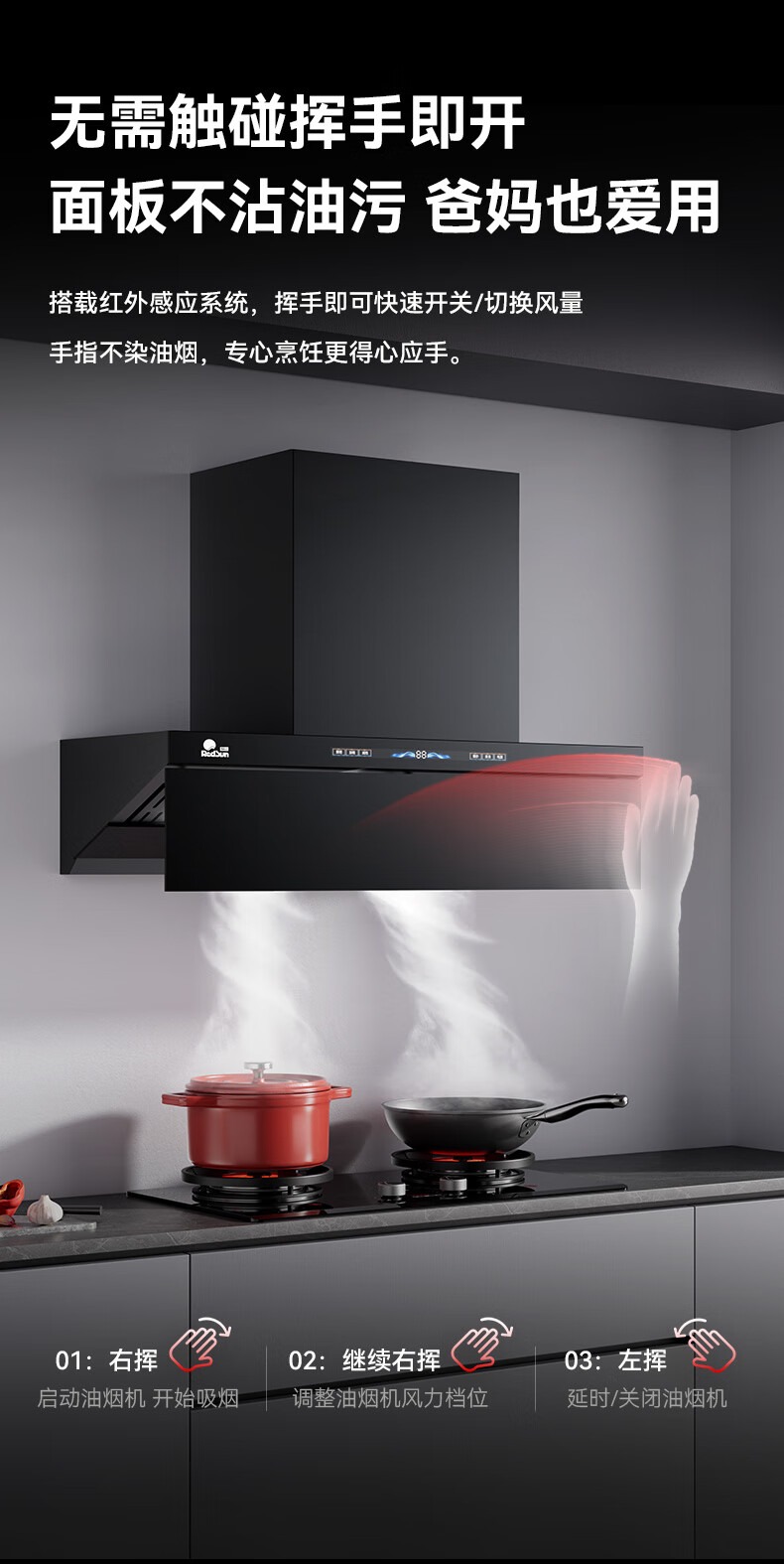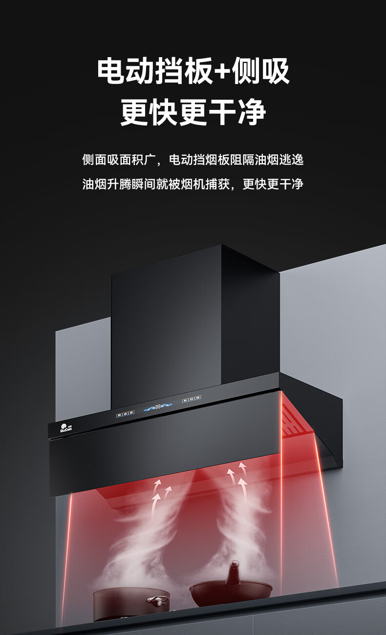 RedSun挥手触摸体感双控直流变频铜线电机33m³澎湃大吸力P6热除油清洗1300pa静压顶侧双吸抽油烟机 P6+70%高热效率免改孔定时聚能红外灶DX20 天然气