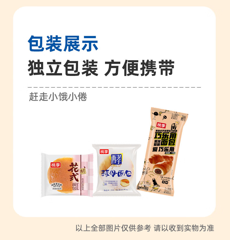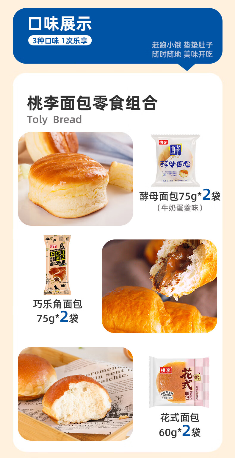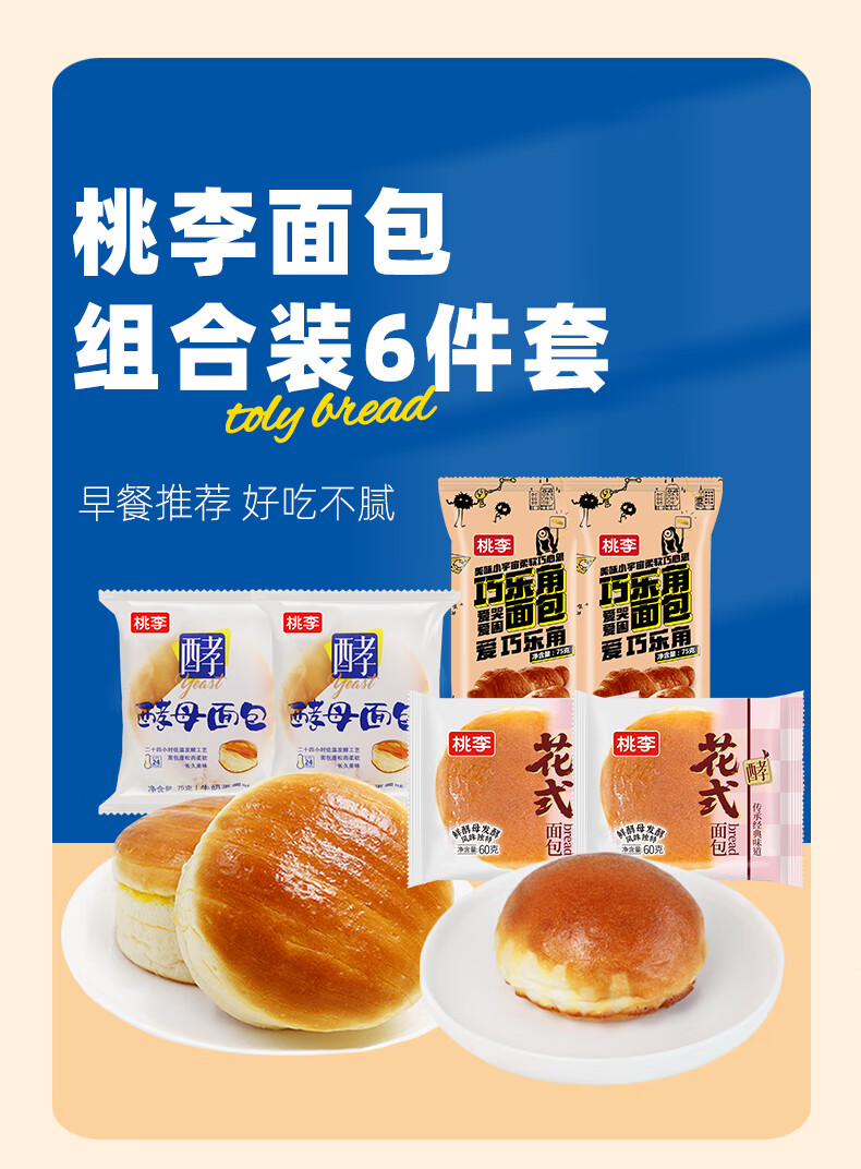桃李面包 组合装共420g 营养早餐食品手撕面包办公室零食 酵母2袋+巧乐角2袋+花式2袋