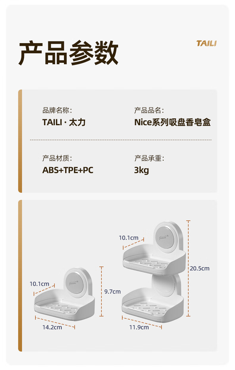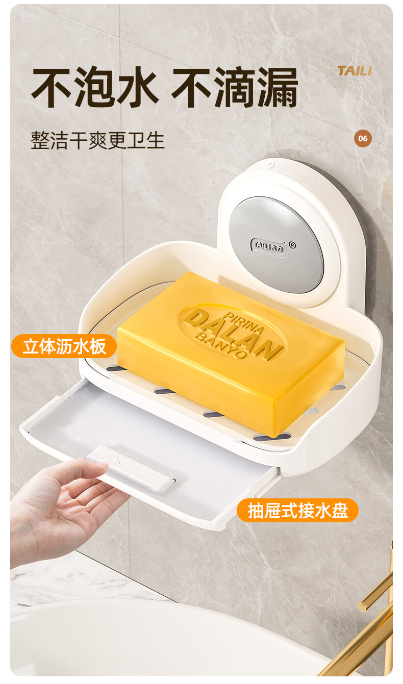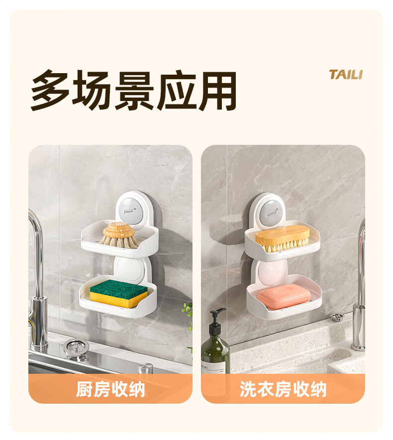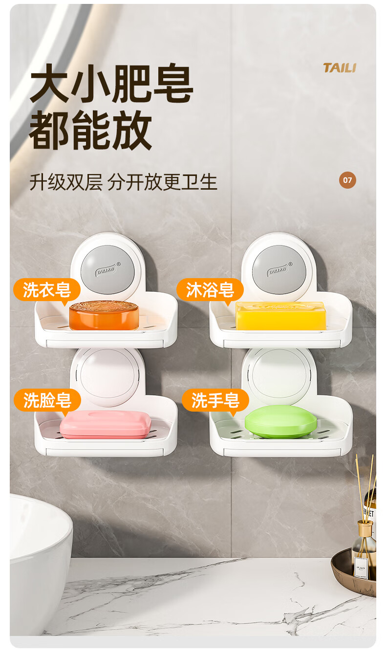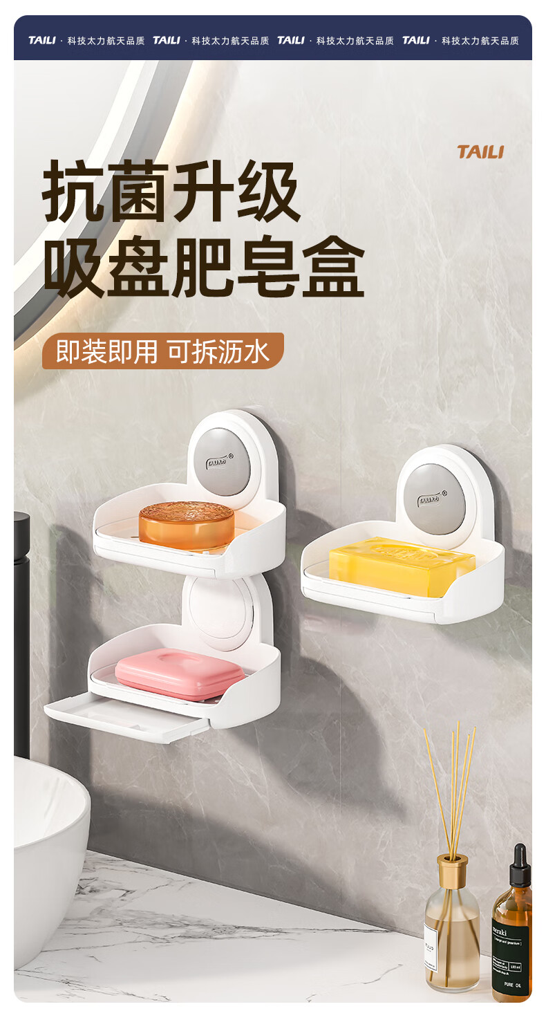 太力抗菌肥皂盒壁挂香皂盒二合一置物架沥水便携式浴室免打孔吸盘盒 灰白色双层【1个装】