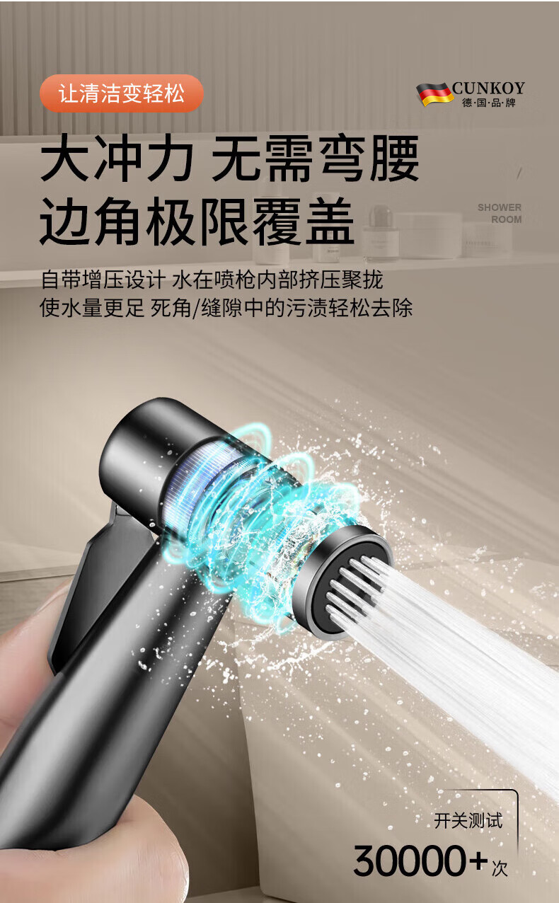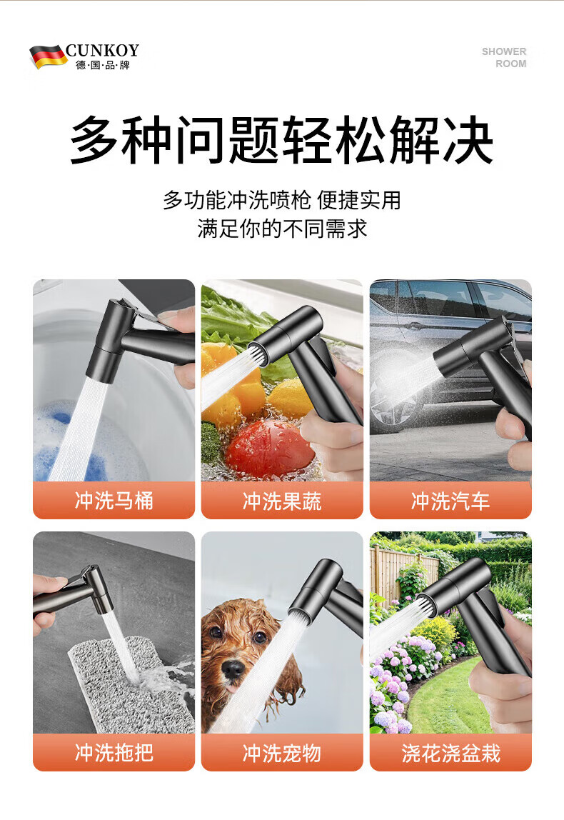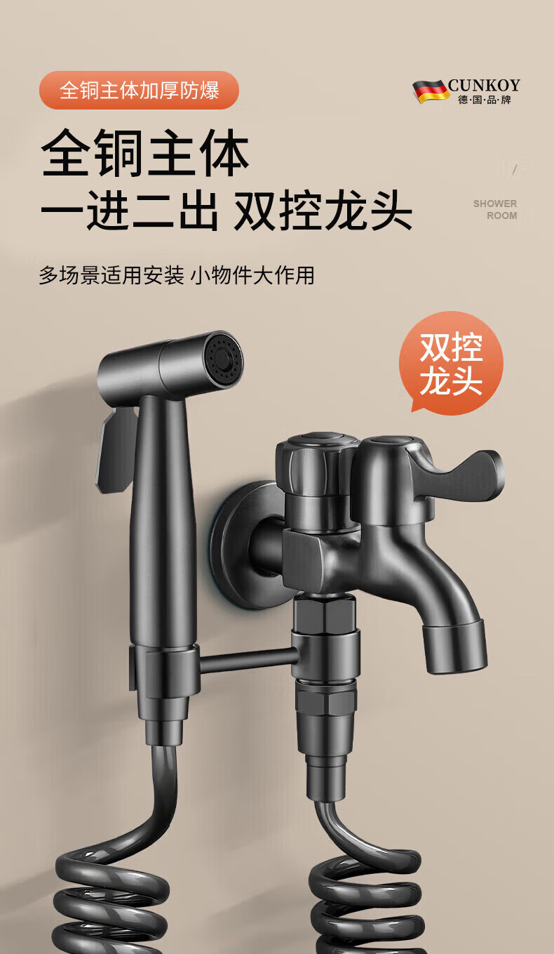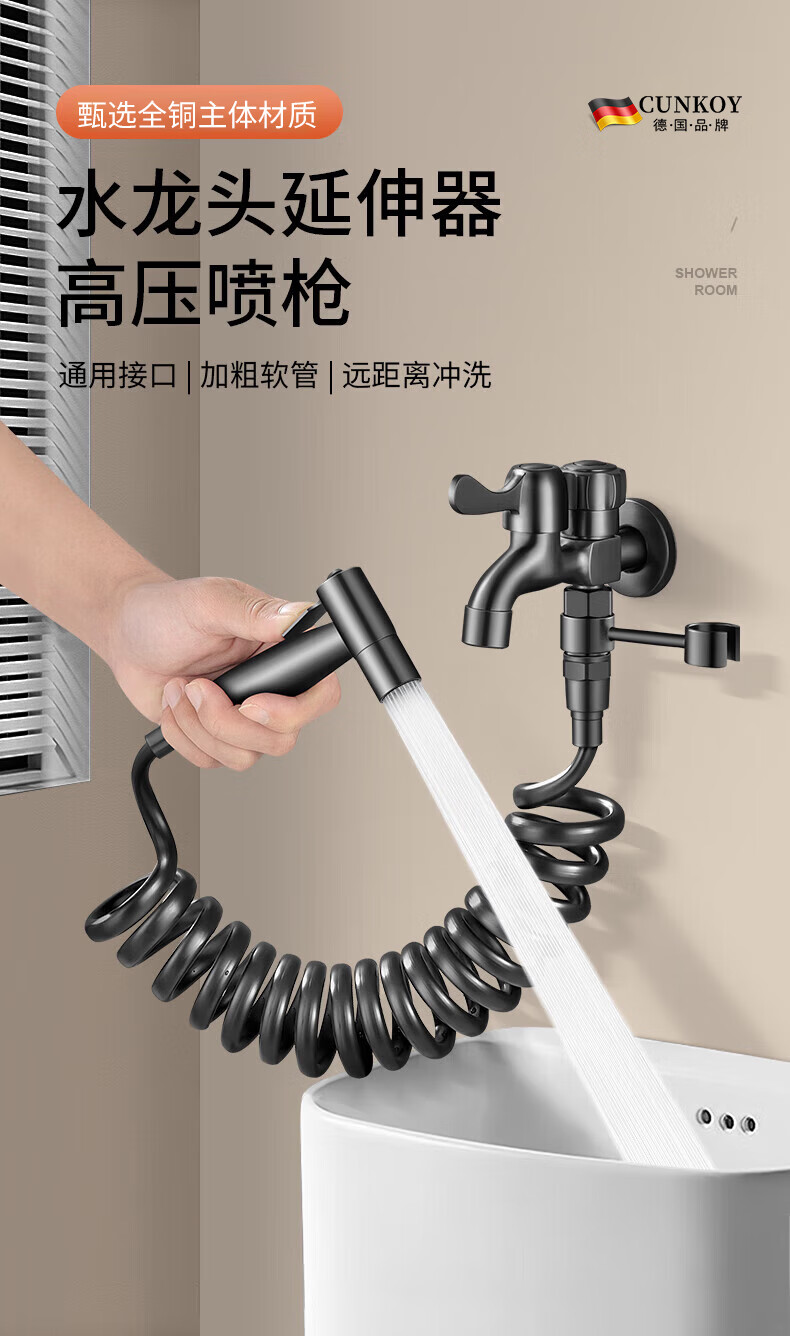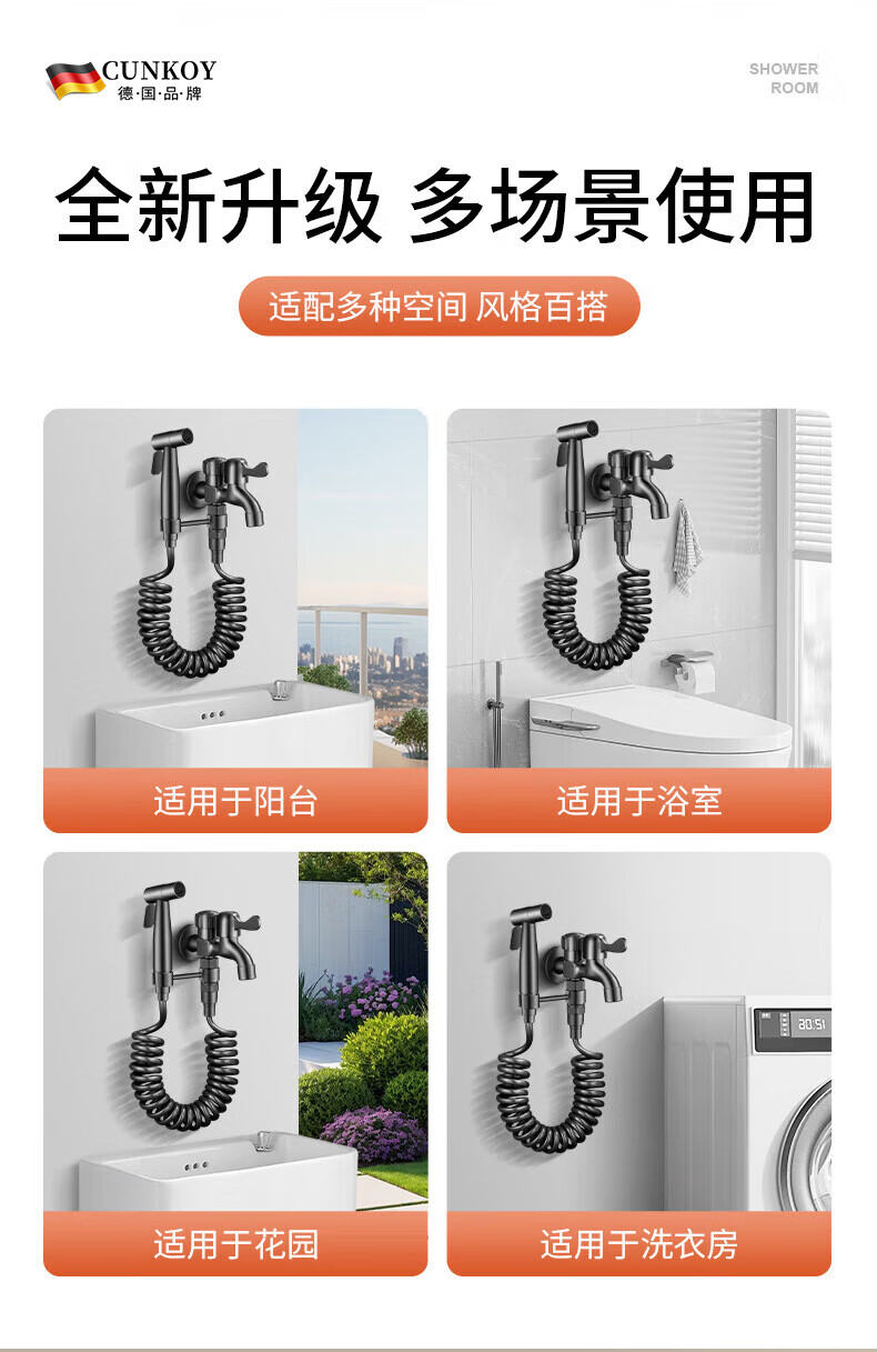 CUNKOY【德国】阳台拖把池水龙头带喷枪一进二出全铜龙头卫生间高压喷枪 枪灰丨全铜三件套+3m伸缩管 全铜主体丨独立双控丨304喷枪