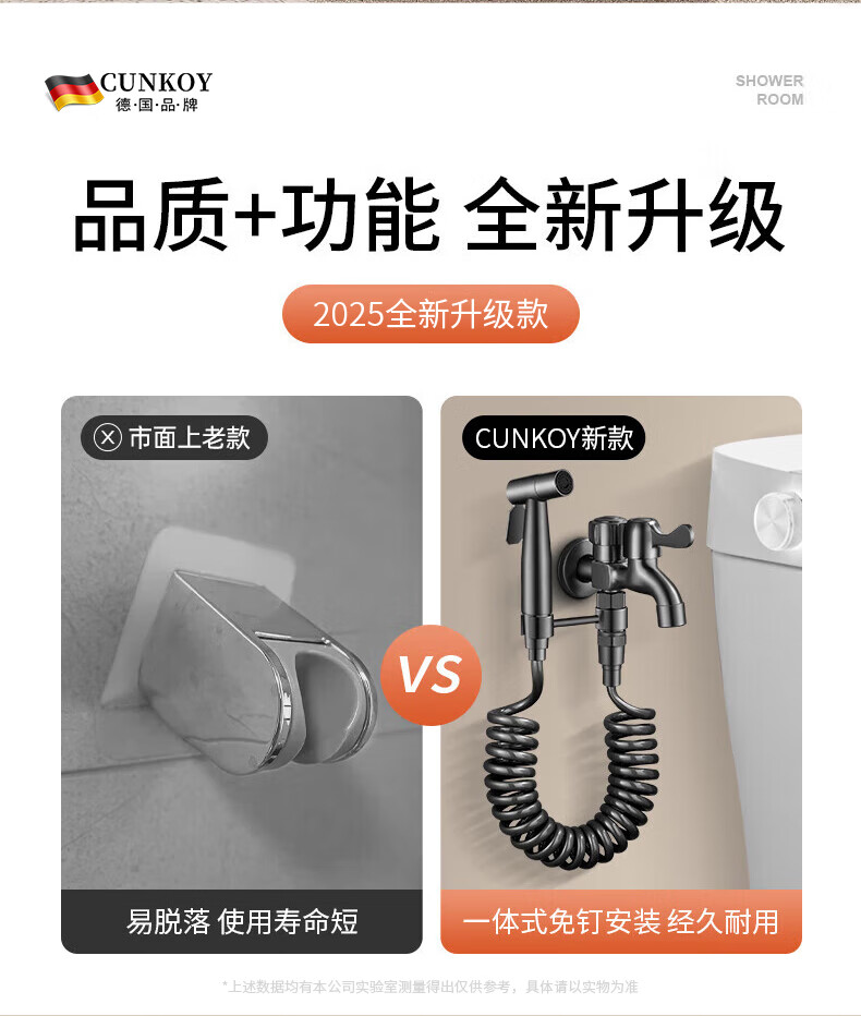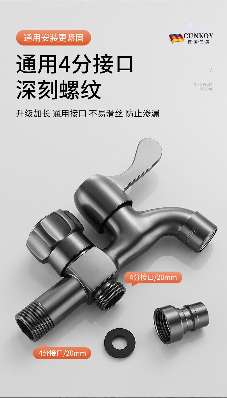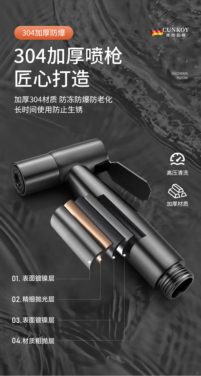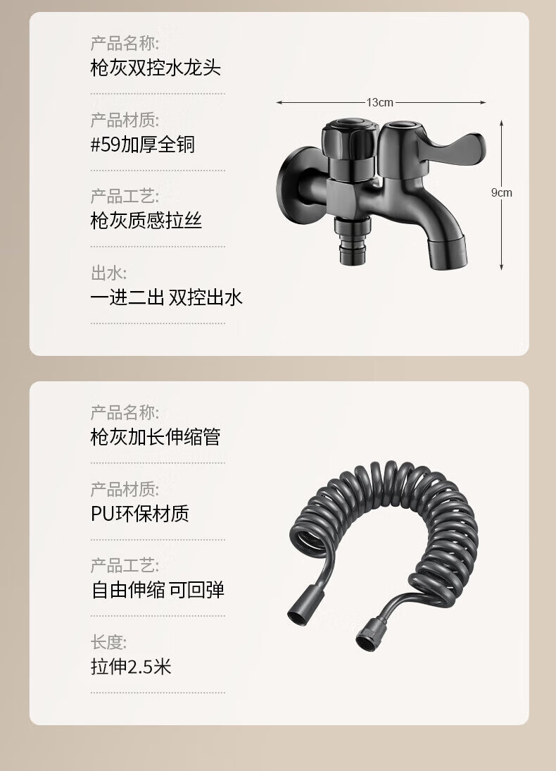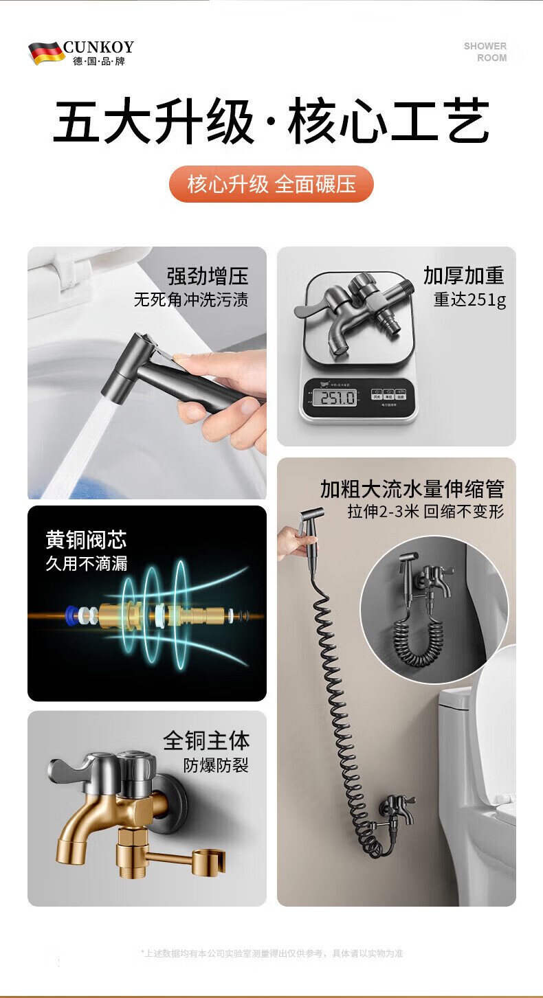 CUNKOY【德国】阳台拖把池水龙头带喷枪一进二出全铜龙头卫生间高压喷枪 枪灰丨全铜三件套+3m伸缩管 全铜主体丨独立双控丨304喷枪