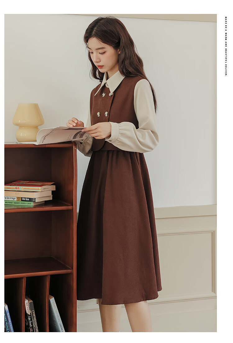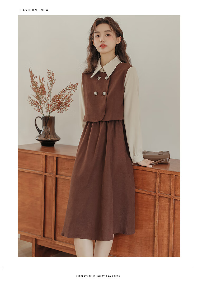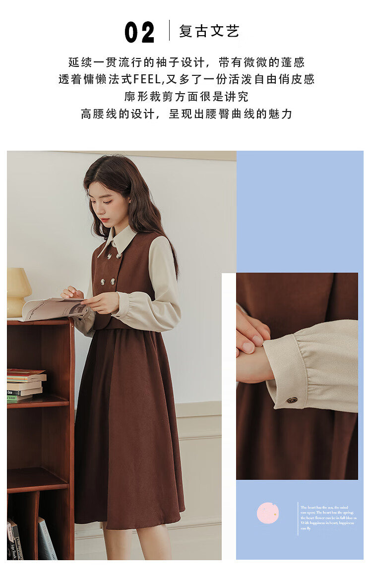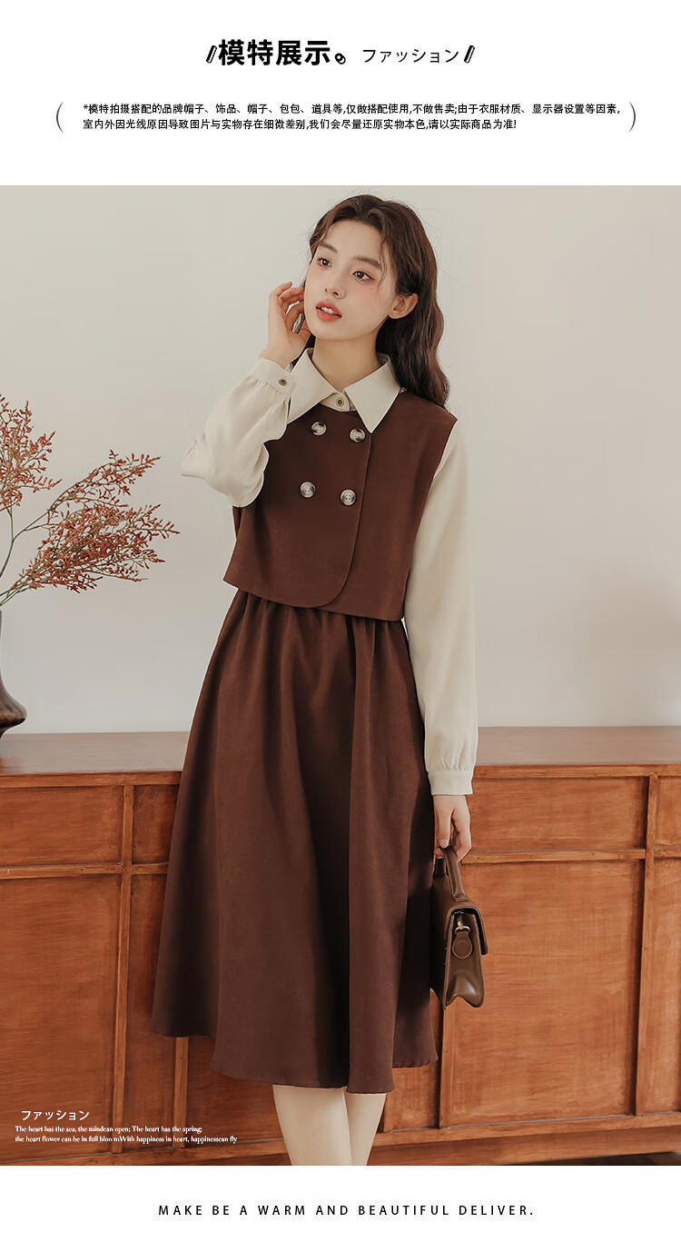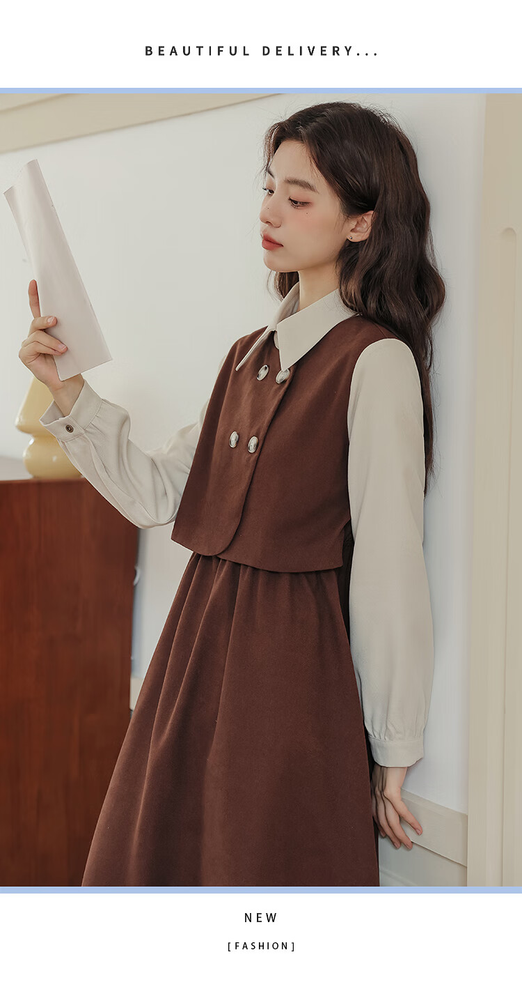 西遇(Westlink)西遇收腰长袖连衣裙女2025年秋季新款复古文艺衬衫领假两件中长裙 棕色 (预售15天) XL (170)