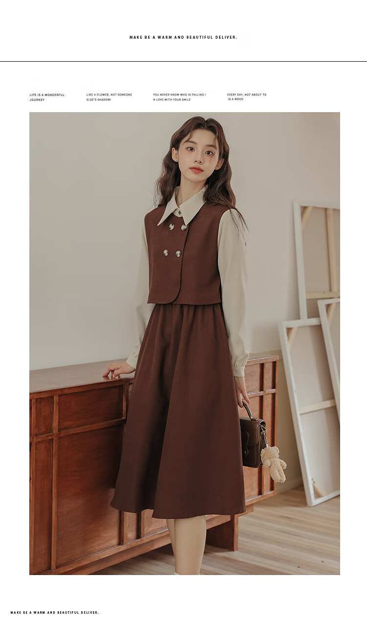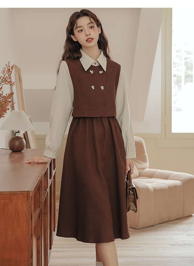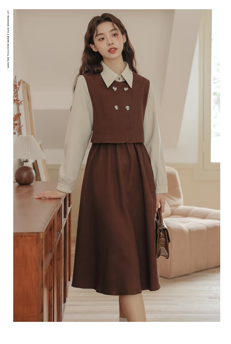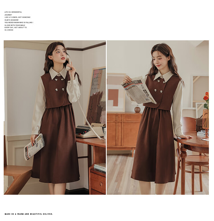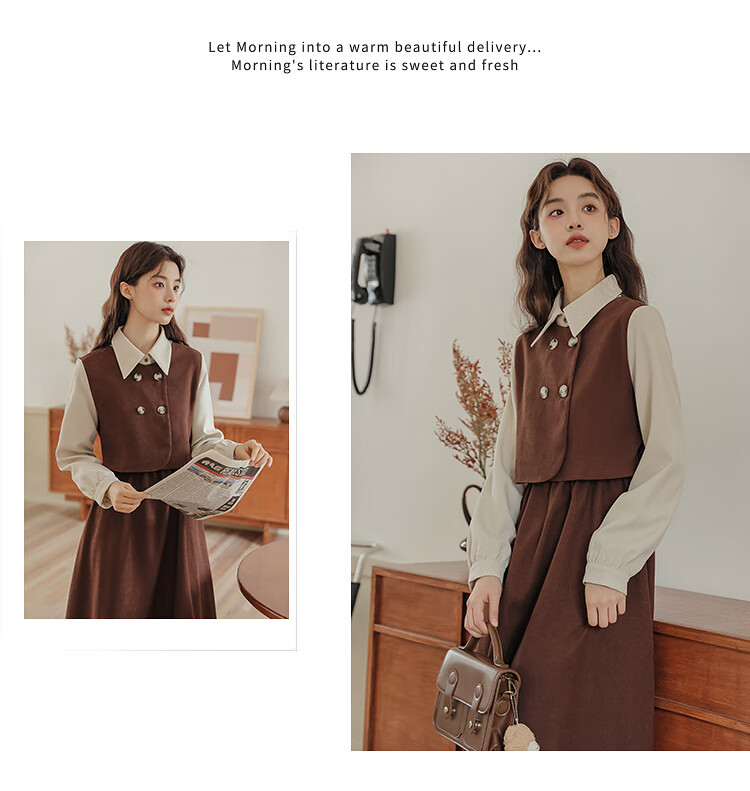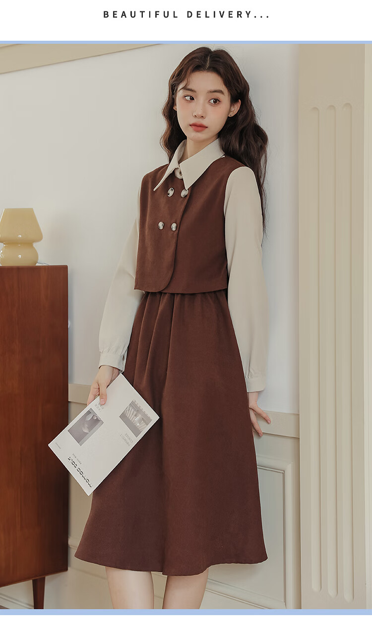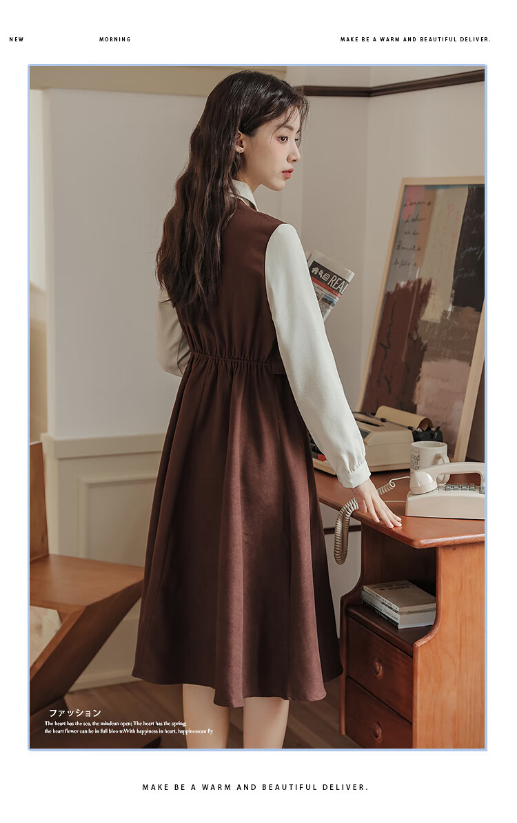 西遇(Westlink)西遇收腰长袖连衣裙女2025年秋季新款复古文艺衬衫领假两件中长裙 棕色 (预售15天) XL (170)