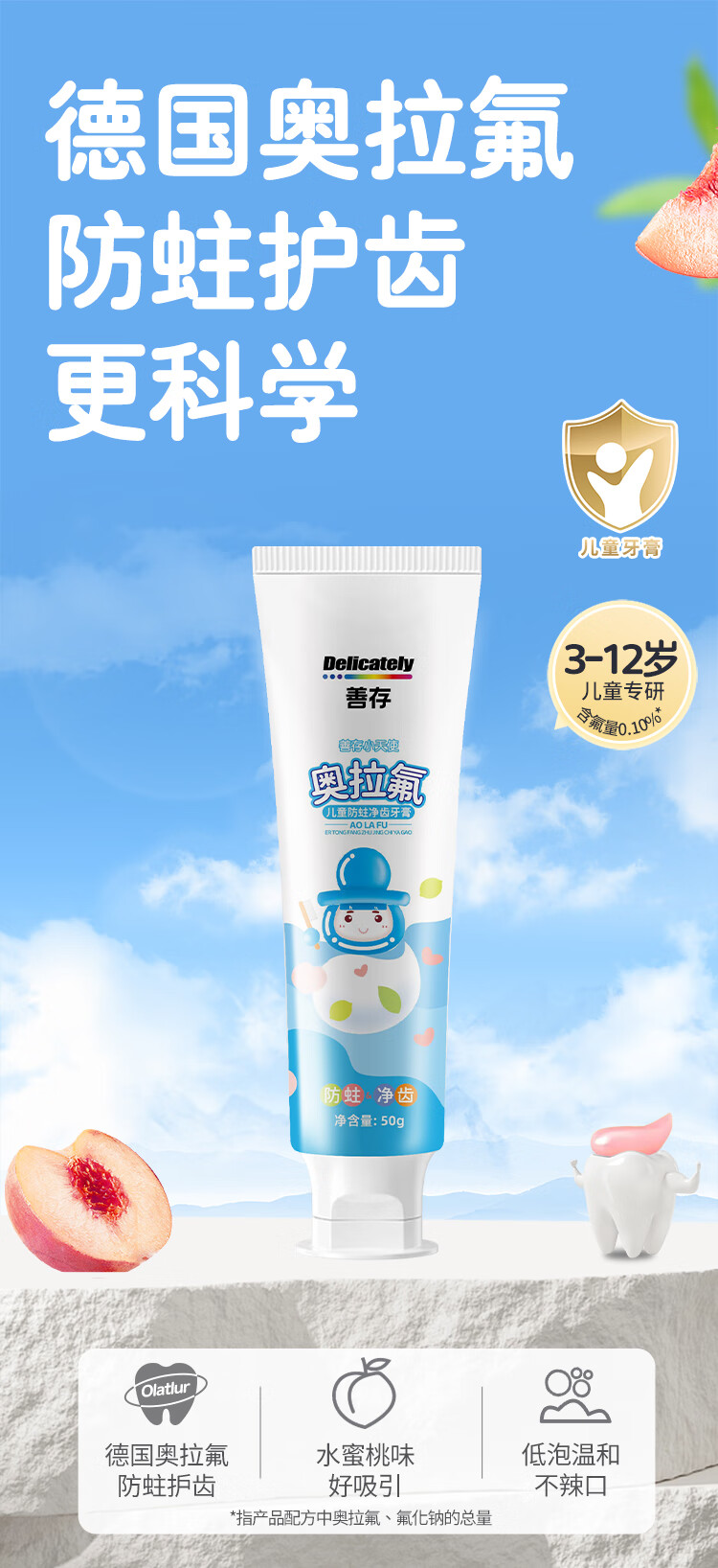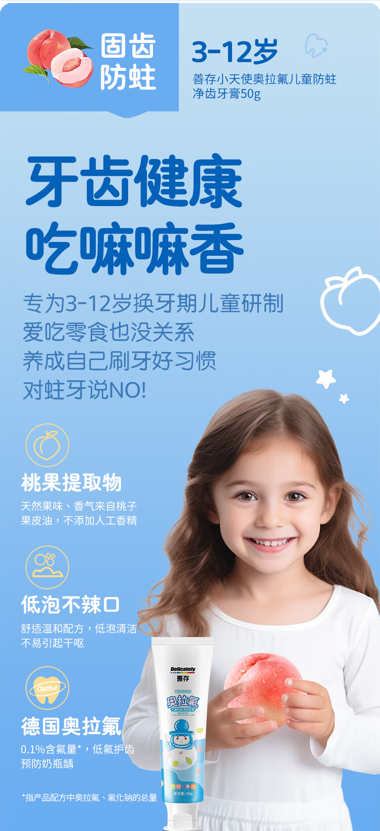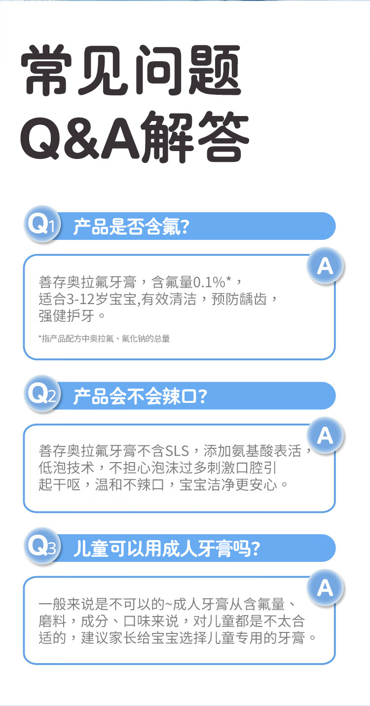 善存奥拉氟儿童牙膏含氟防蛀固齿3到6到12岁小学生宝宝换牙期专用