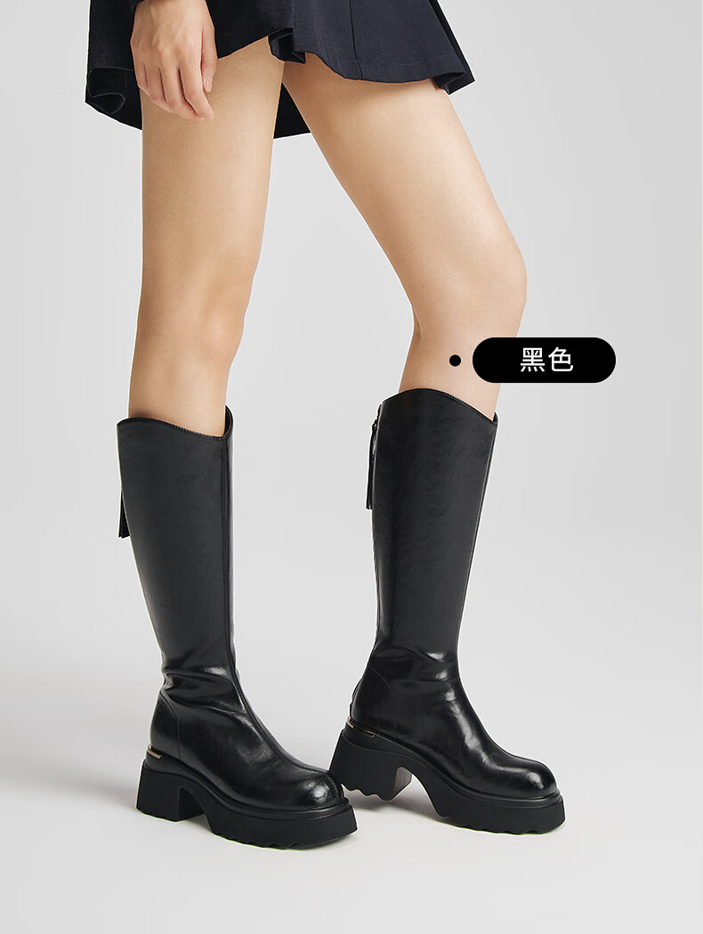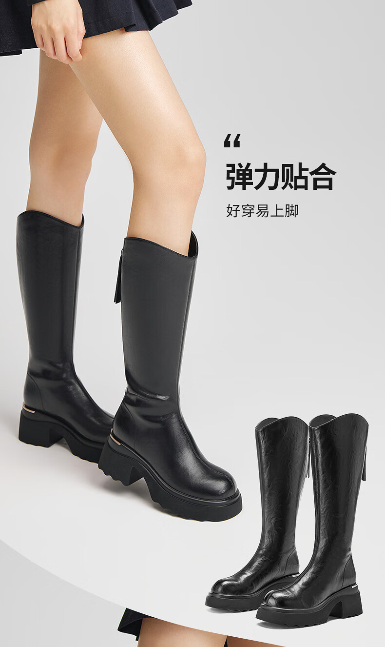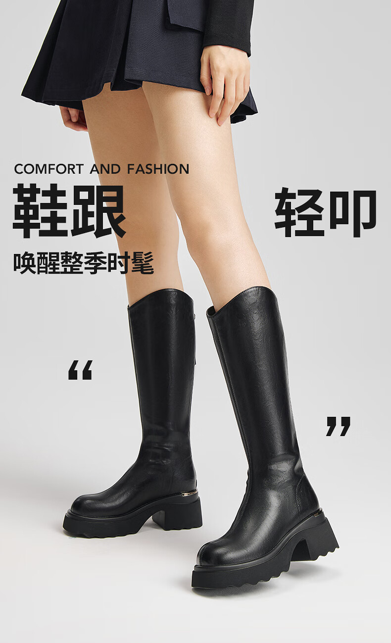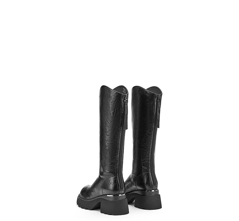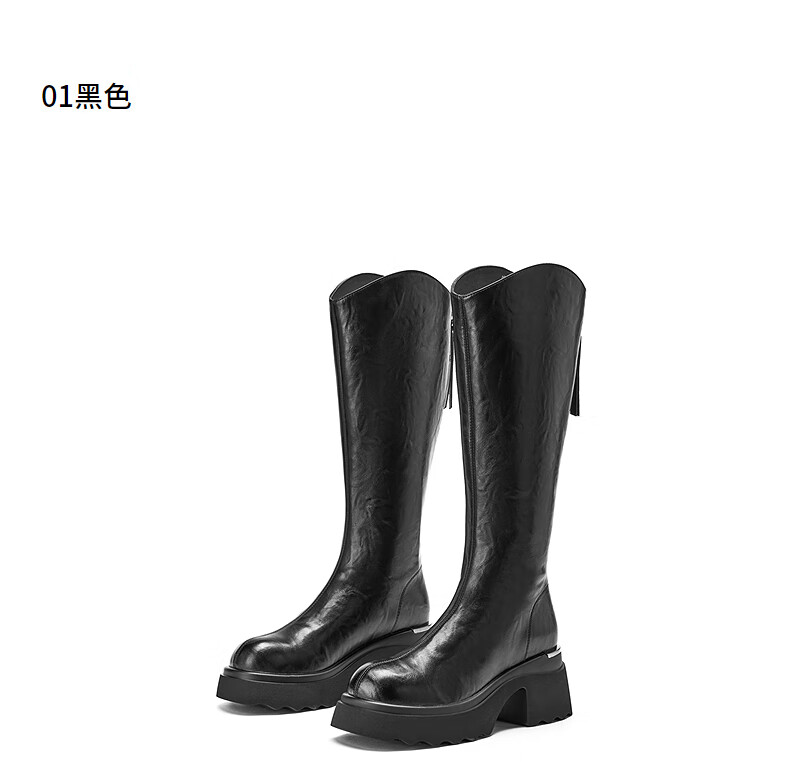 热风厚底长筒靴女2025年冬季新款增高时装靴子复古V口骑士靴女鞋 01黑色 34