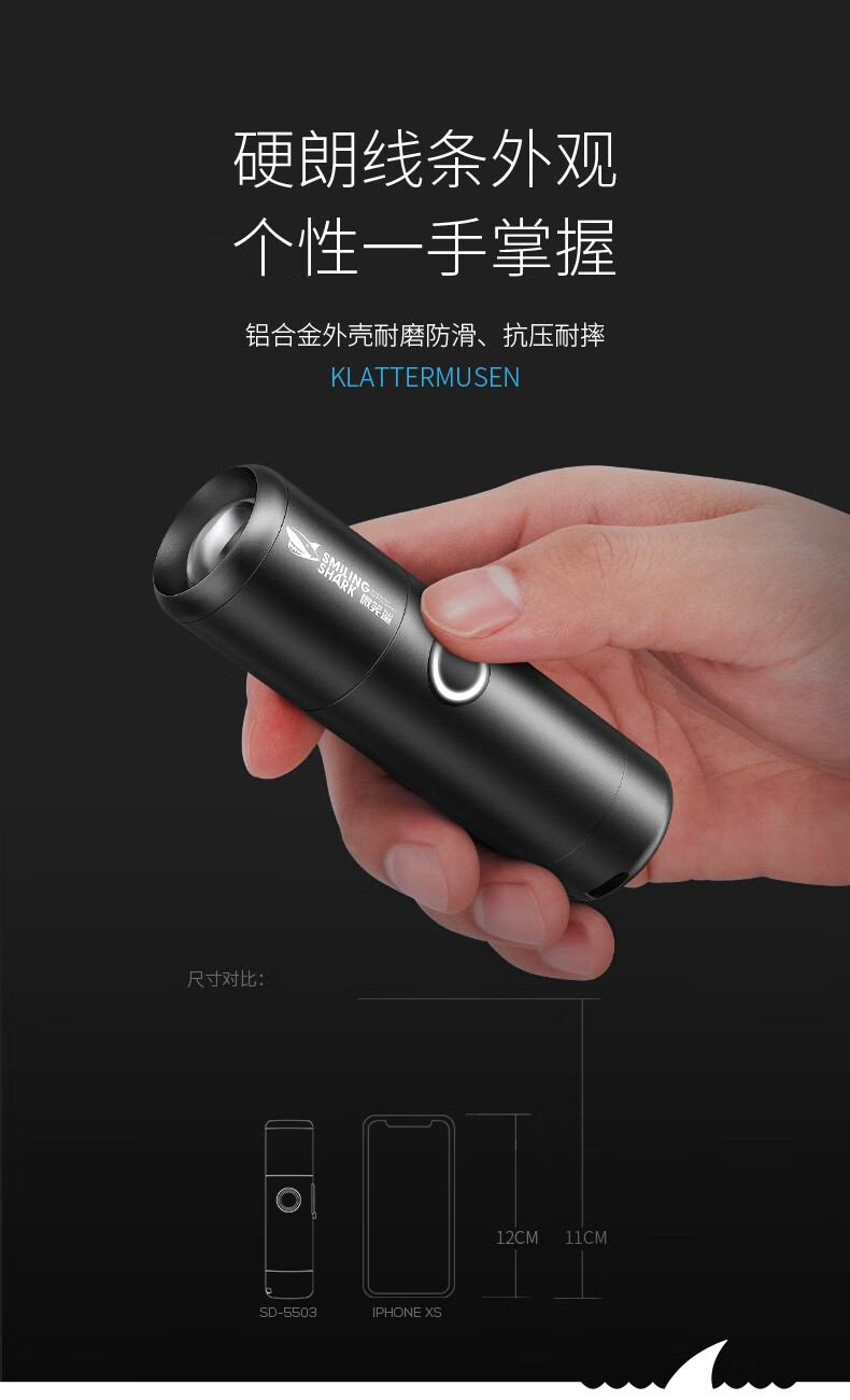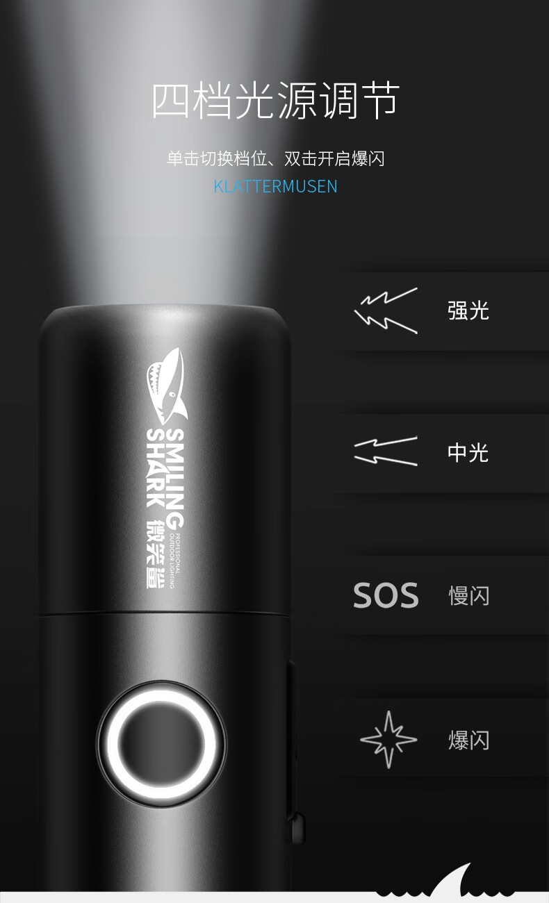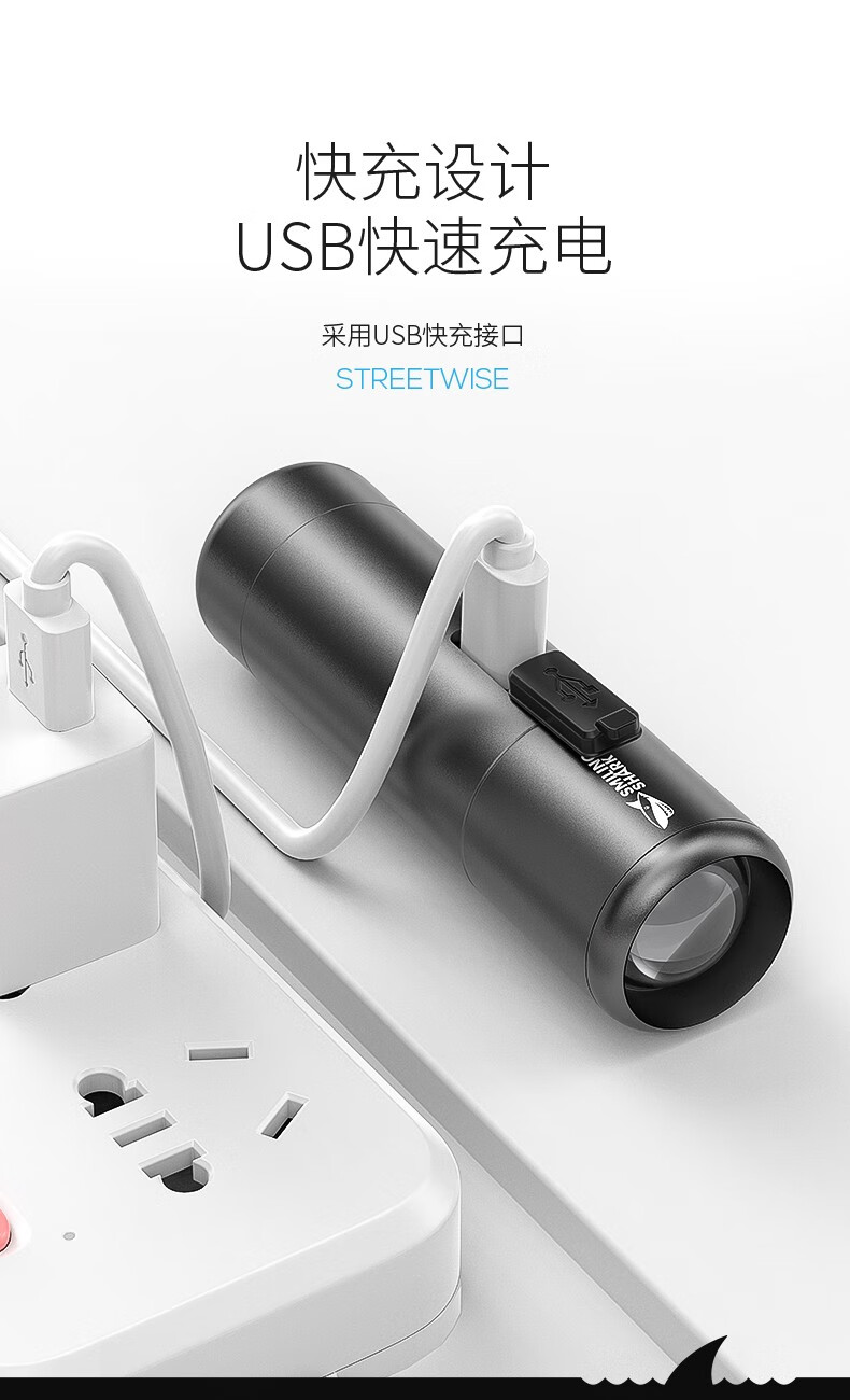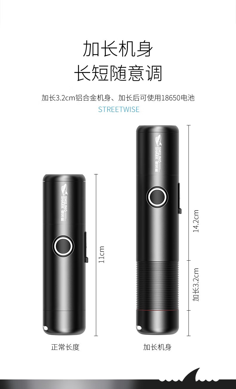 微笑鲨迷你手电筒强光可充电户外远射超亮家用小型便携式多功能激光手电 可拆卸加长款【续航4-6H】