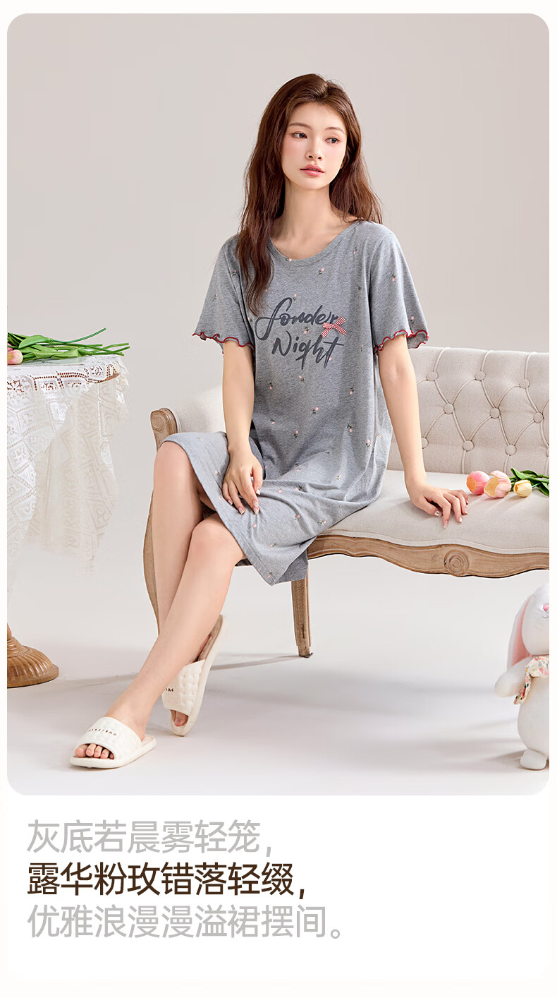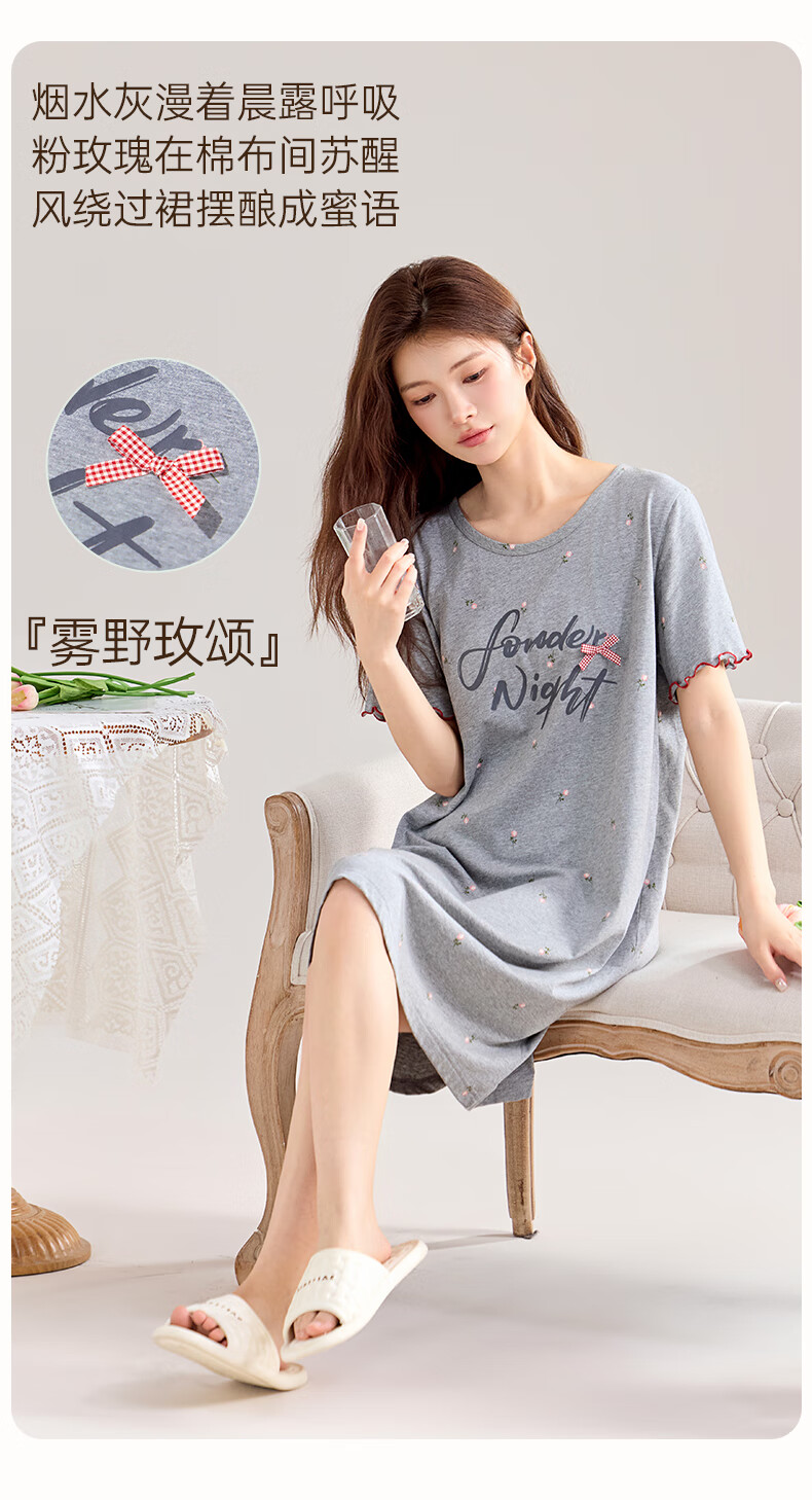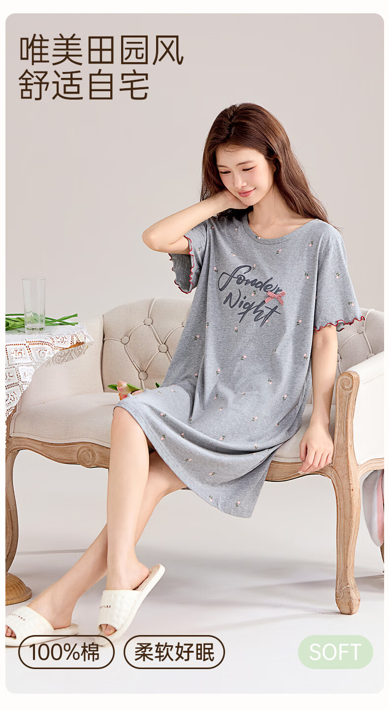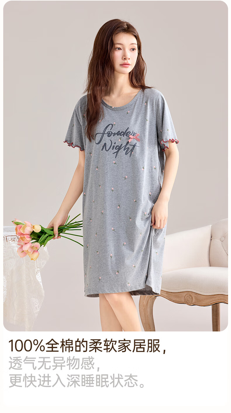 玛伦萨纯棉睡裙女款2025夏季新款中长款短袖裙宽松大码女士家居服 花灰 M