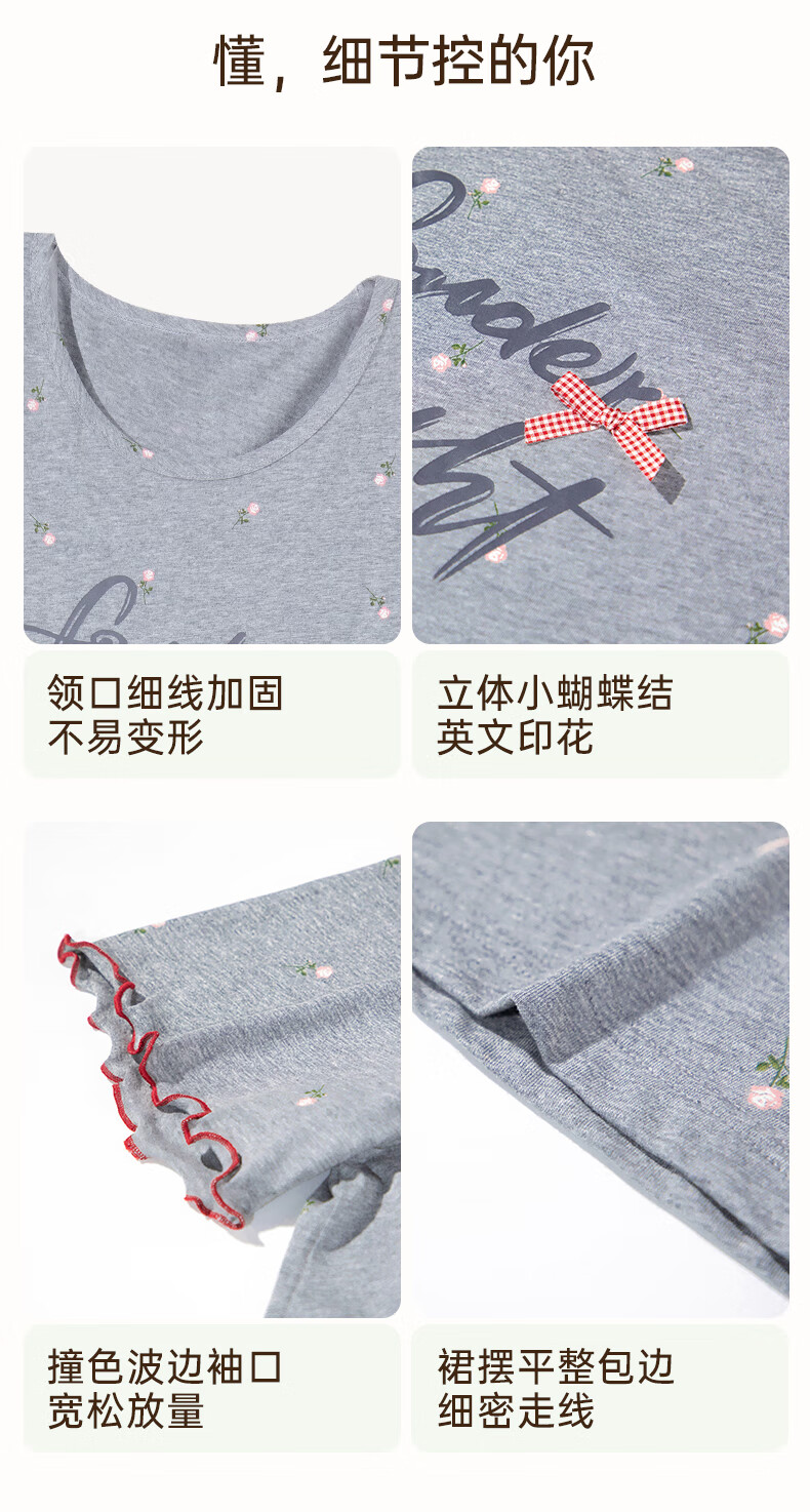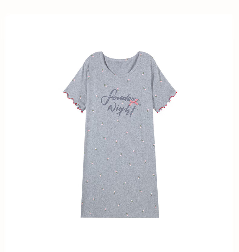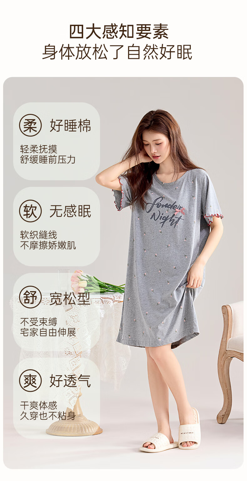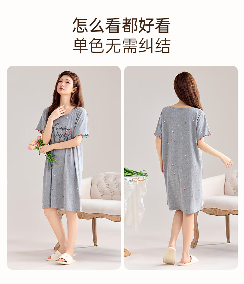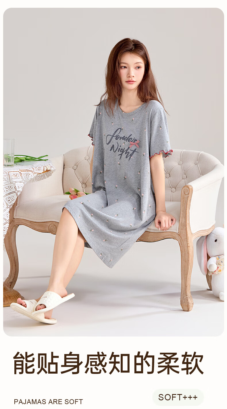玛伦萨纯棉睡裙女款2025夏季新款中长款短袖裙宽松大码女士家居服 花灰 M