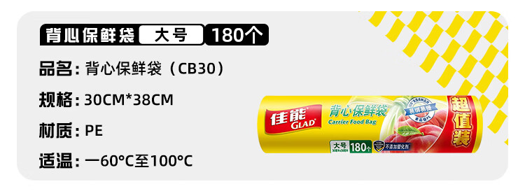 佳能(Glad)食品级保鲜袋大号180个 手提背心式 保鲜食物生鲜蔬果食品袋