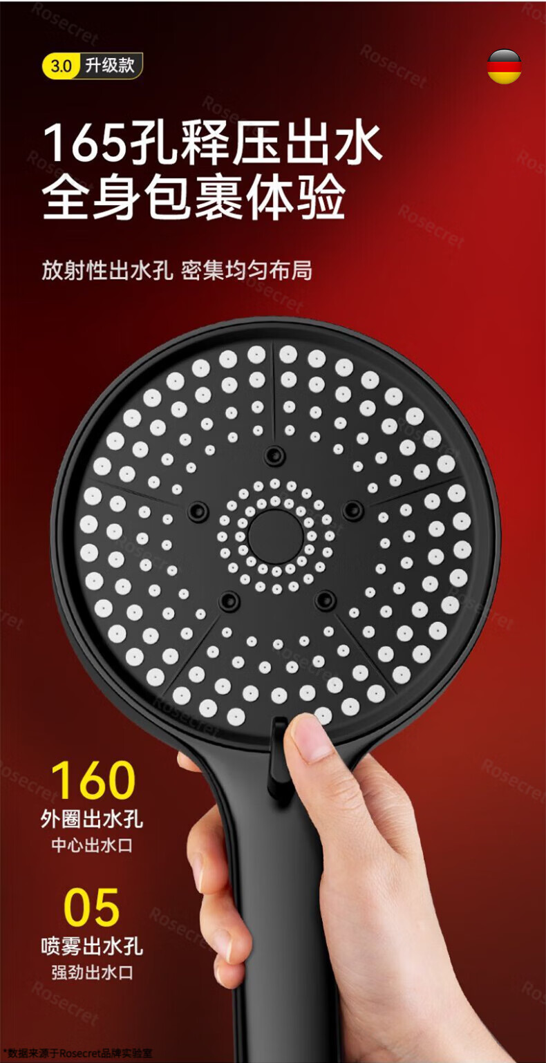Rosecret【德国】增压淋浴花洒喷头家用手持超强高压卫生间洗澡沐浴莲蓬头 五档增压花洒【雅黑色】单花洒 硅胶出水孔密集大出水量畅享淋浴