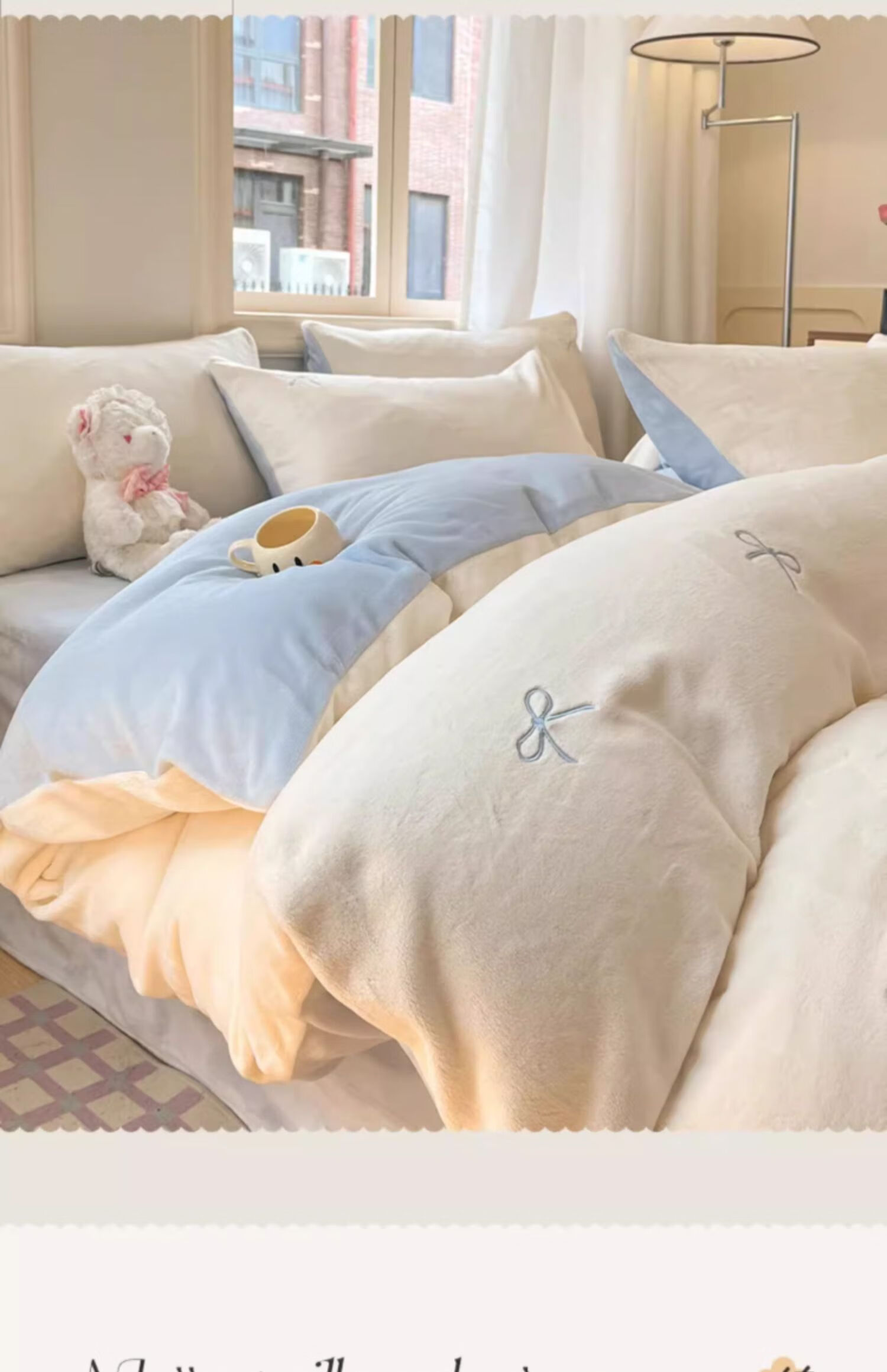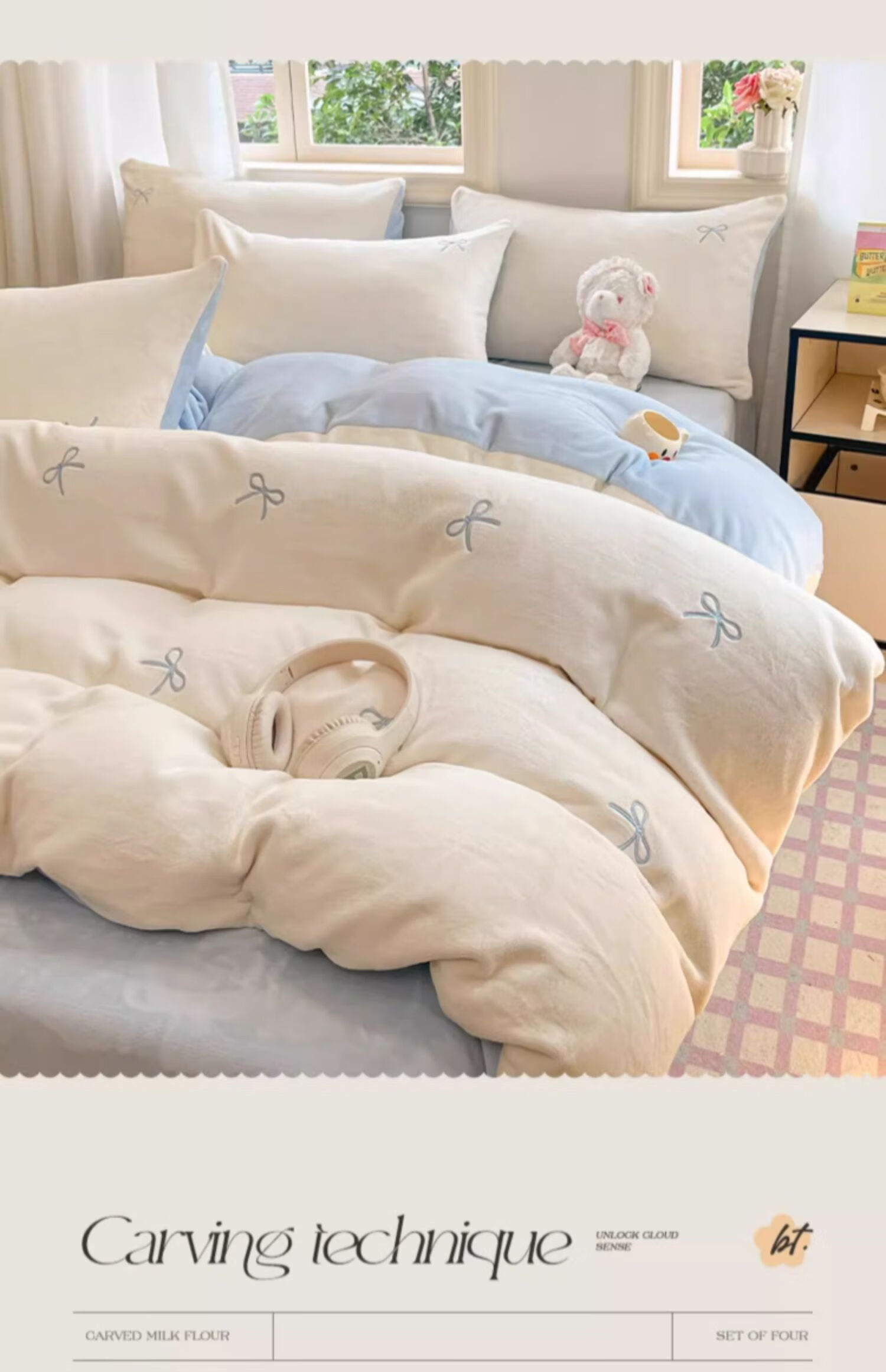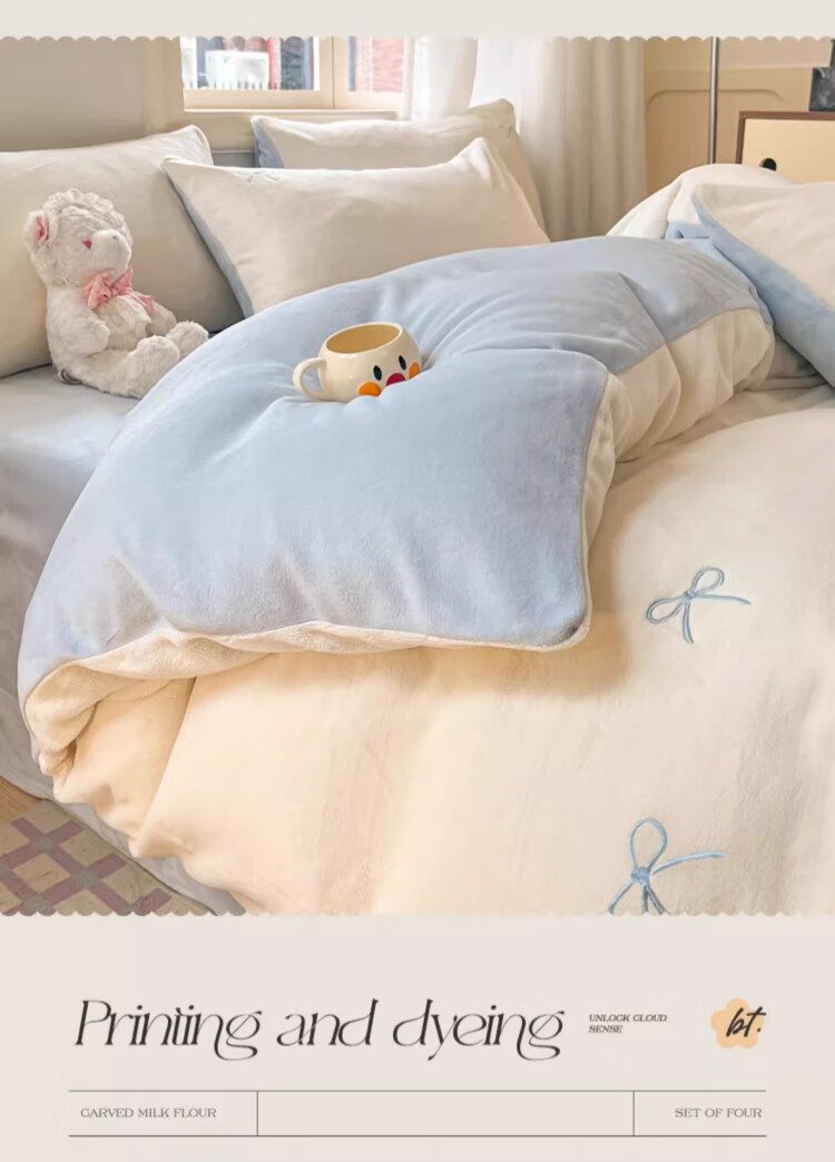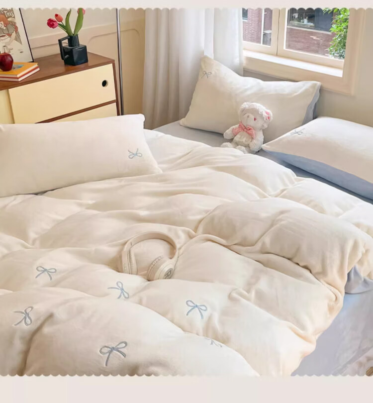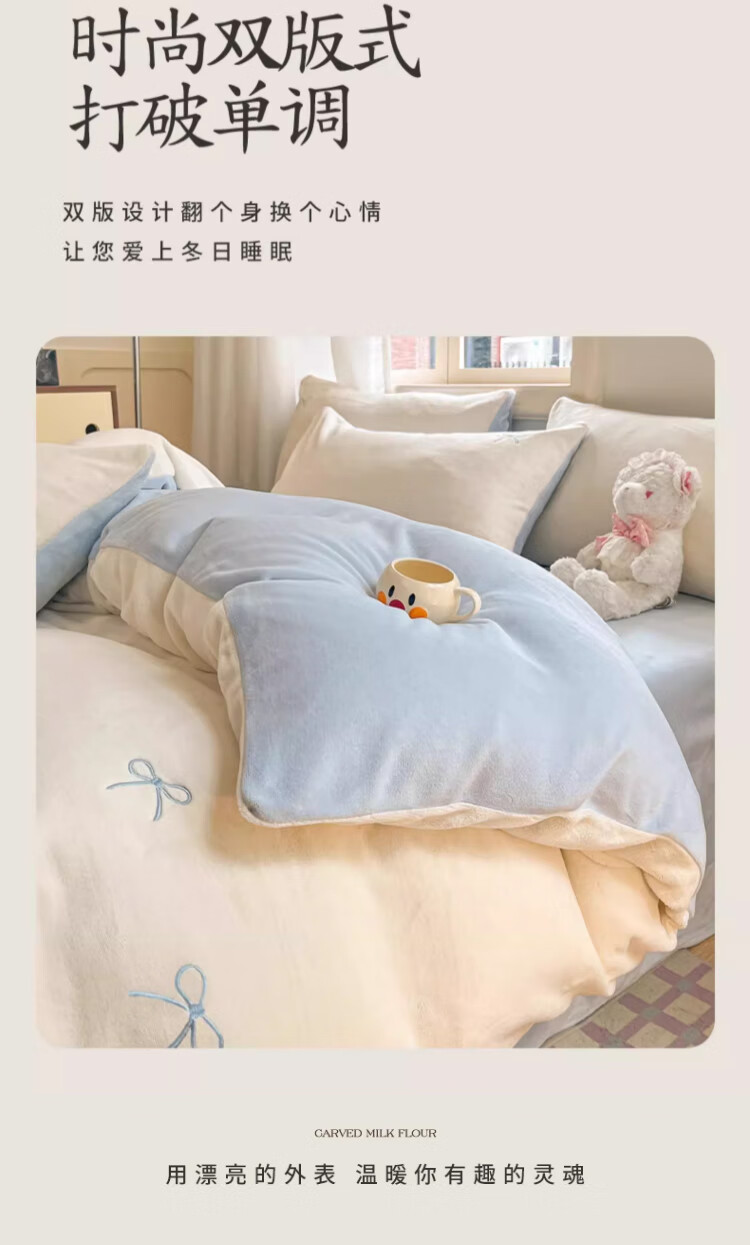 无印良品牛奶绒床上用品四件套秋冬季加厚加绒2025新款床单床笠被套三件套 蝴蝶结-奶白蓝【高克重牛奶绒】 1.5/1.8m 床单款 四件/被套200x230