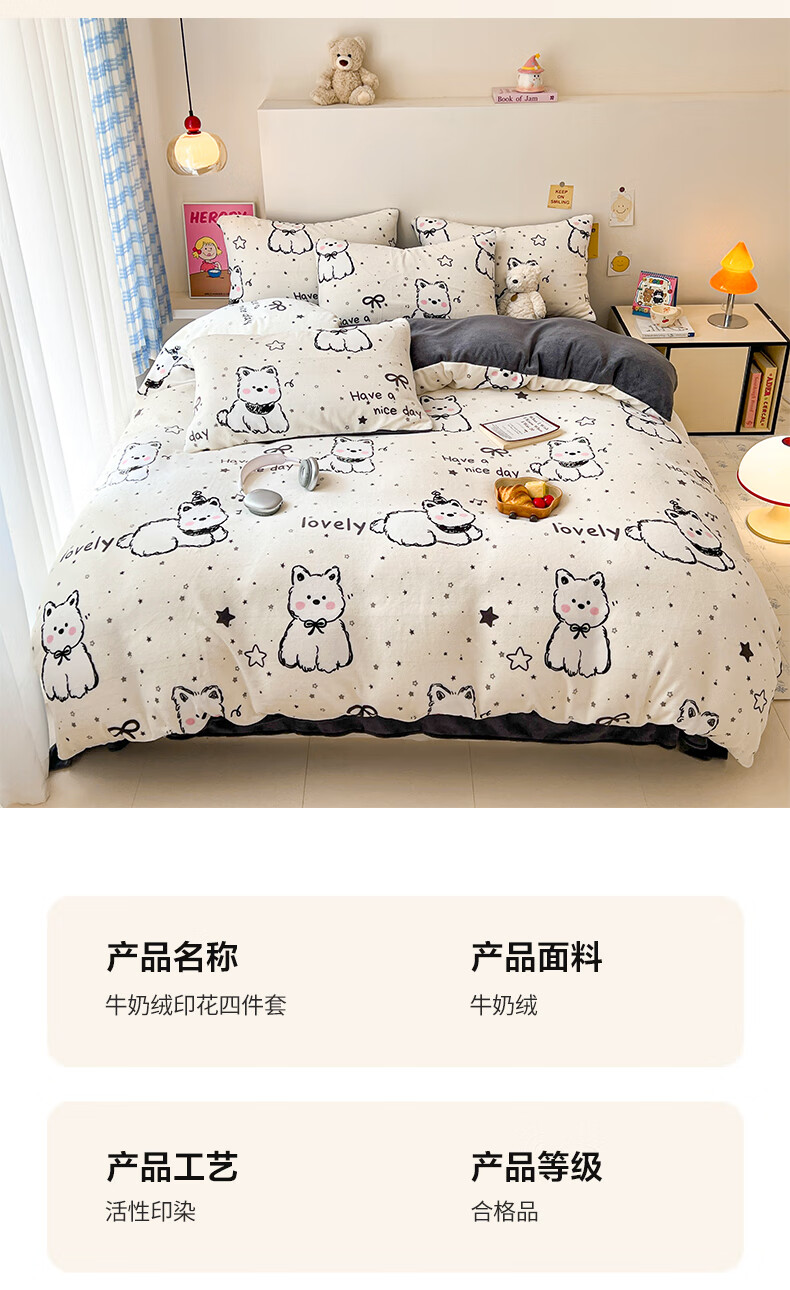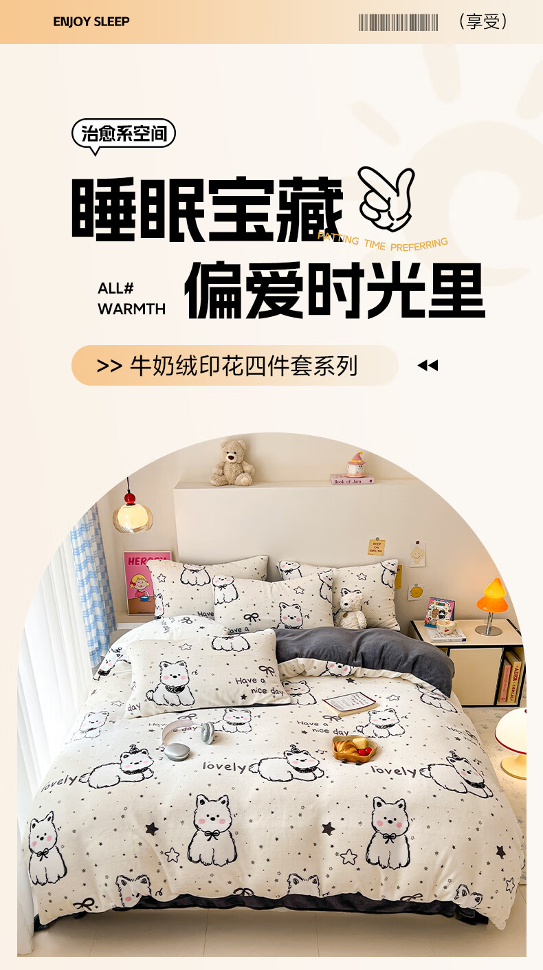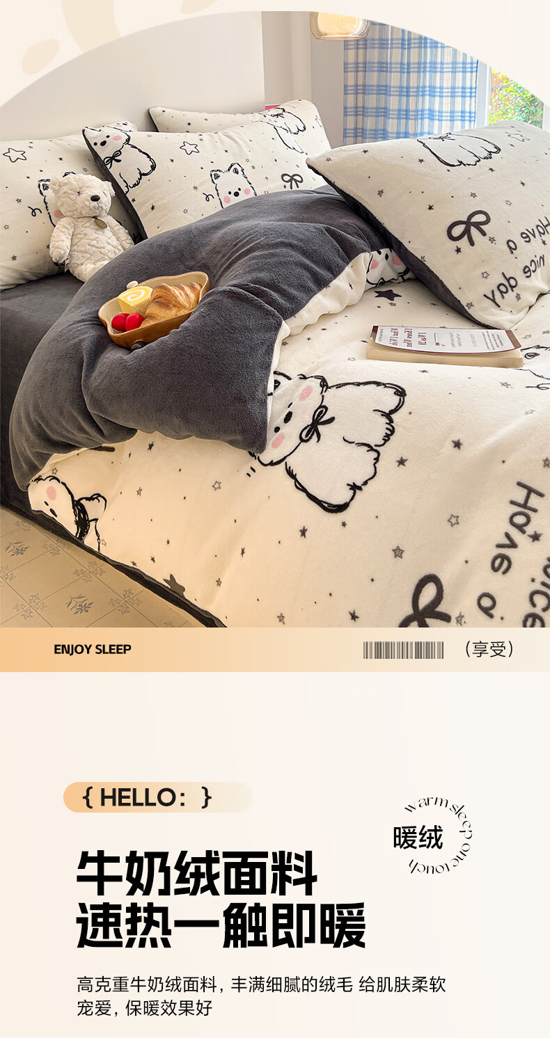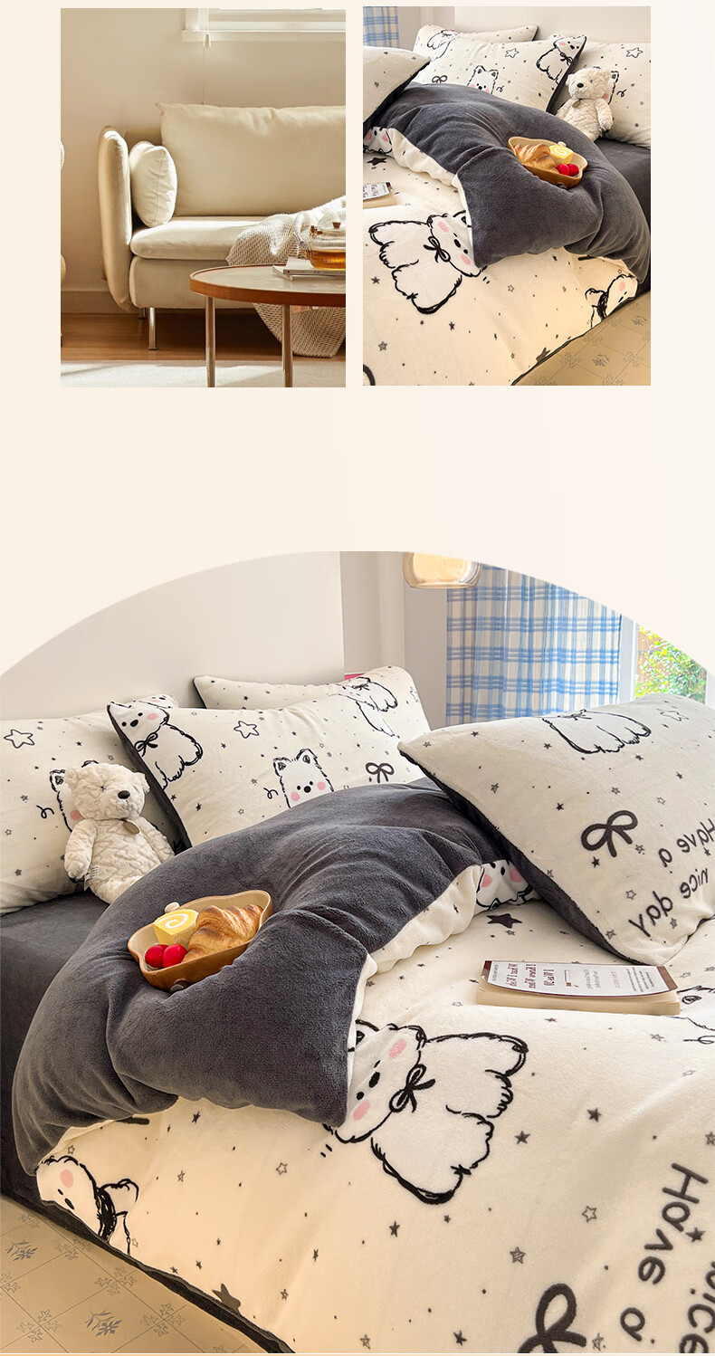 猫人卡通牛奶绒床上四件套秋冬加绒加厚珊瑚绒床单被套三件套床上用品 黑色西高地【亲肤软糯】 1.5m 床单款 四件套-200x230cm被套