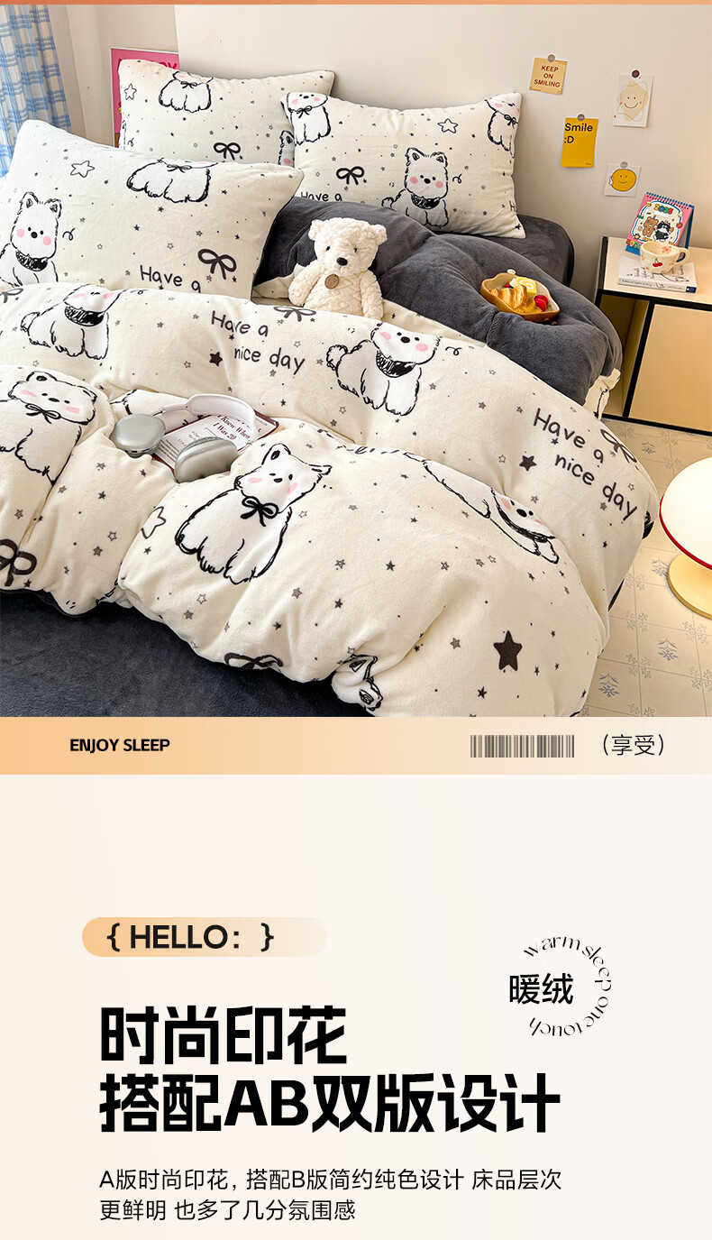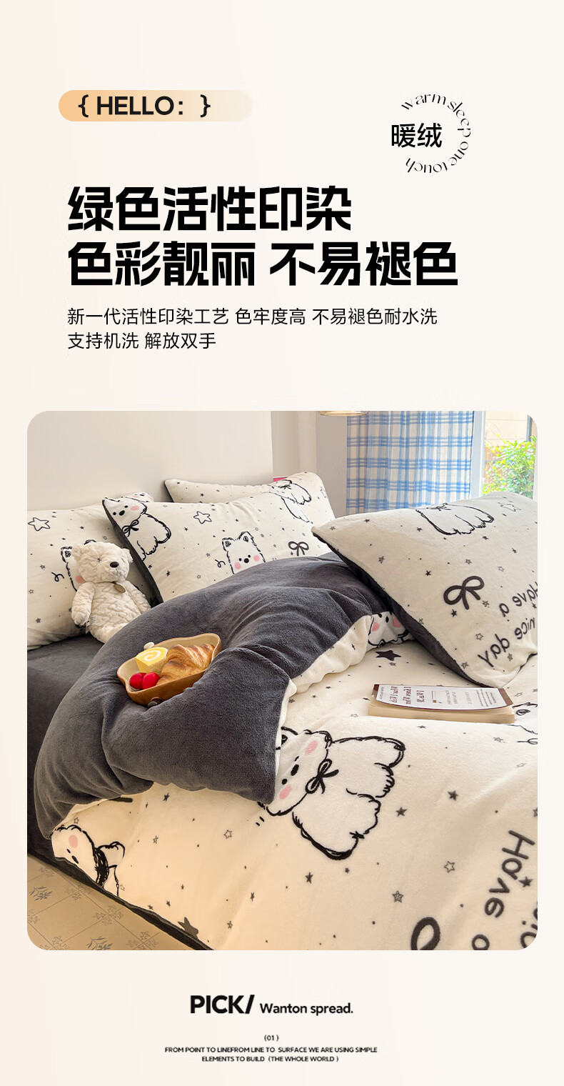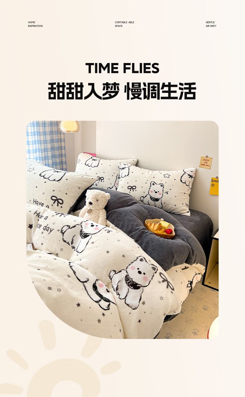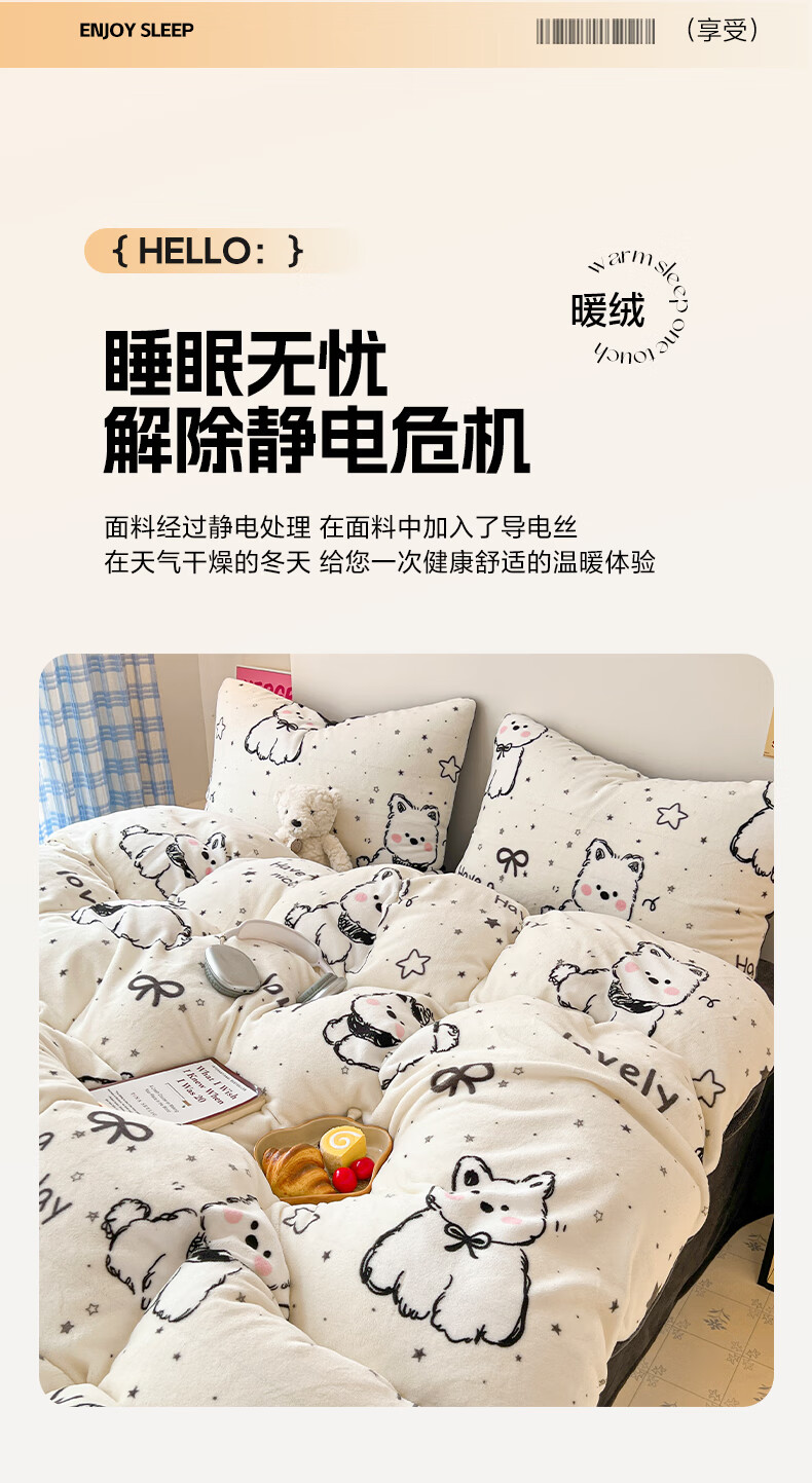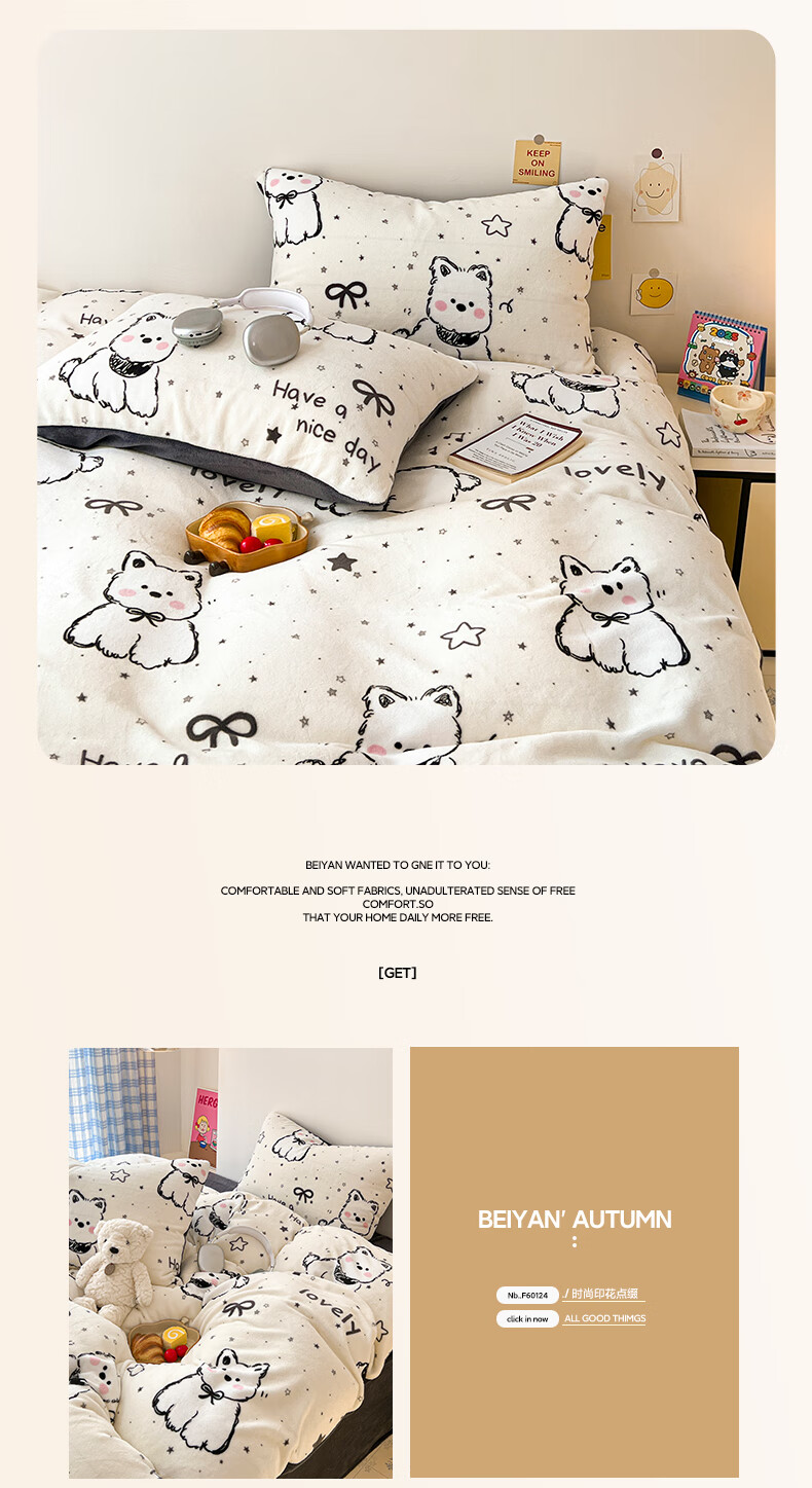 猫人卡通牛奶绒床上四件套秋冬加绒加厚珊瑚绒床单被套三件套床上用品 黑色西高地【亲肤软糯】 1.5m 床单款 四件套-200x230cm被套