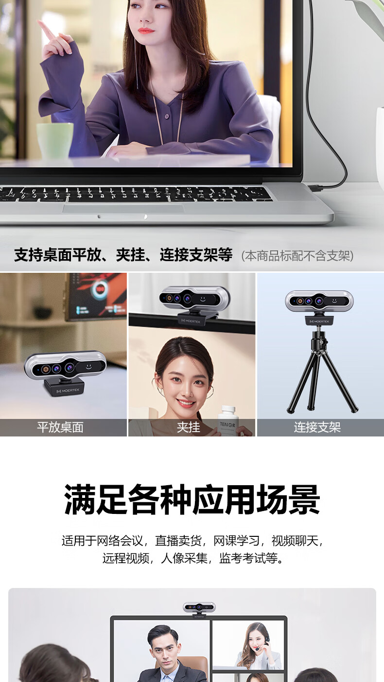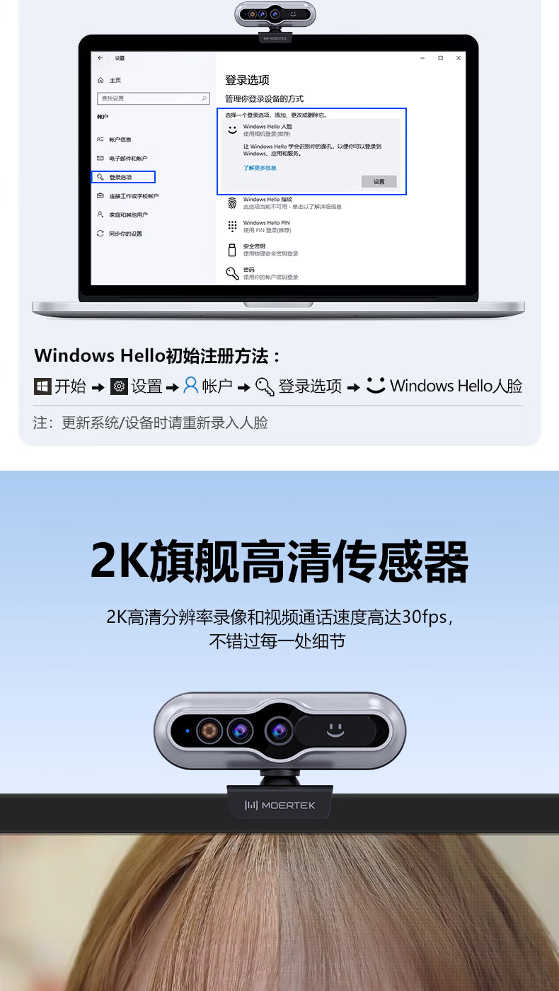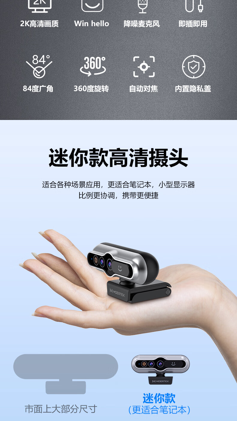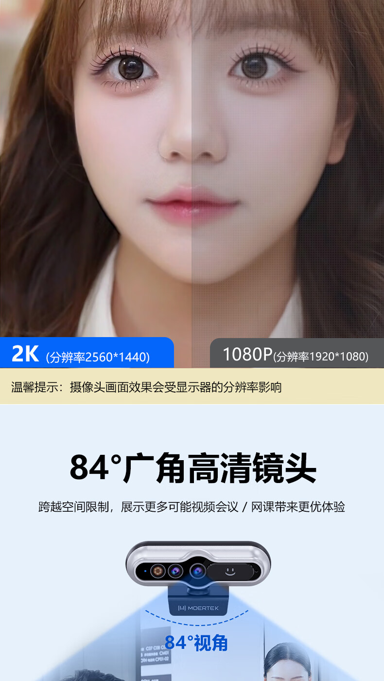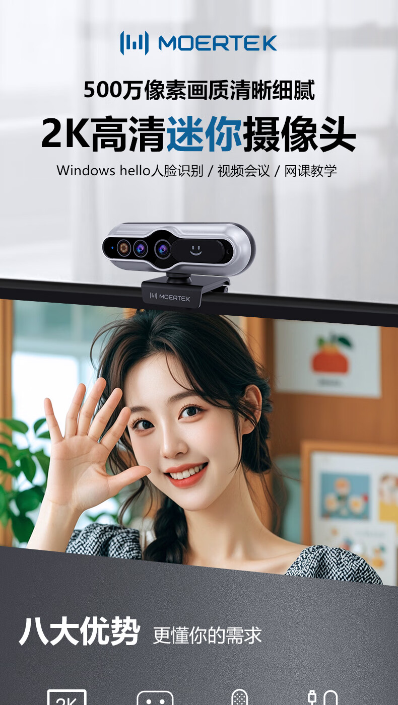Moertek2K超清Windows Hello人脸识别电脑摄像头直播设备网课教学视频会议一体式台式笔记本摄像头 2K 超清*人脸识别*免驱动*即插即用
