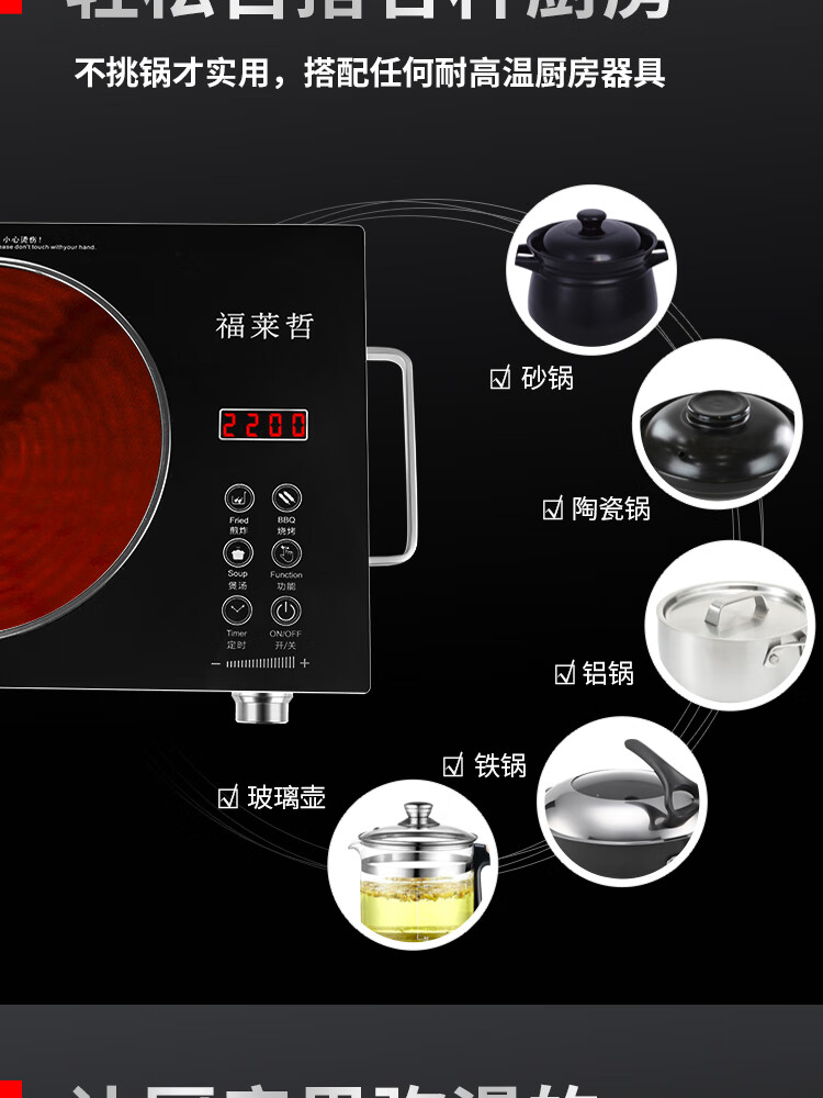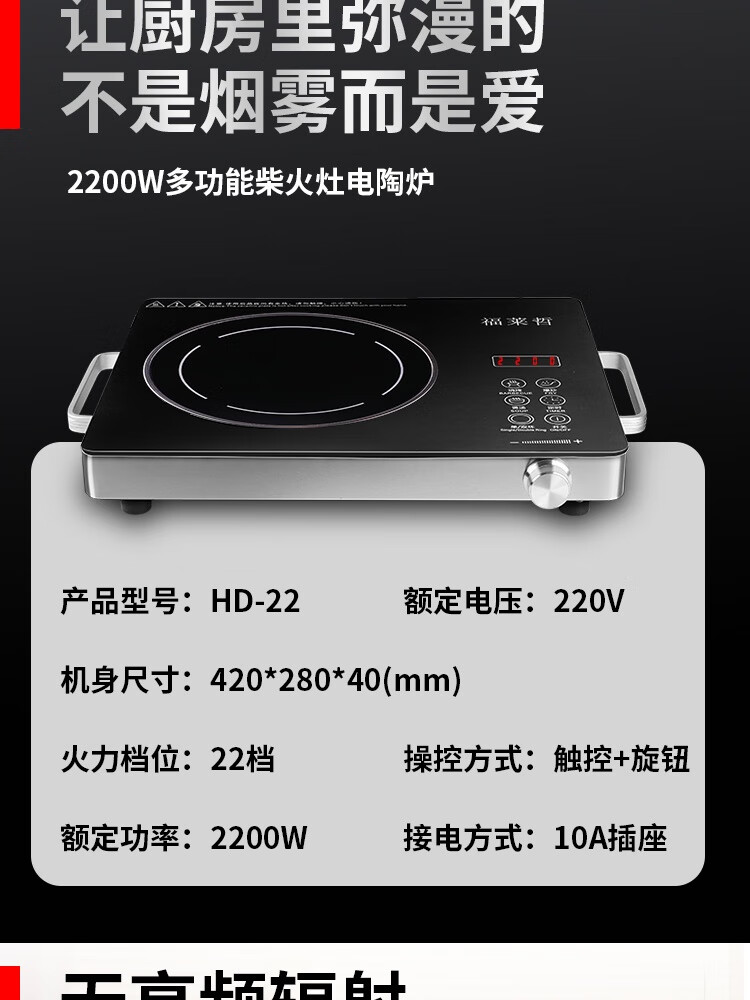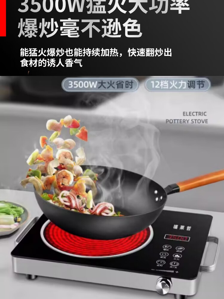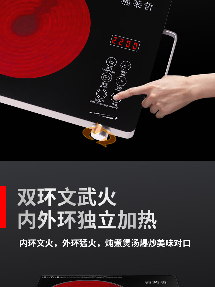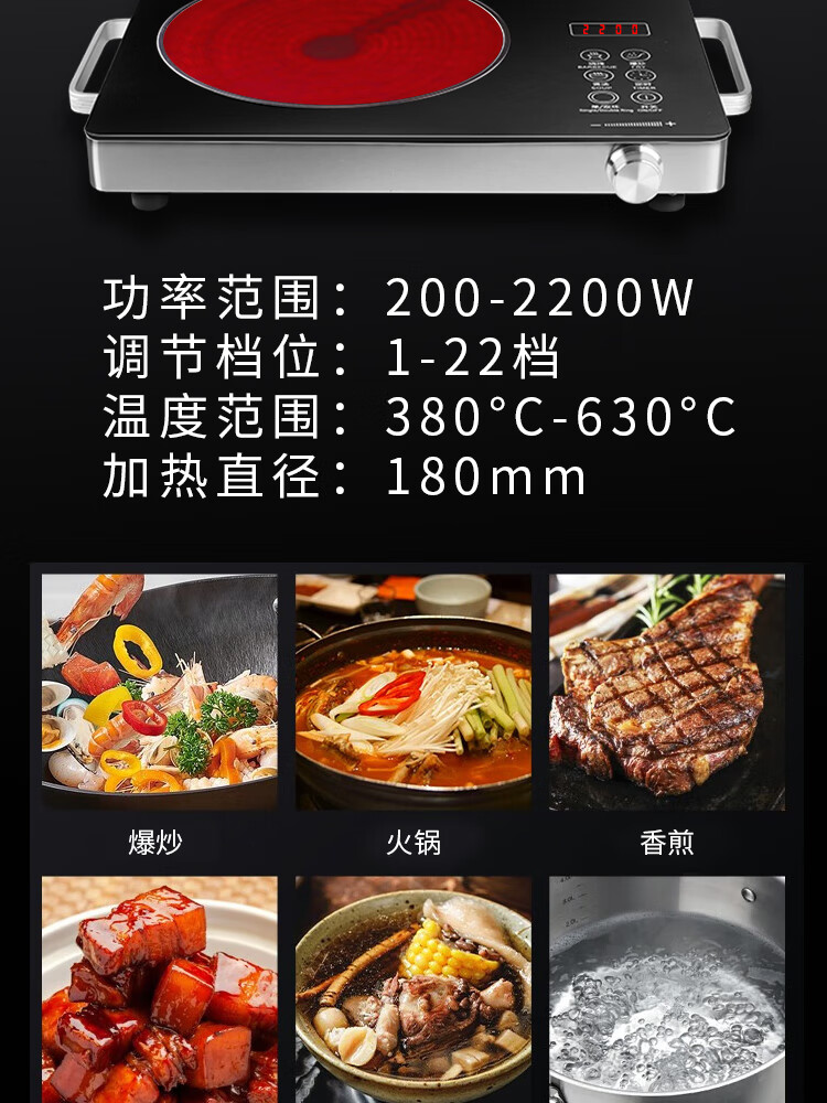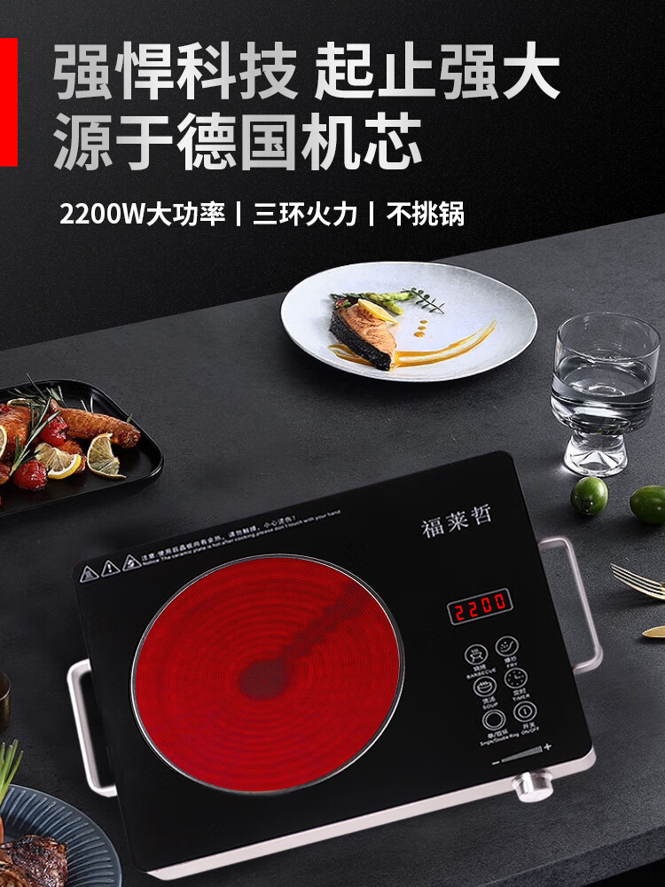 福莱哲一级能效电陶炉炒菜家用2200W大功率多功能电磁炉电陶炉旋控调节定时多档调温不挑锅具煮茶炉 黑晶磨砂面板单机