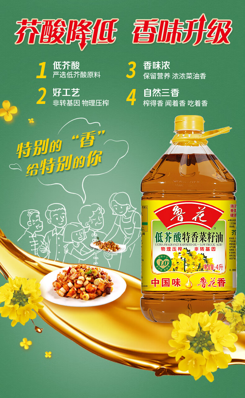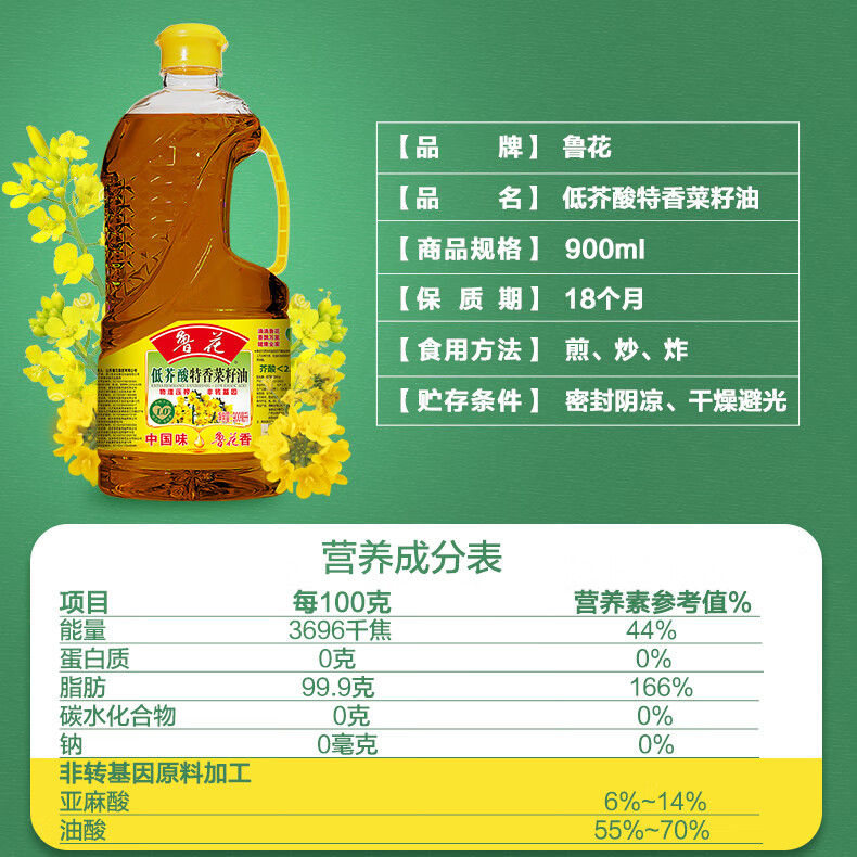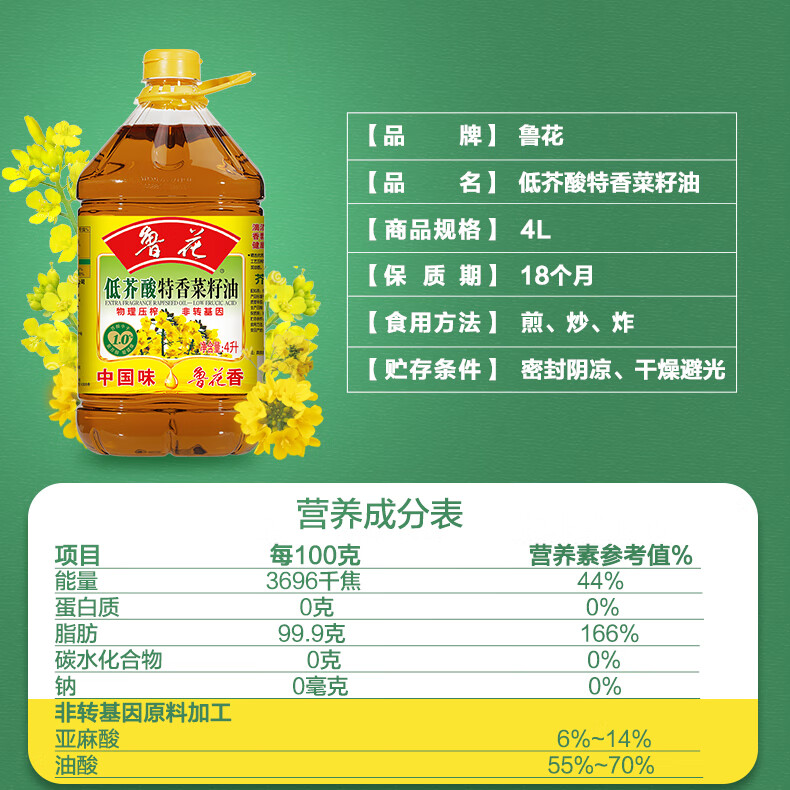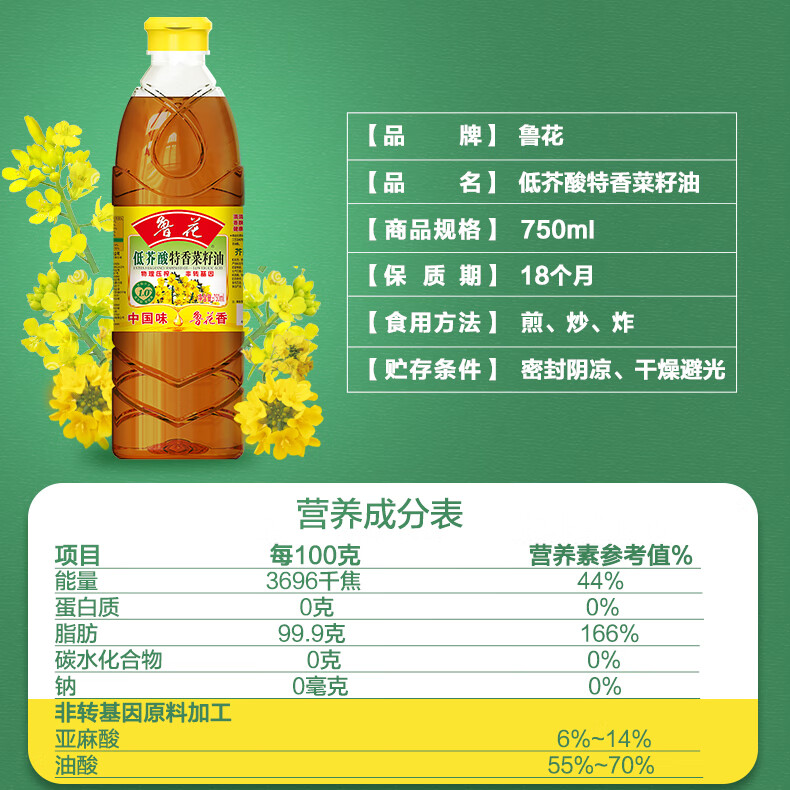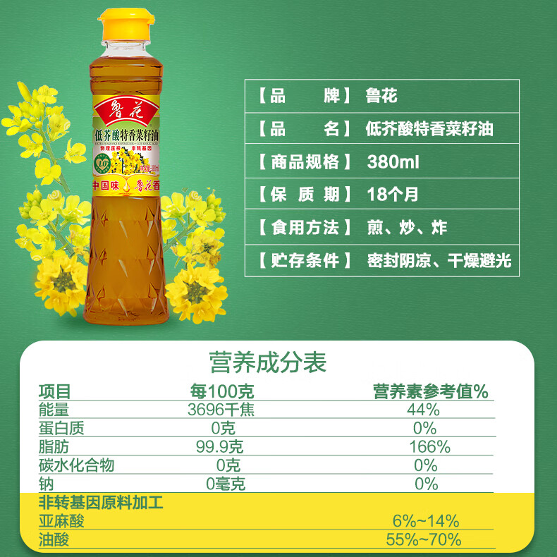 鲁花食用油 低芥酸 非转基因物理压榨 特香菜籽油 380mL*1瓶 食用油小瓶