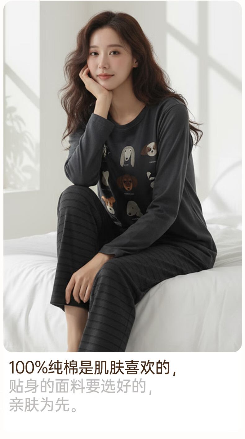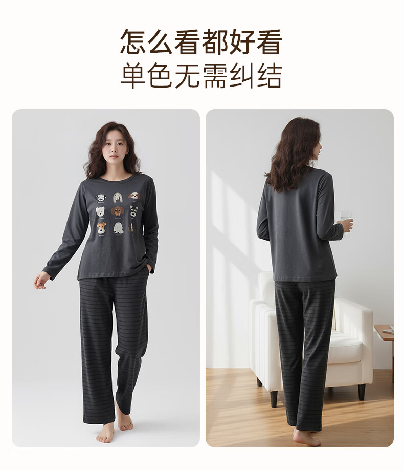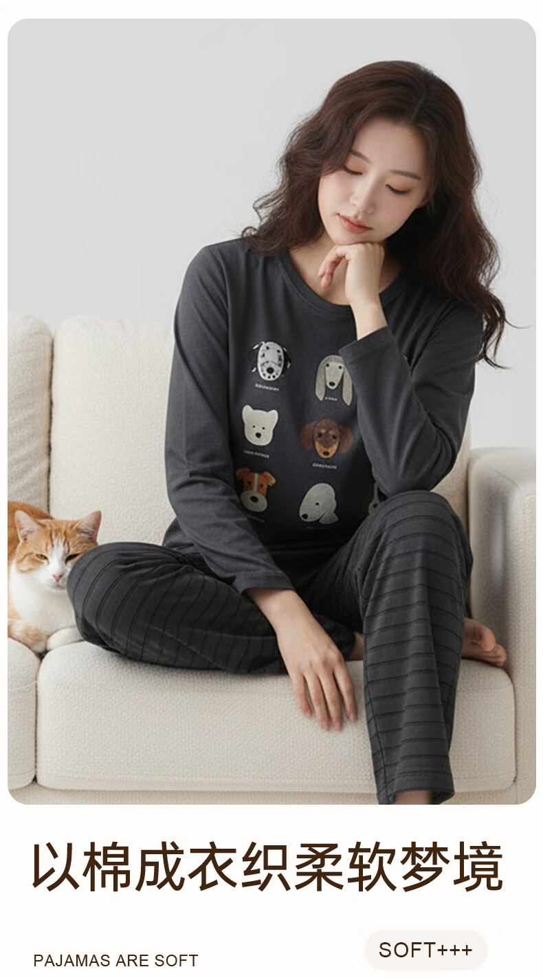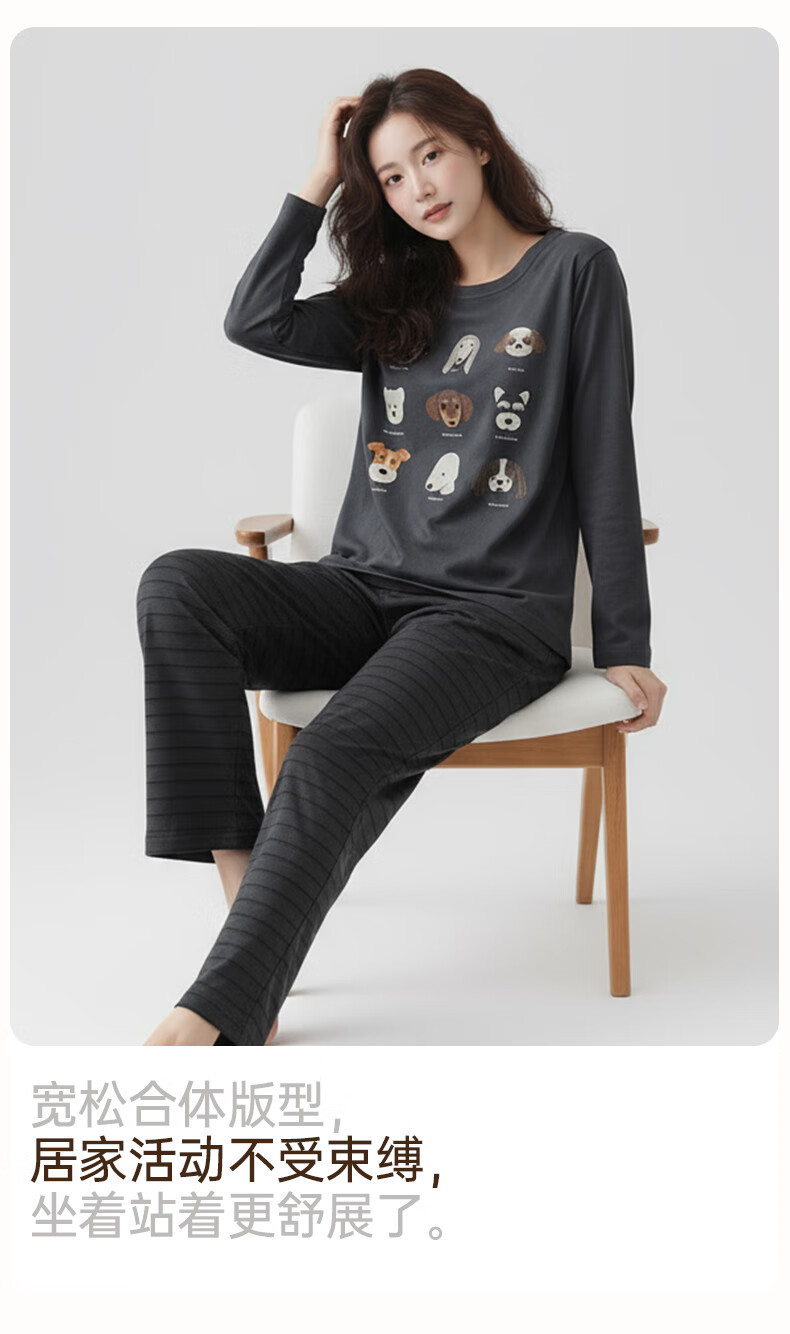 玛伦萨100%纯棉睡衣女士2025春秋新款可外穿长袖长裤套装女士家居服 深灰 M