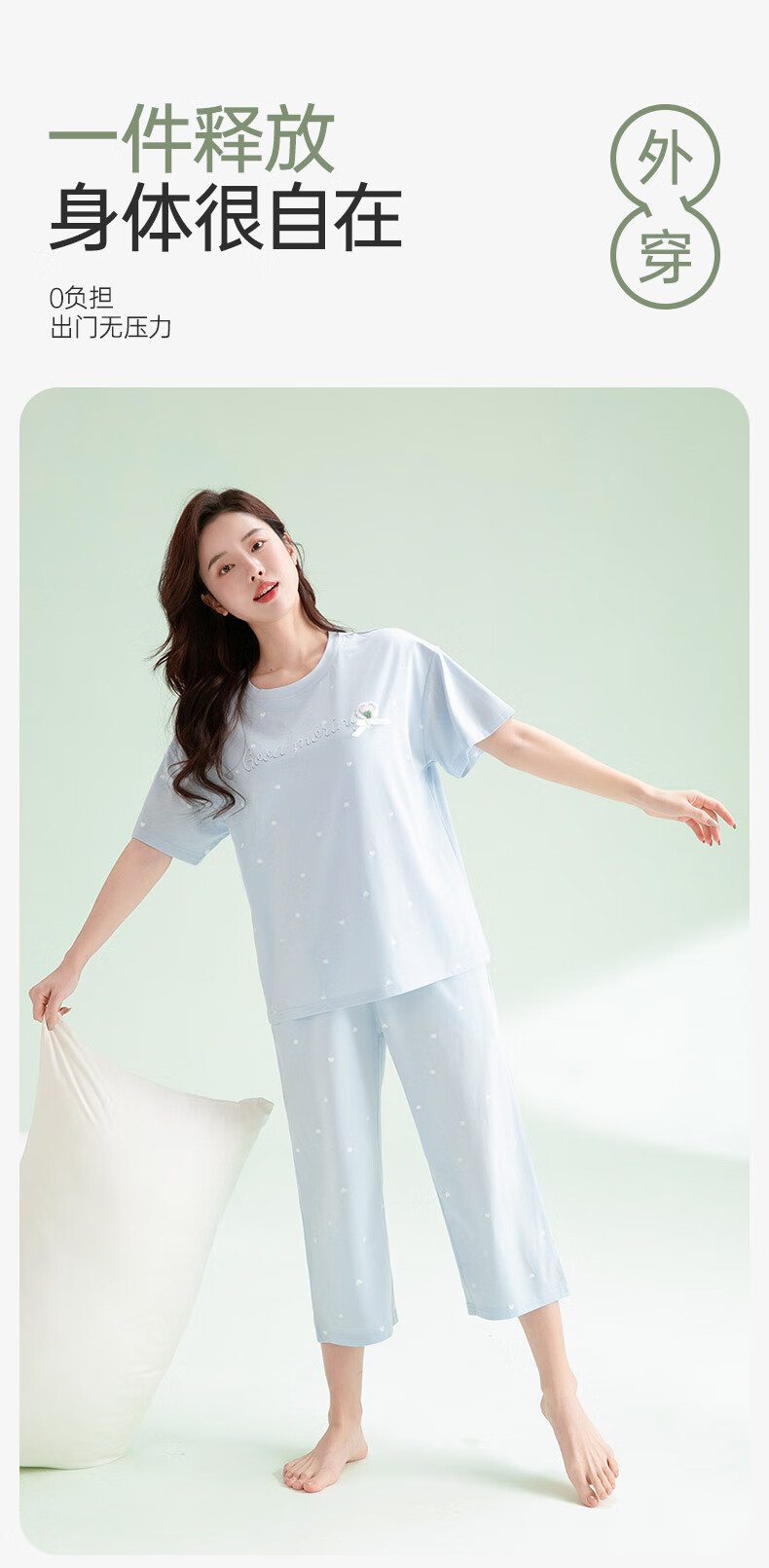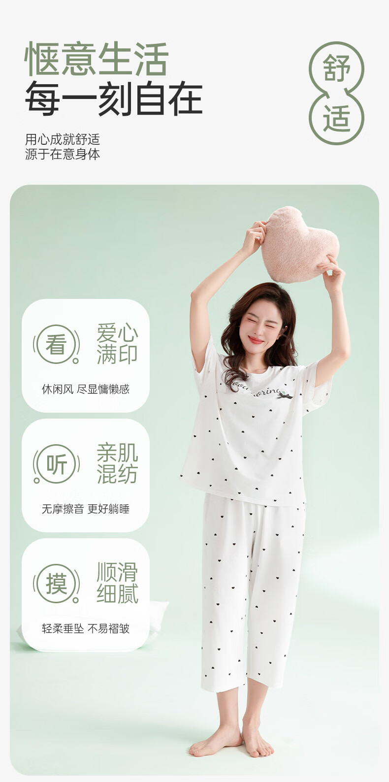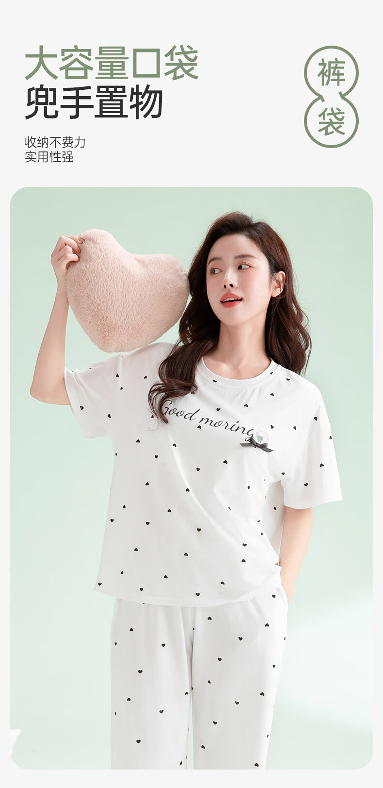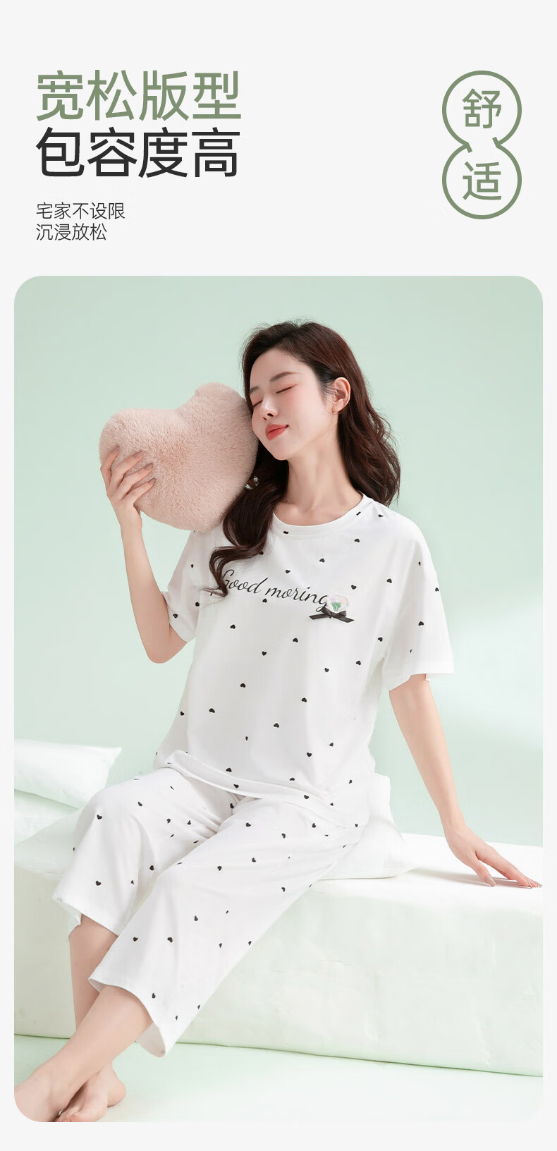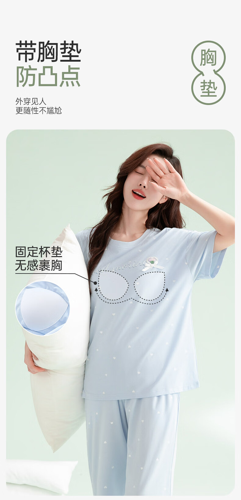芬腾可安睡衣女【自带胸垫】新款圆领短袖七分裤波点可外穿女士家居服套装 杏色 L