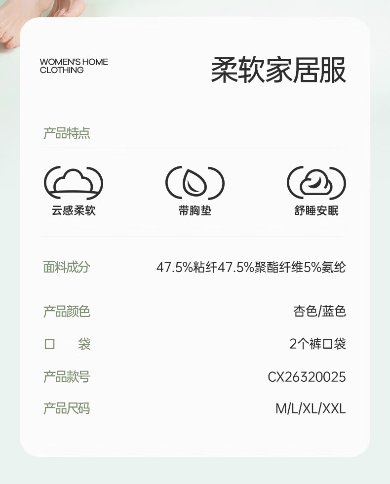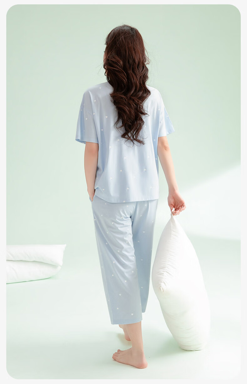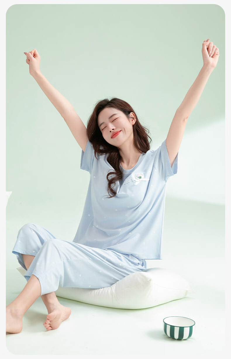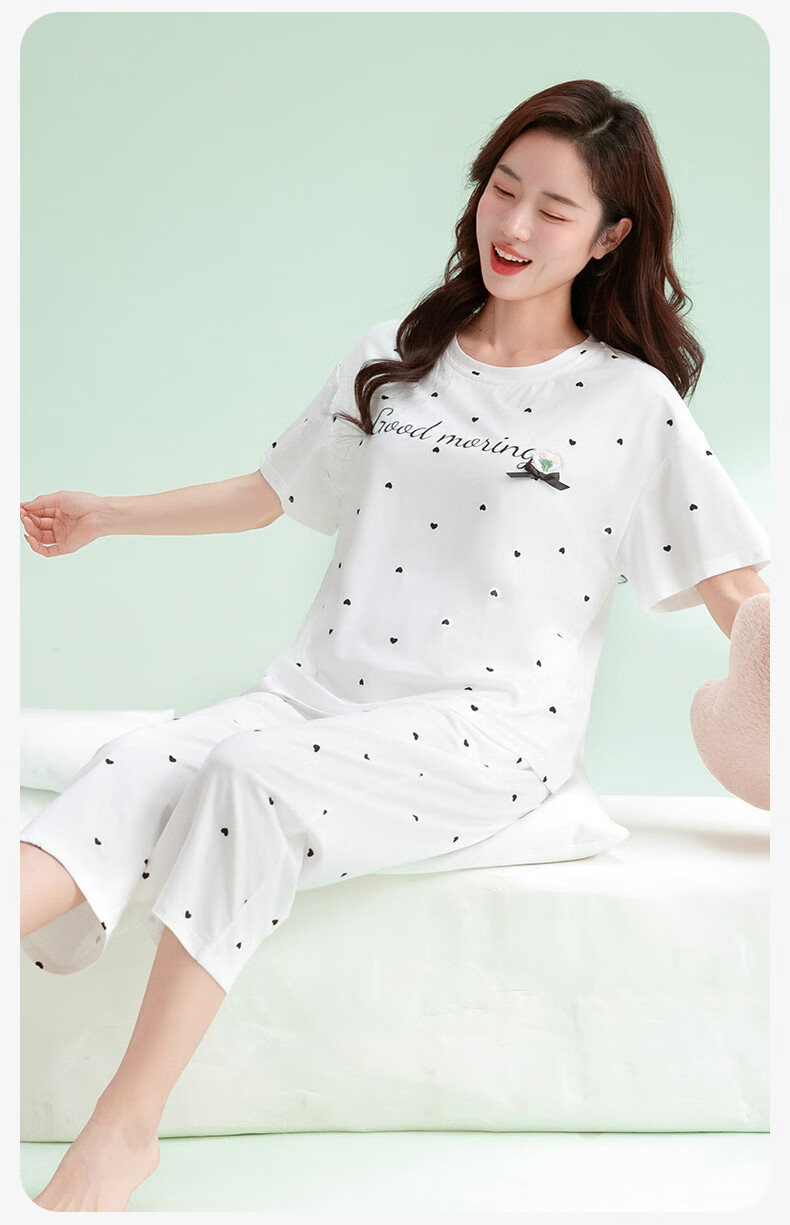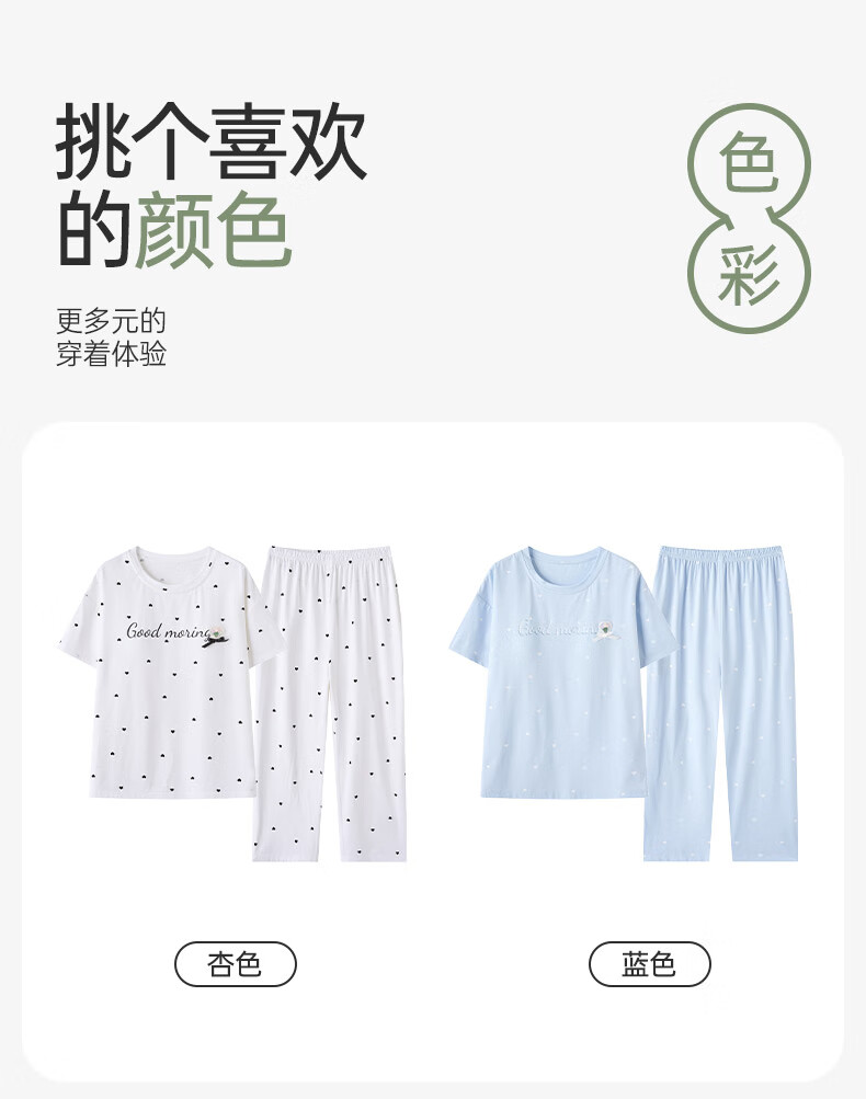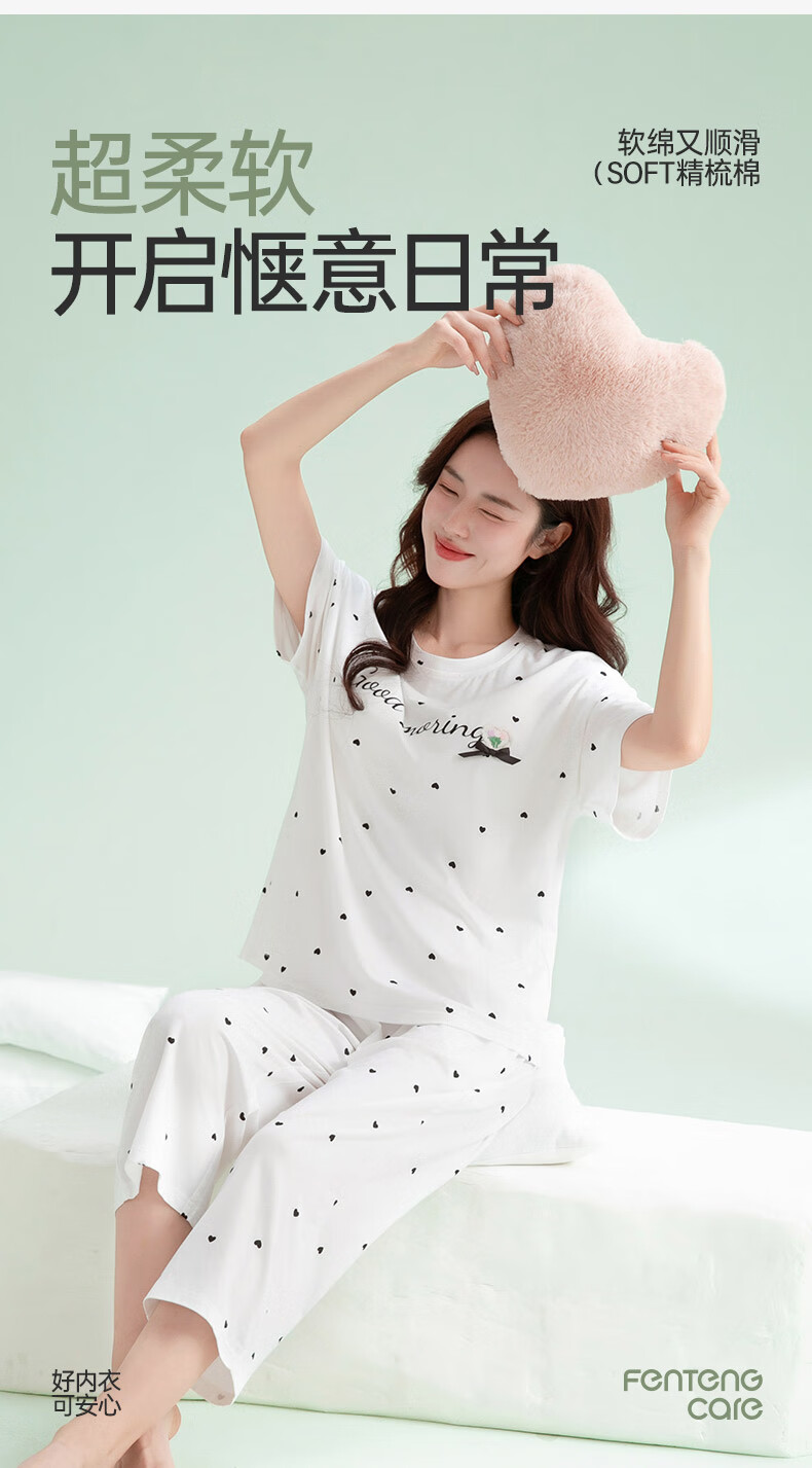 芬腾可安睡衣女【自带胸垫】新款圆领短袖七分裤波点可外穿女士家居服套装 杏色 L