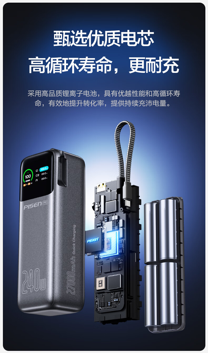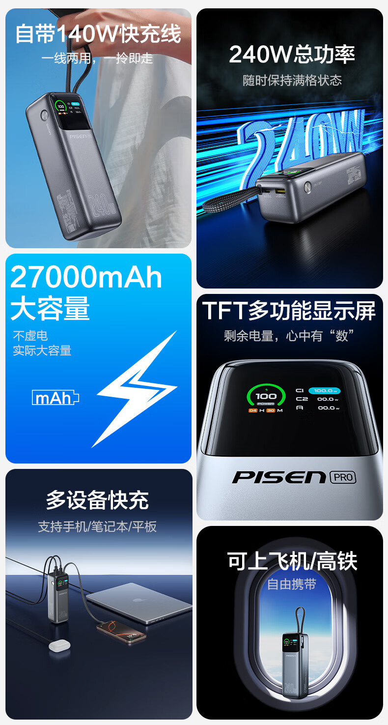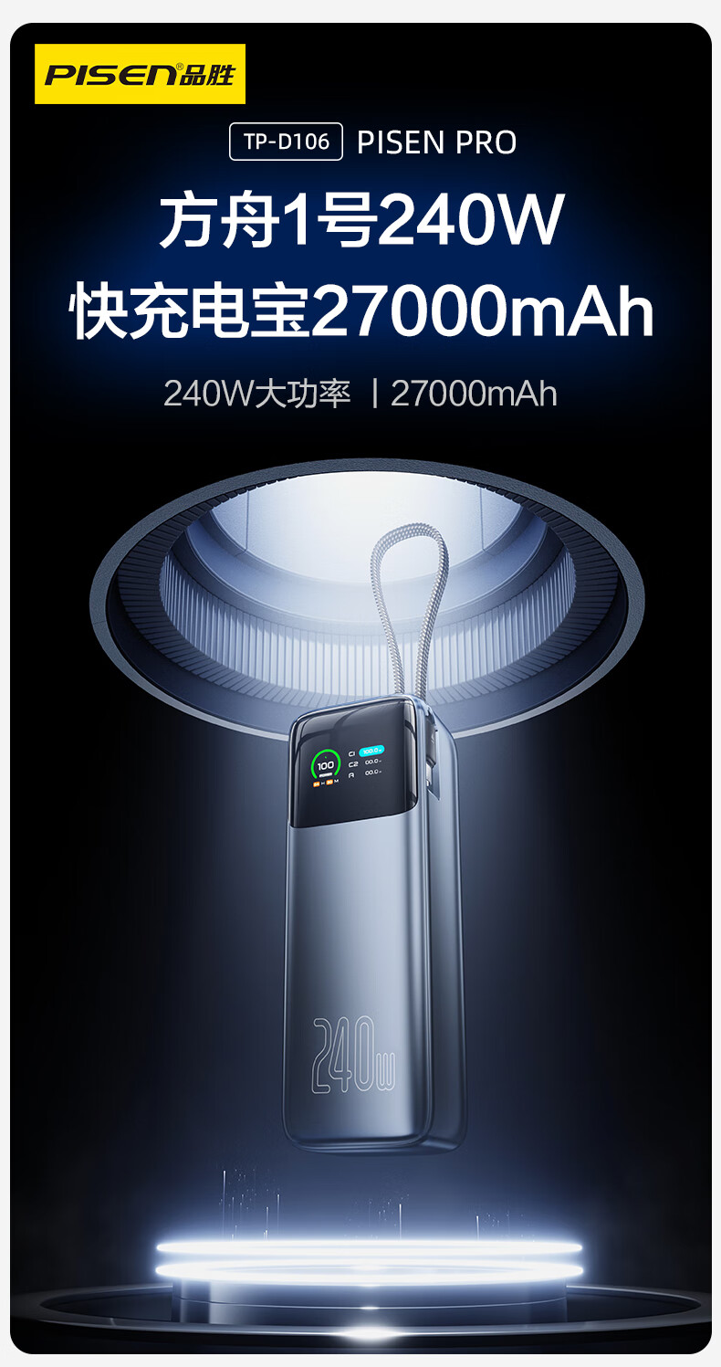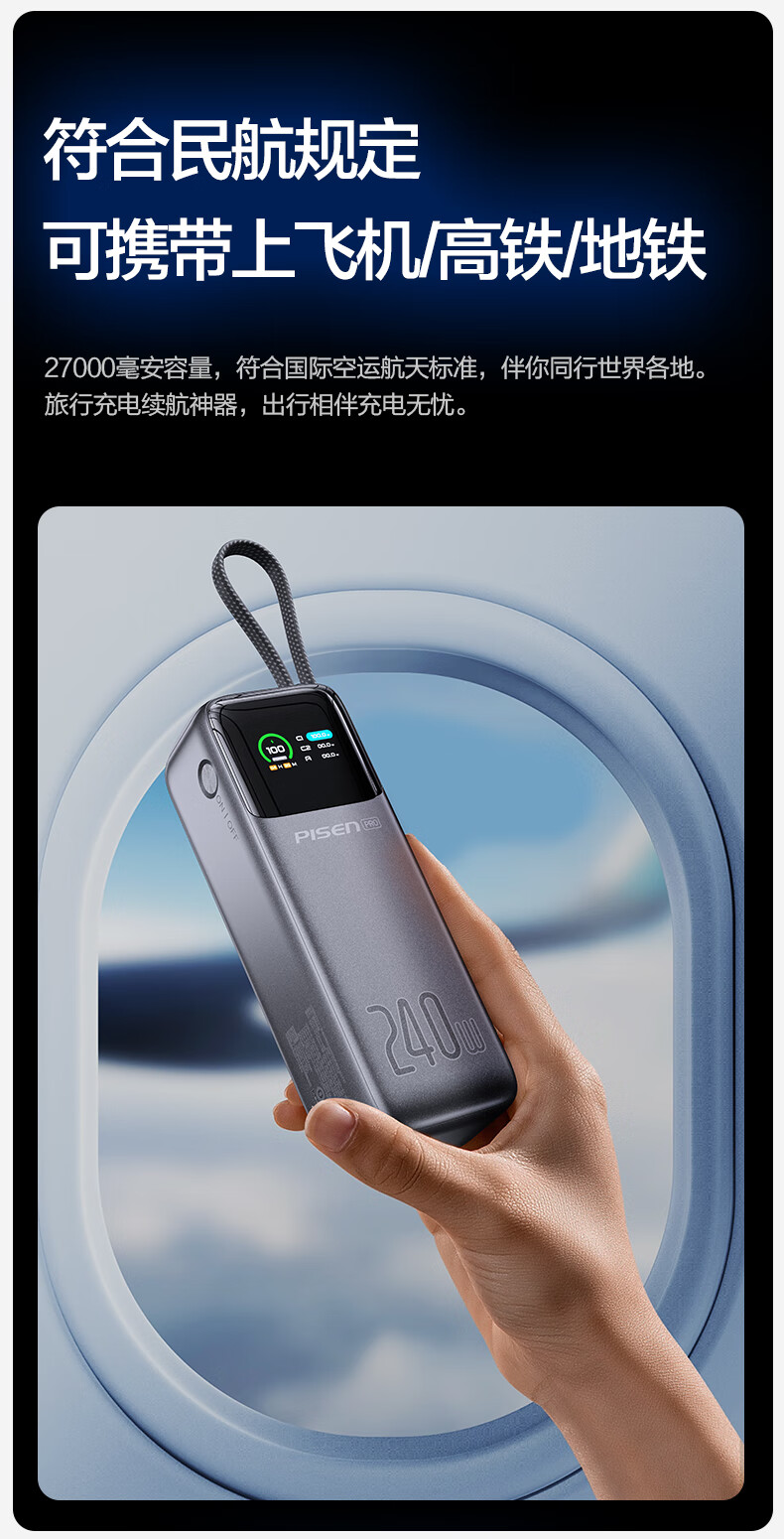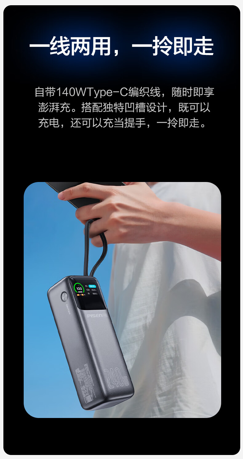 品胜充电宝240W总功率带线140W快充27000mAh移动电源可上飞机适用小米17苹果笔记本17promax/Air60W40W
