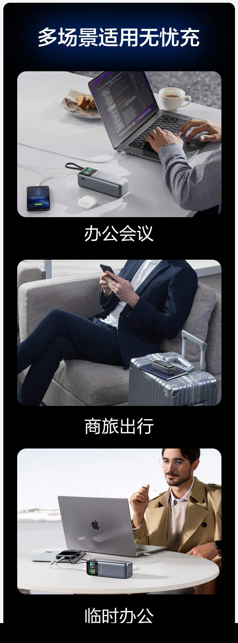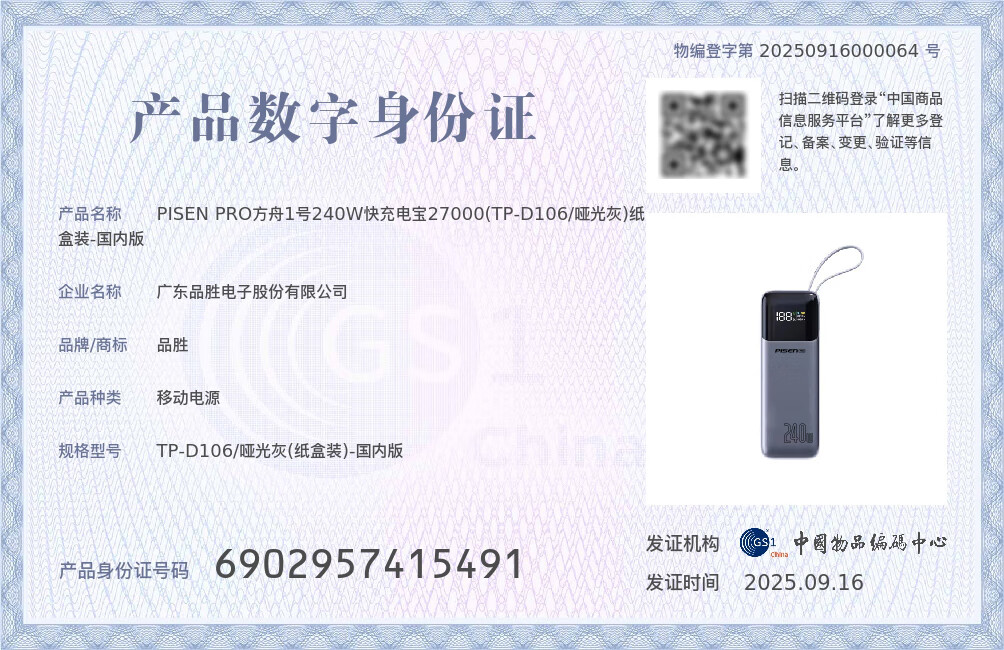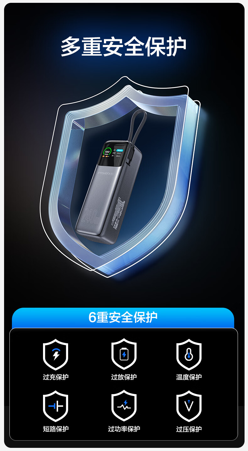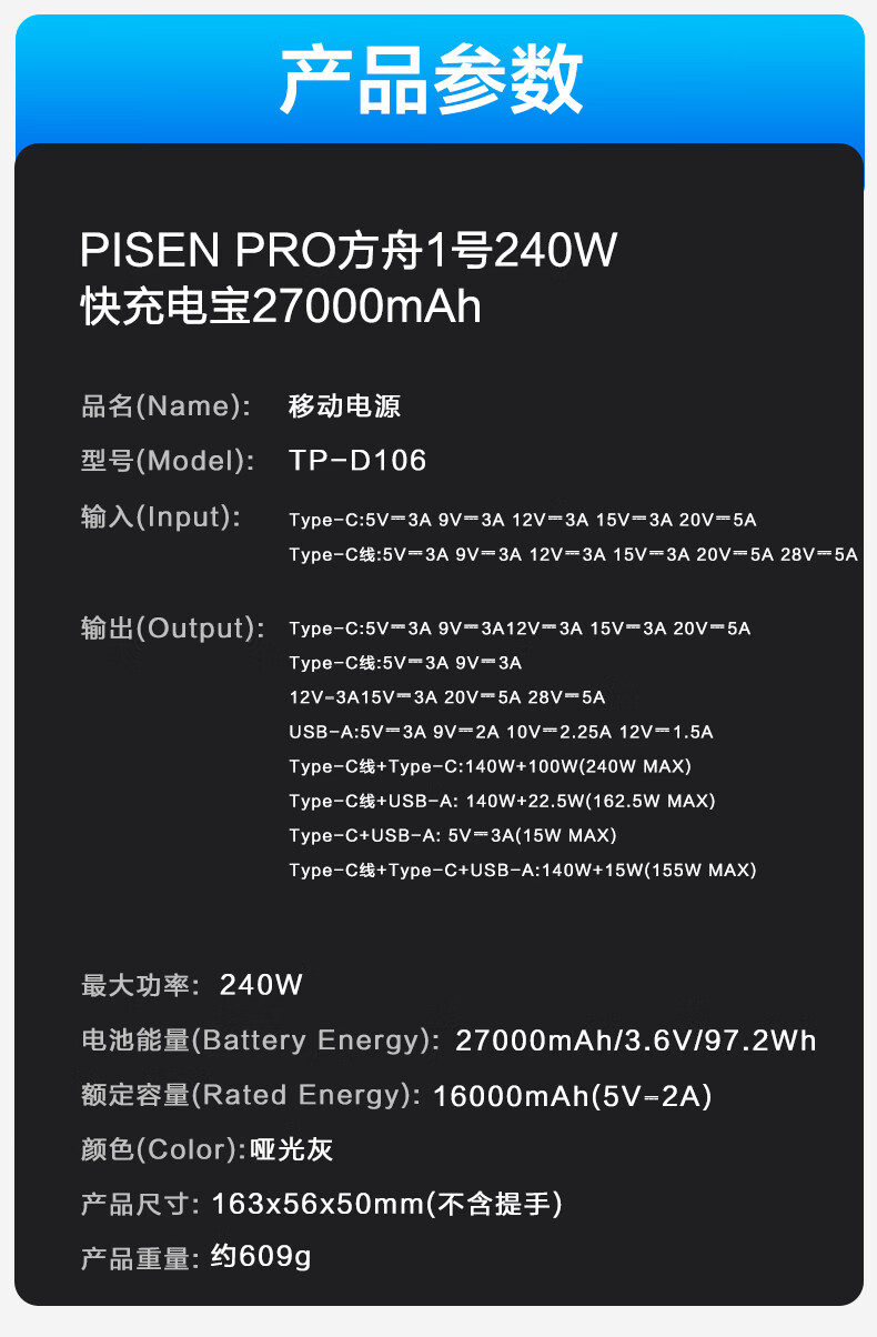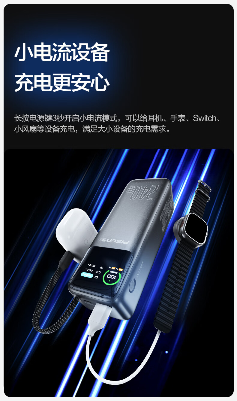 品胜充电宝240W总功率带线140W快充27000mAh移动电源可上飞机适用小米17苹果笔记本17promax/Air60W40W