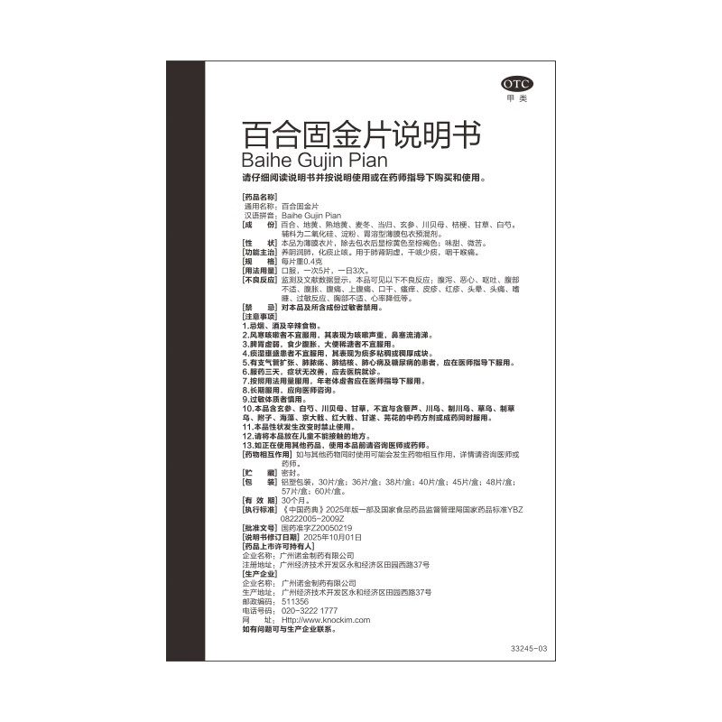 诺金 银诺克百合固金片 0.4g*30片/盒 化痰止咳养阴润肺清咽利喉 用于肺肾阴虚干咳少痰久咳咽干喉痛