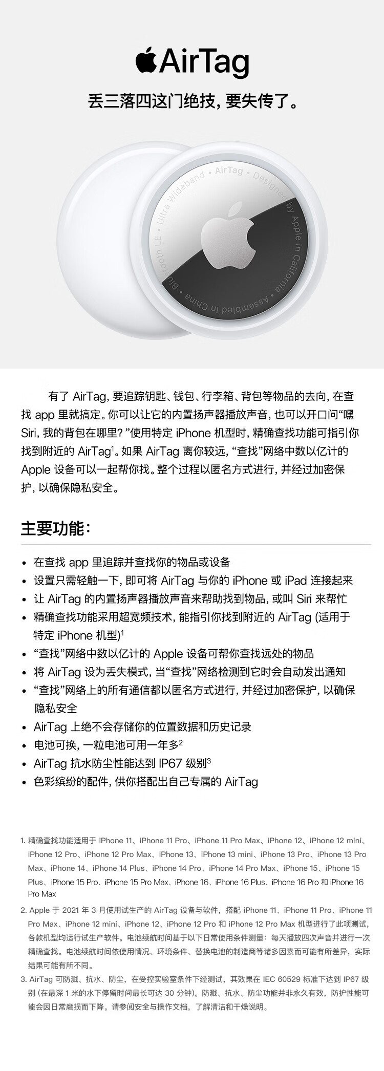 Apple/苹果 AirTag (4件装) 追踪器追踪定位宠物儿童老人防丢 苹果原装 适用于iPhone/iPad