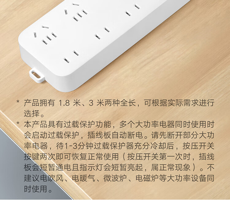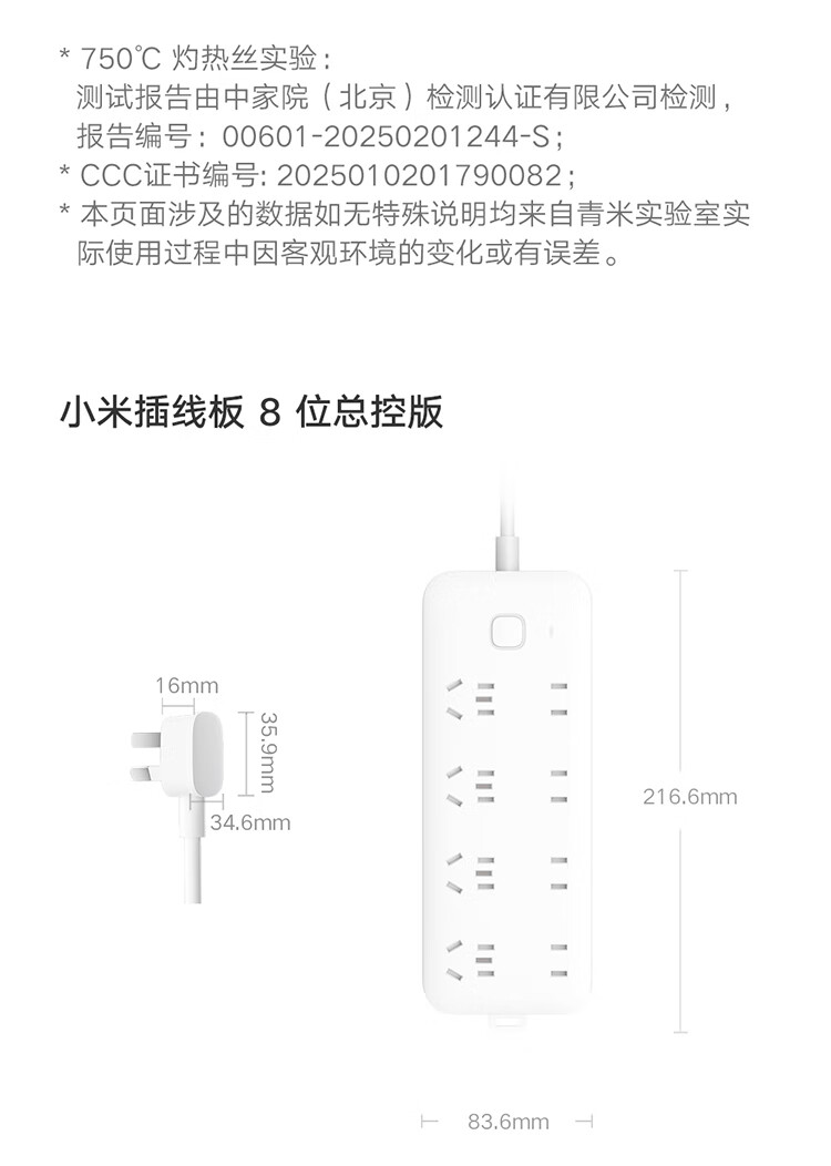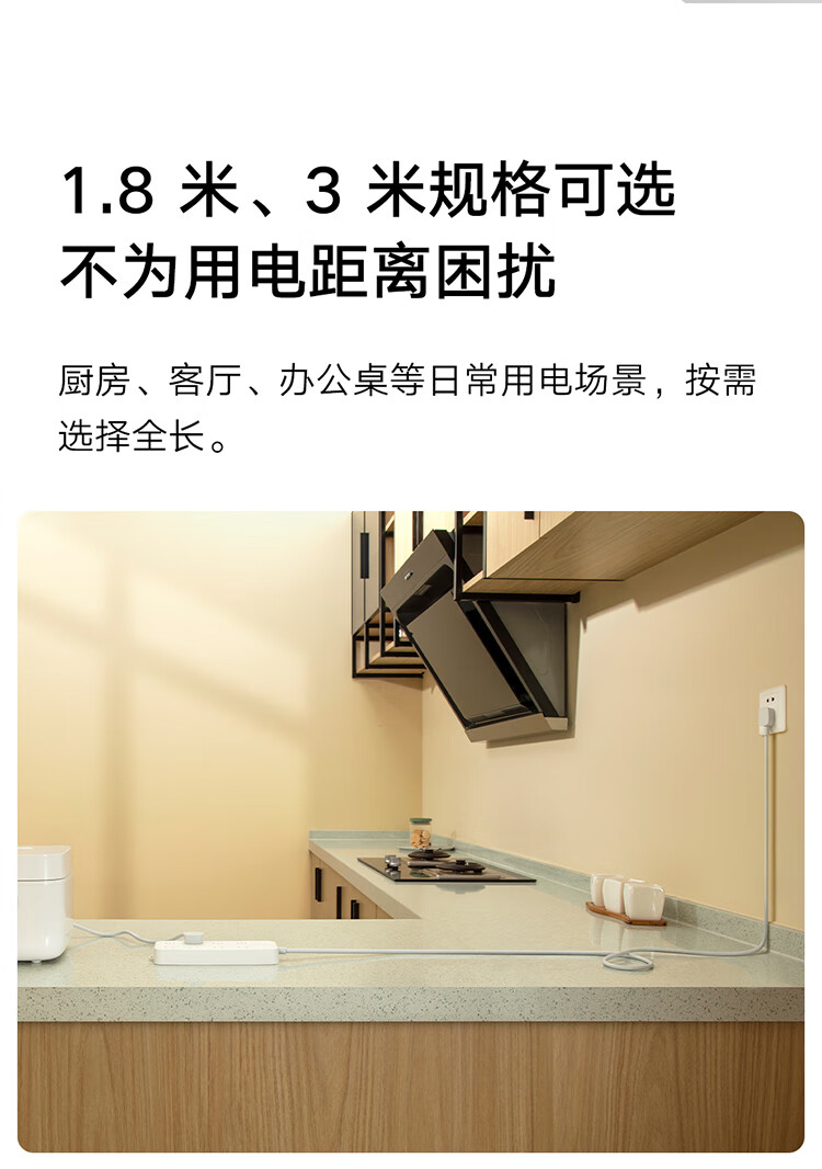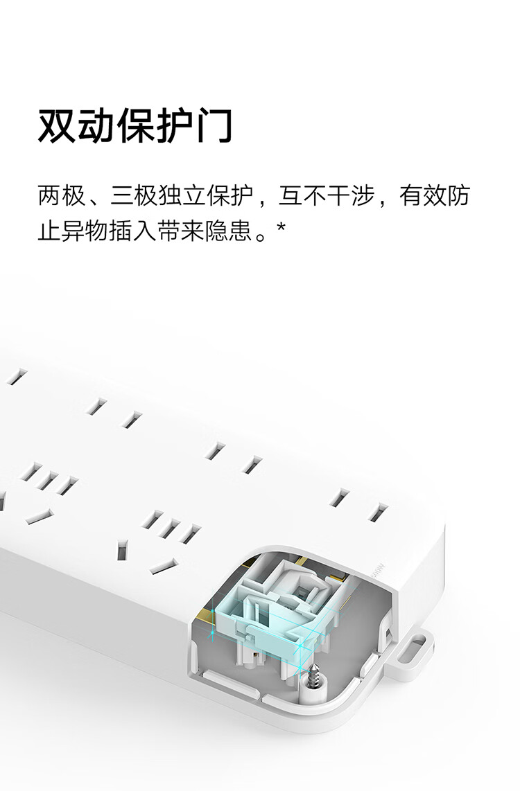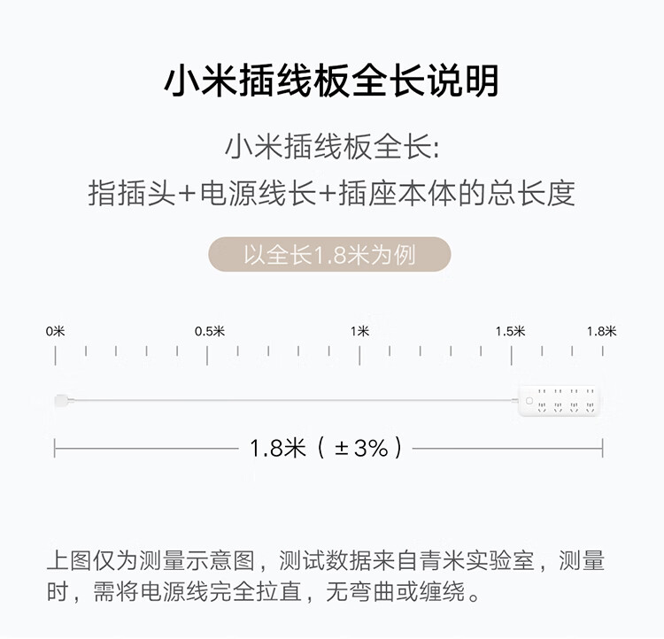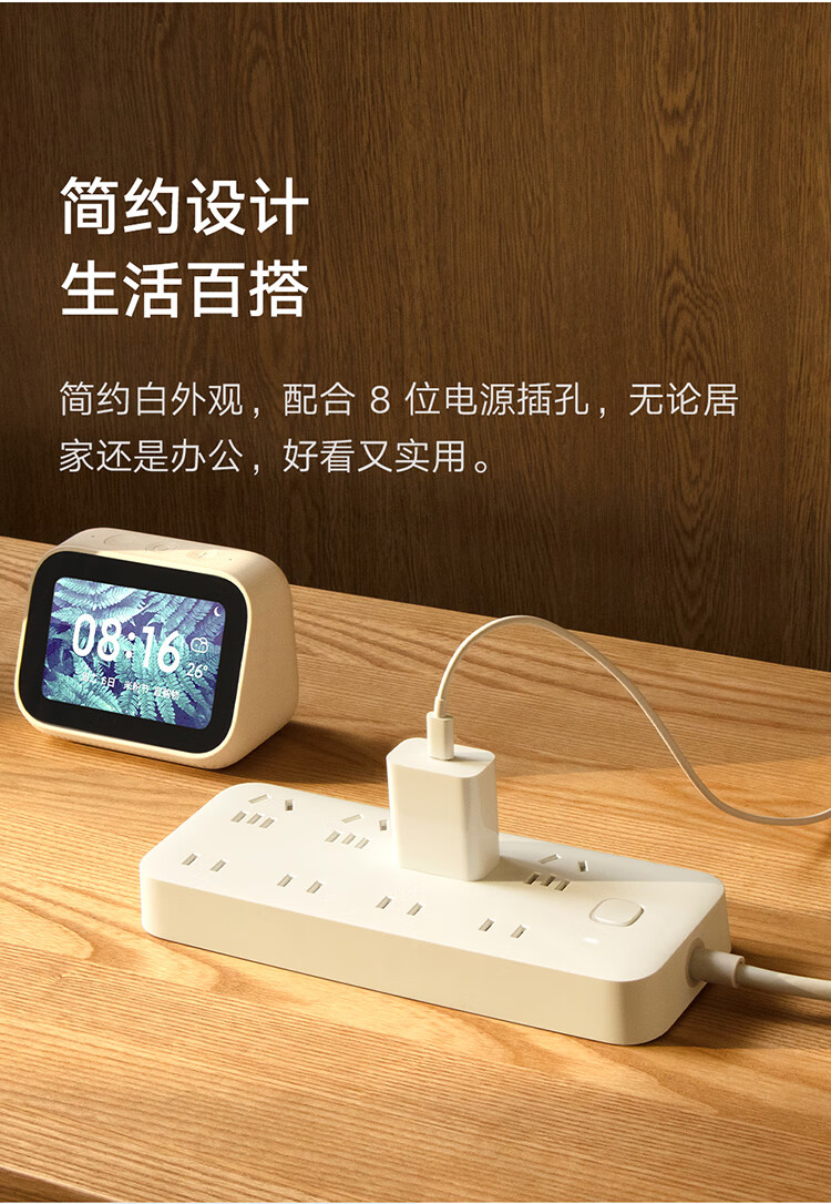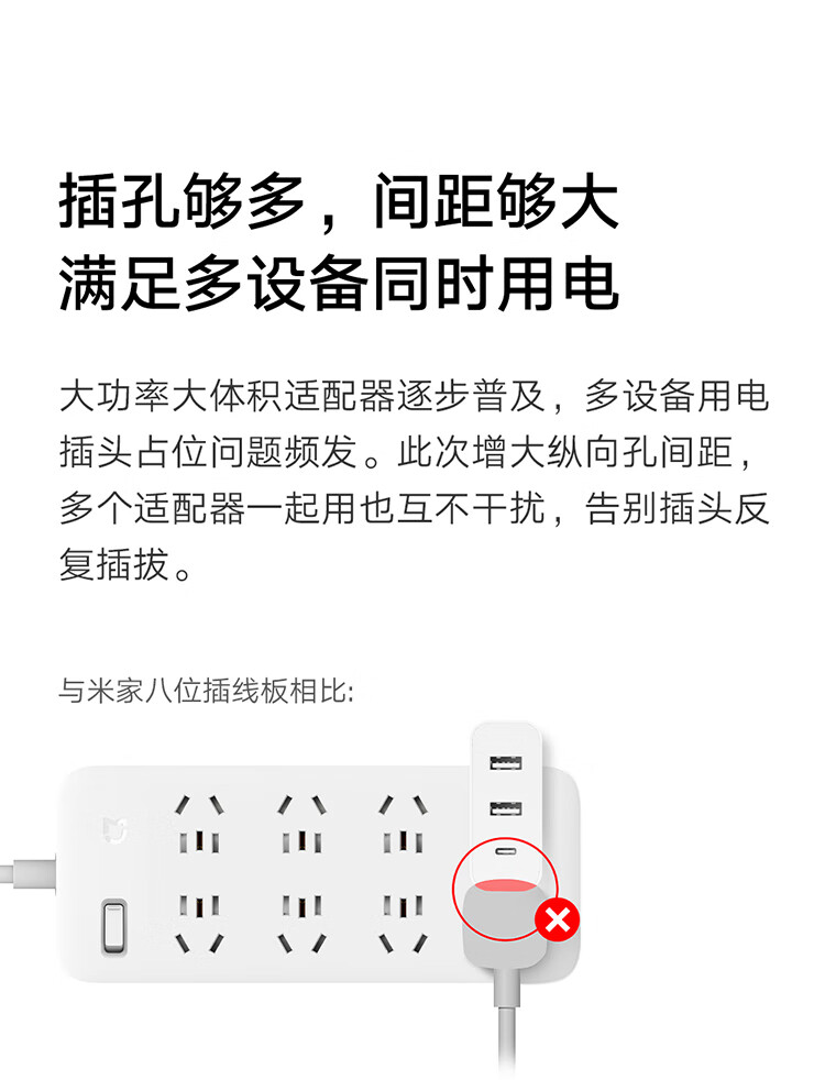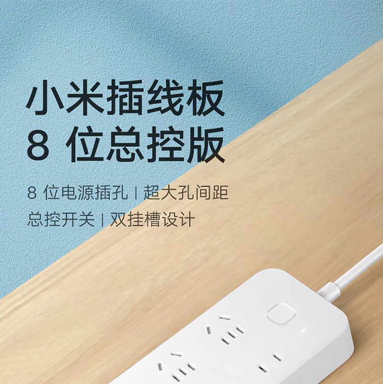 小米(MI)插线板8位总控开关插排插座插板一转多插座全长1.8m适用小米17小米电暖器/热水器/电热毯