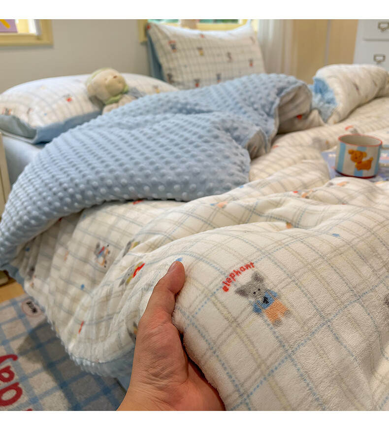名创优品牛奶绒被套单件冬季加厚150x200x230被罩双面珊瑚绒被单四件套 牛油果绿+浅灰 【内含导电丝 抗静电】 单被套- 200cm*230cm