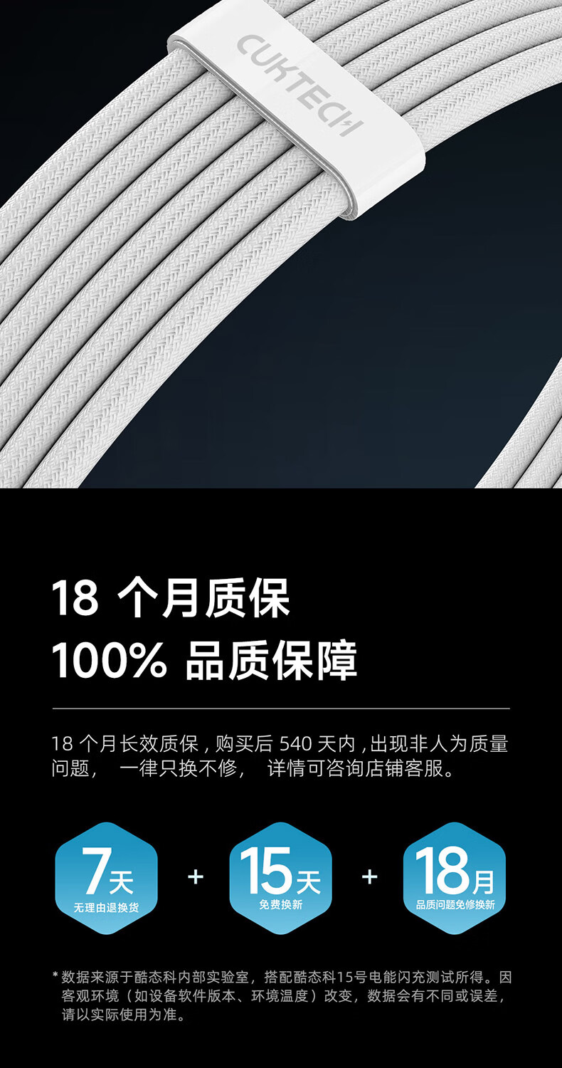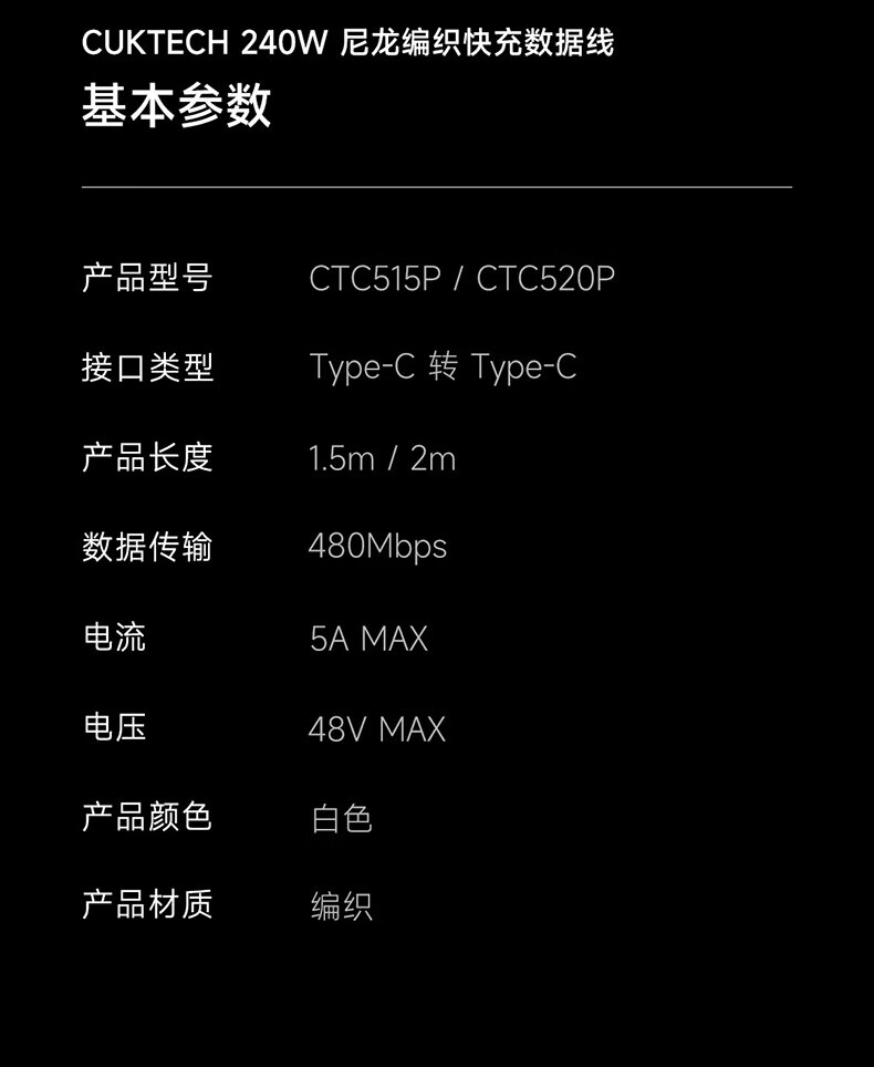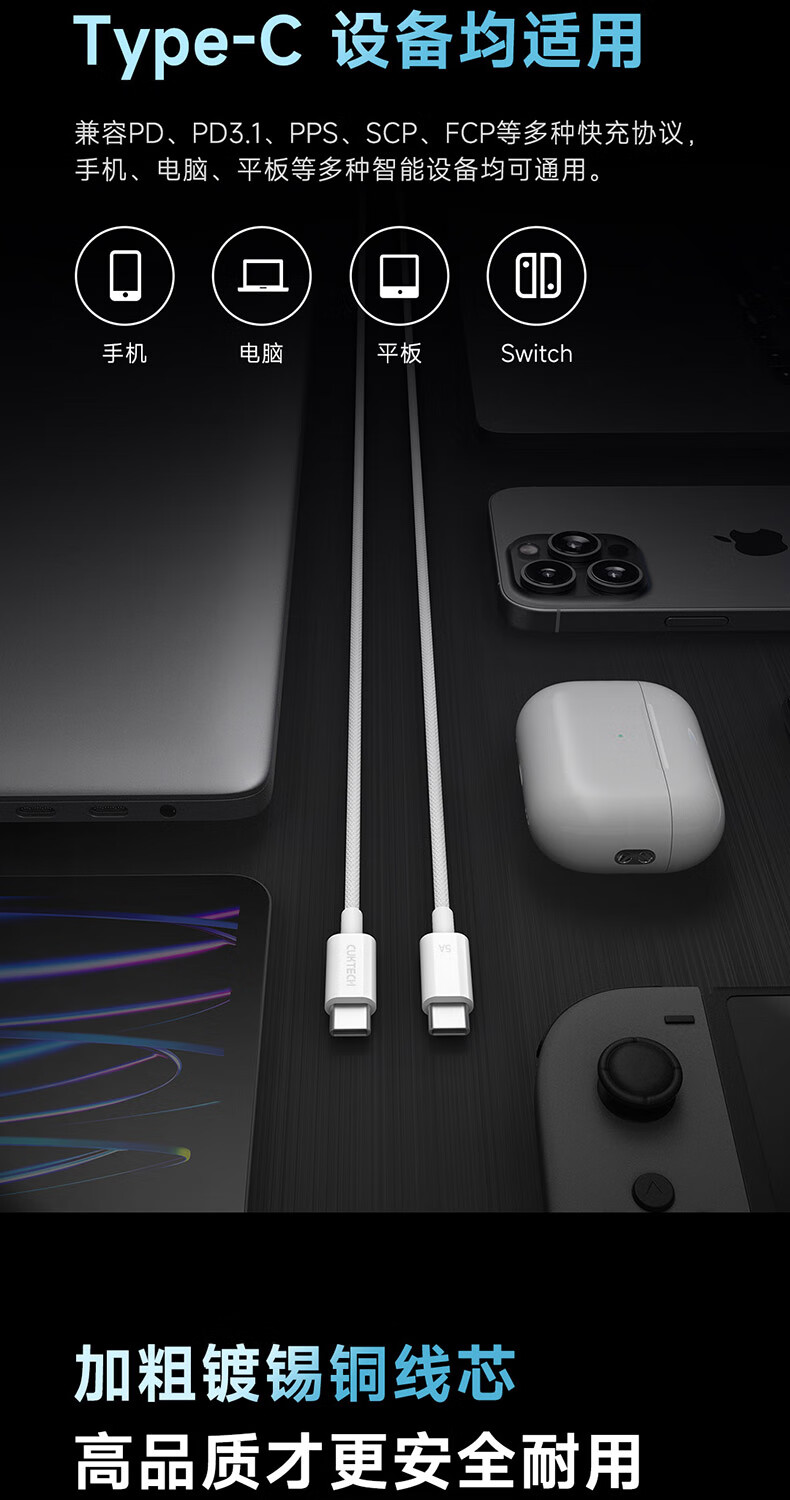 CUKTECH酷态科苹果17充电线type-c数据线240W大功率PD3.1快充5A高速数据传输ctoc编织适用iPhone16/15小米
