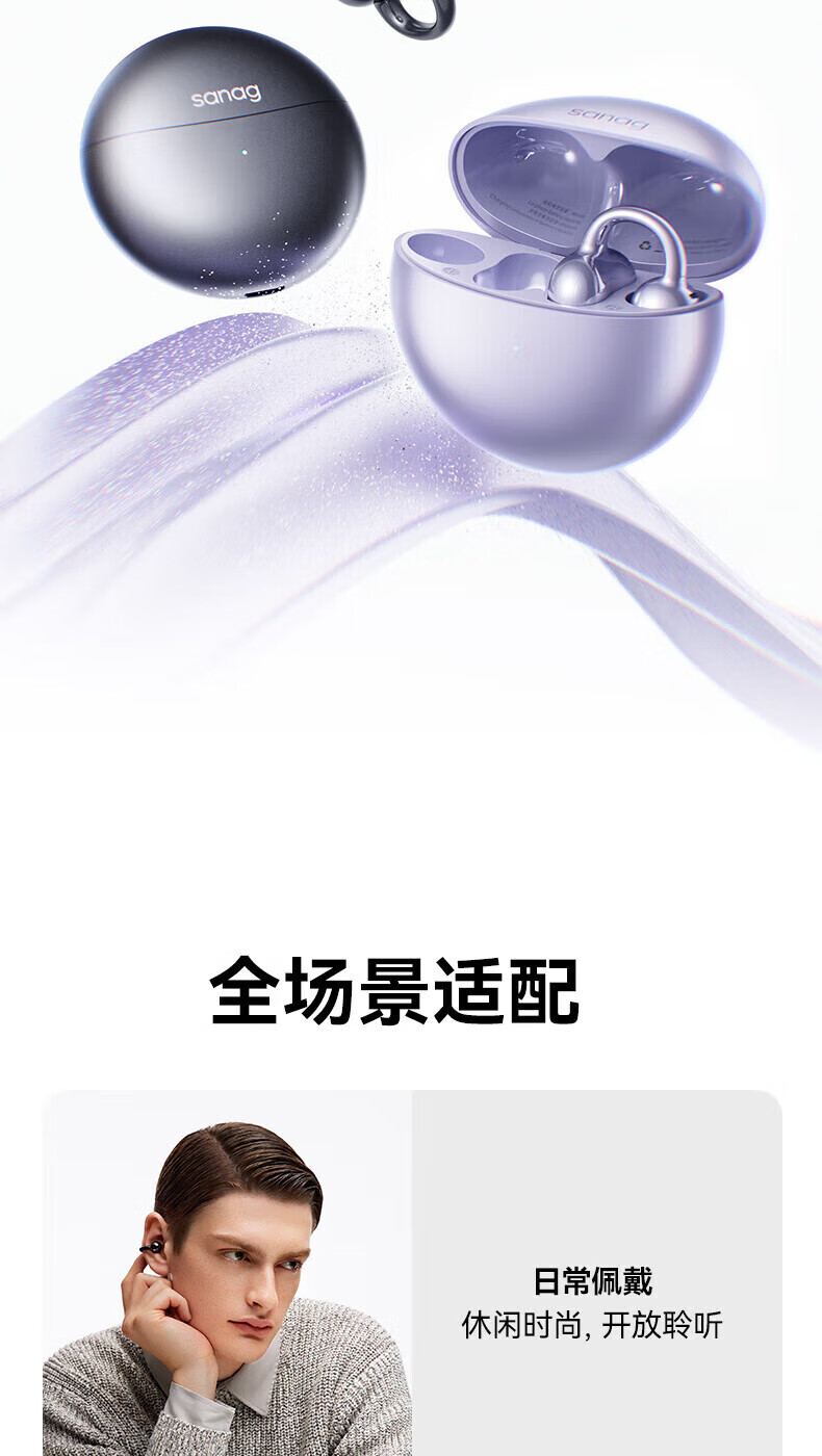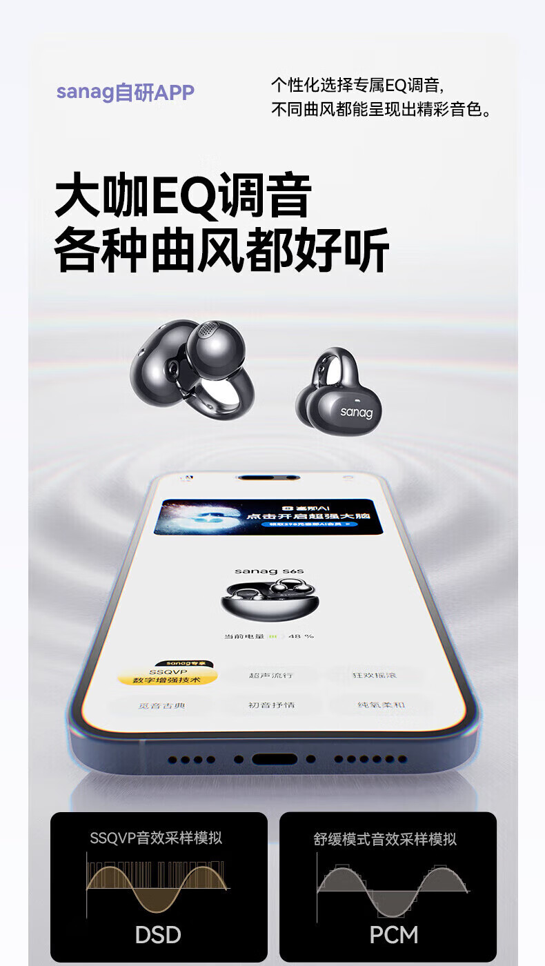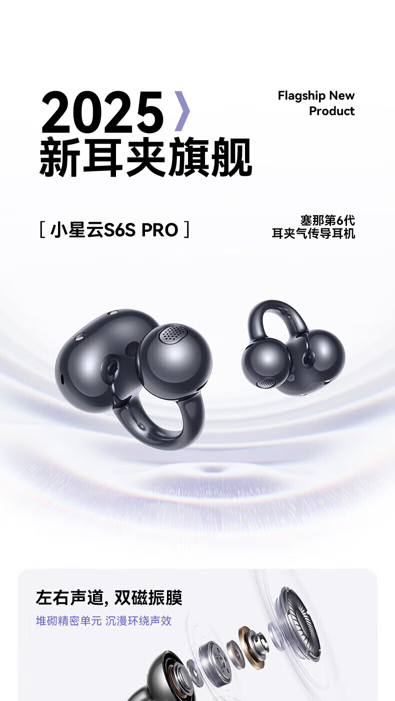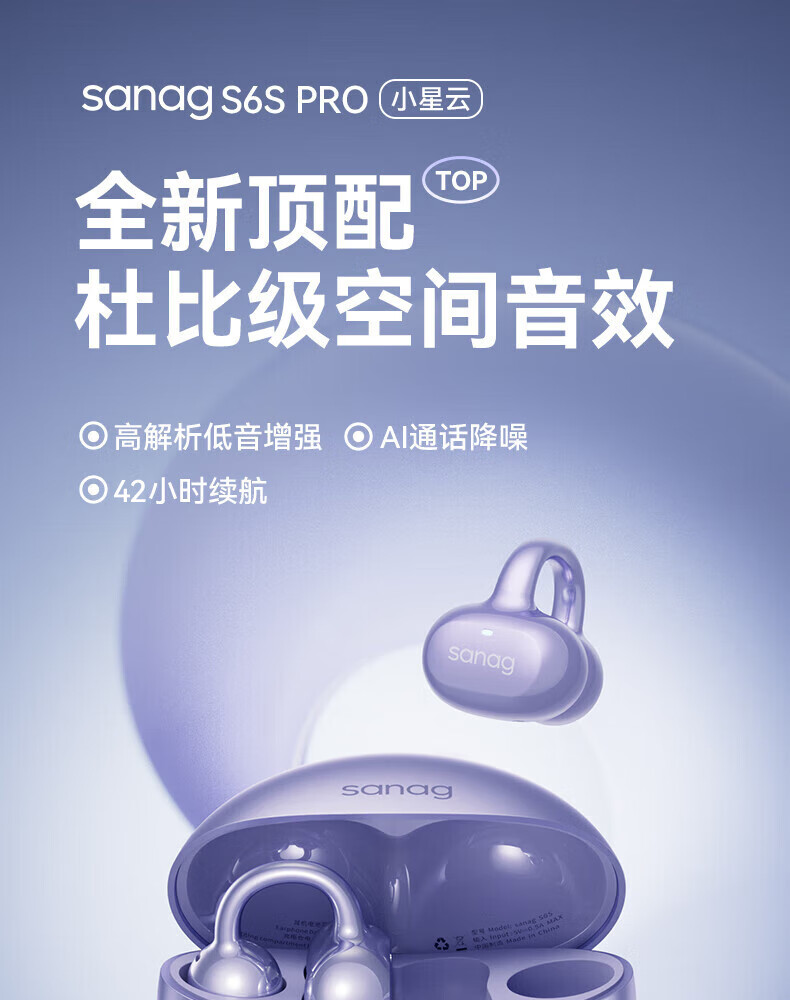 SANAG塞那S6S Pro蓝牙耳机耳夹骨传导概念开放式无线夹耳式不入耳听力保护运动跑步通话降噪耳夹耳机