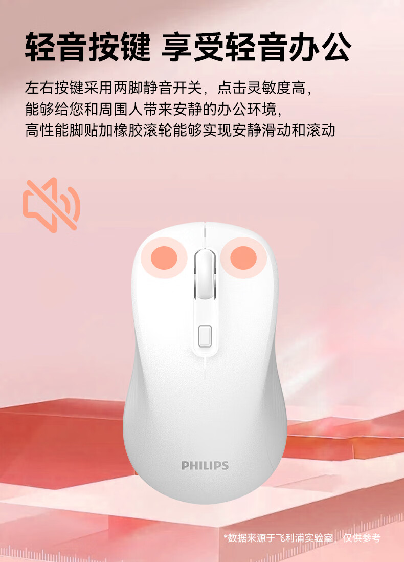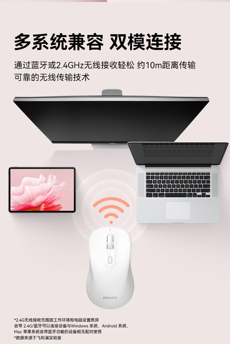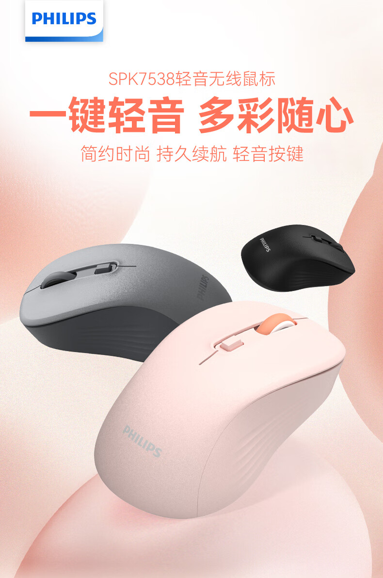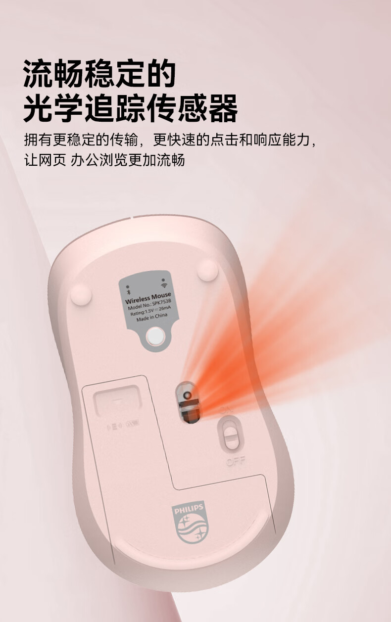 飞利浦(PHILIPS)SPK7538无线蓝牙鼠标双模轻音办公鼠标人体工学苹果mac台式电脑笔记本通用企业采购 粉色