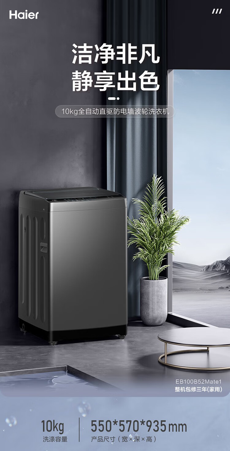 海尔(Haier)波轮洗衣机全自动家用10KG大容量 防电墙【EB100B52Mate1】家电国家补贴以旧换新直驱变频一级能效
