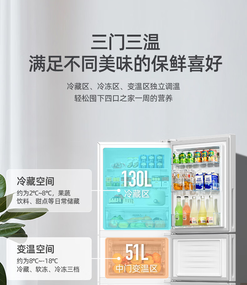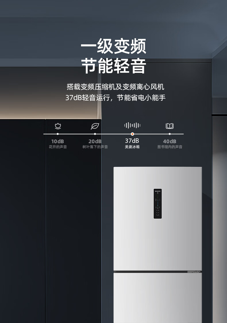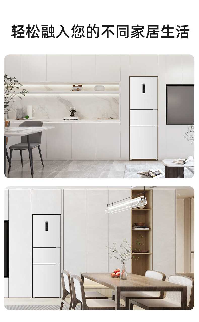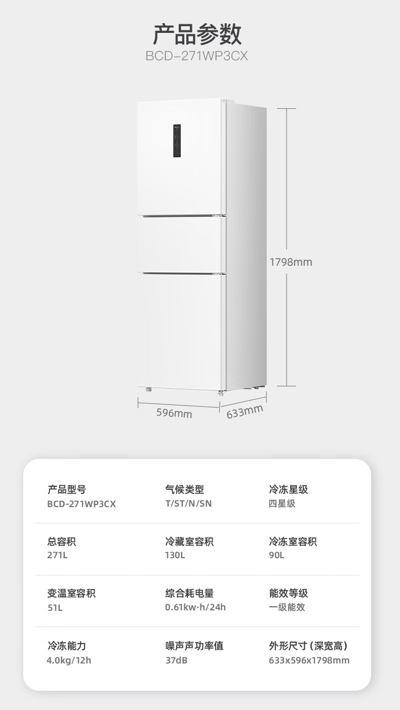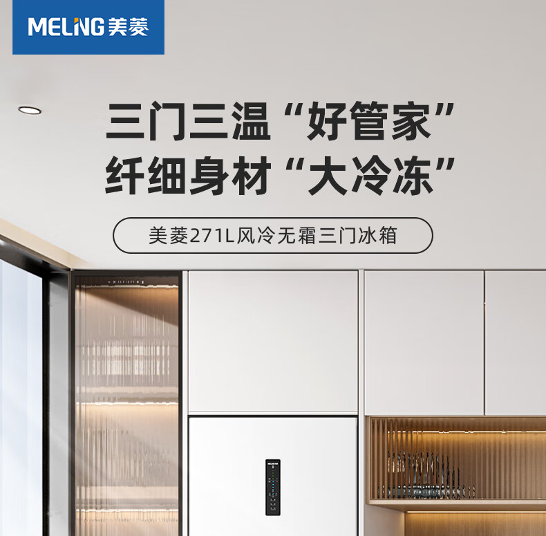 美菱(MeiLing)离子净271升三门冰箱三开门家用变频一级省电风冷无霜宿舍租房小户型冰箱BCD-271WP3CX白国家补贴
