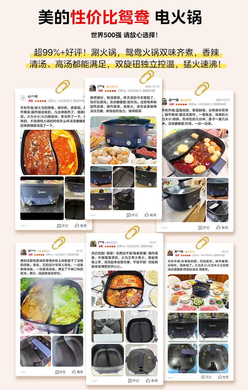 美的(Midea)电火锅 鸳鸯锅 火锅专用锅 电煮锅多功能锅6分钟速沸双旋钮分区双控家用电热锅6L多用途锅火锅锅 6L 【2000W猛火速沸】 HGC303012