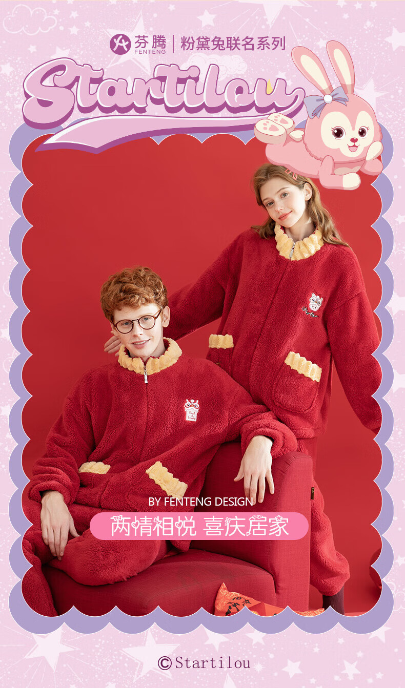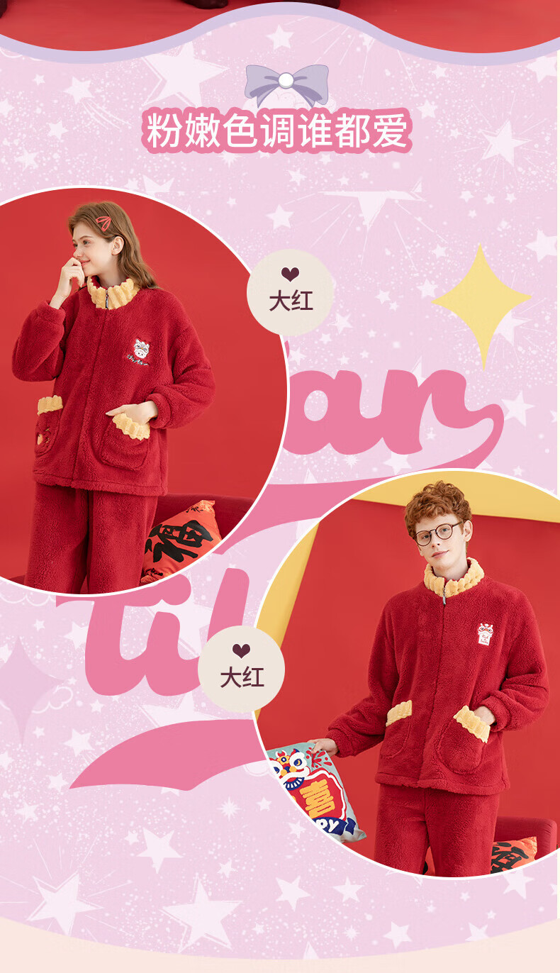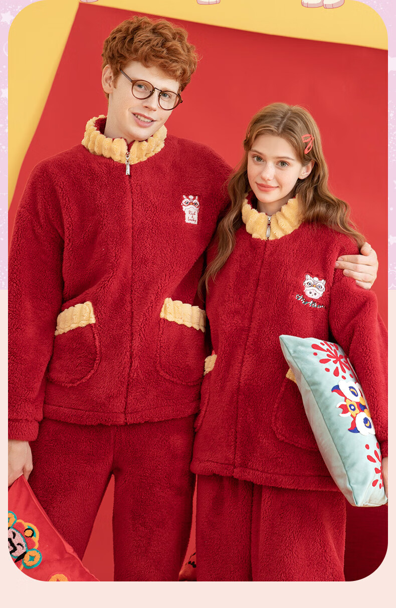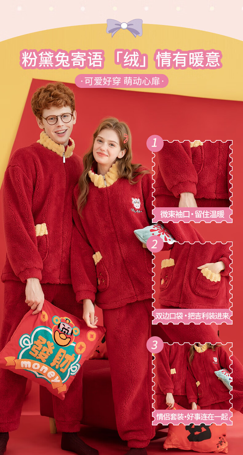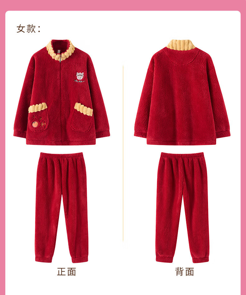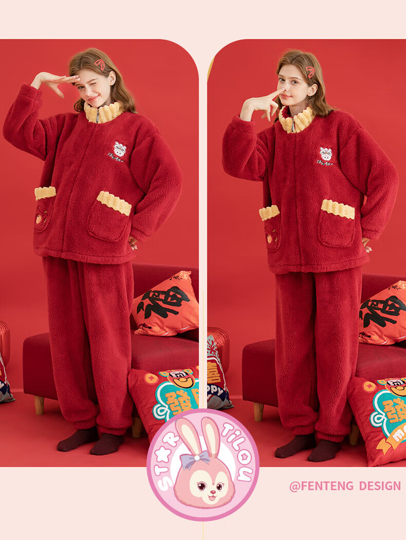 芬腾本命年蛇年秋冬喜庆立领南芙泡绒暖绒家居服套装 大红(女款) XL