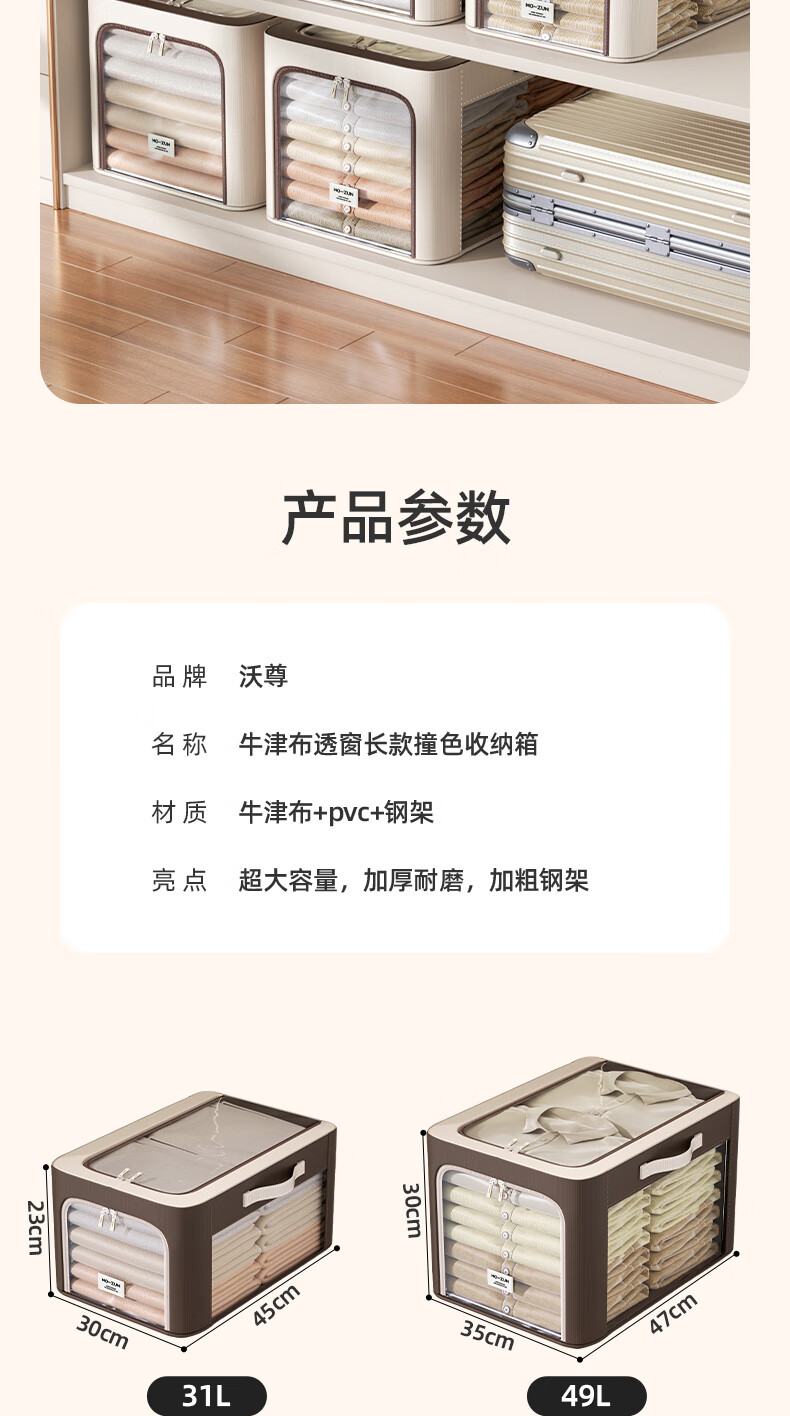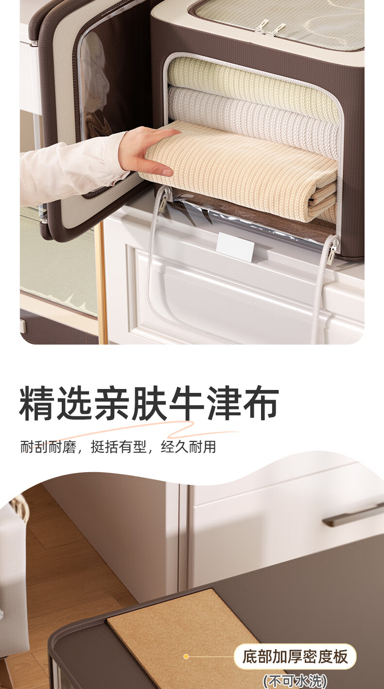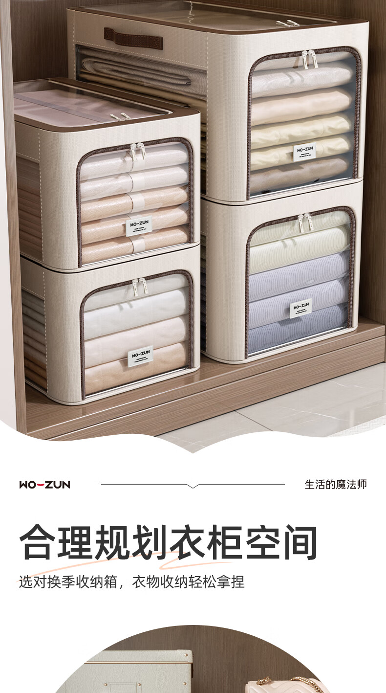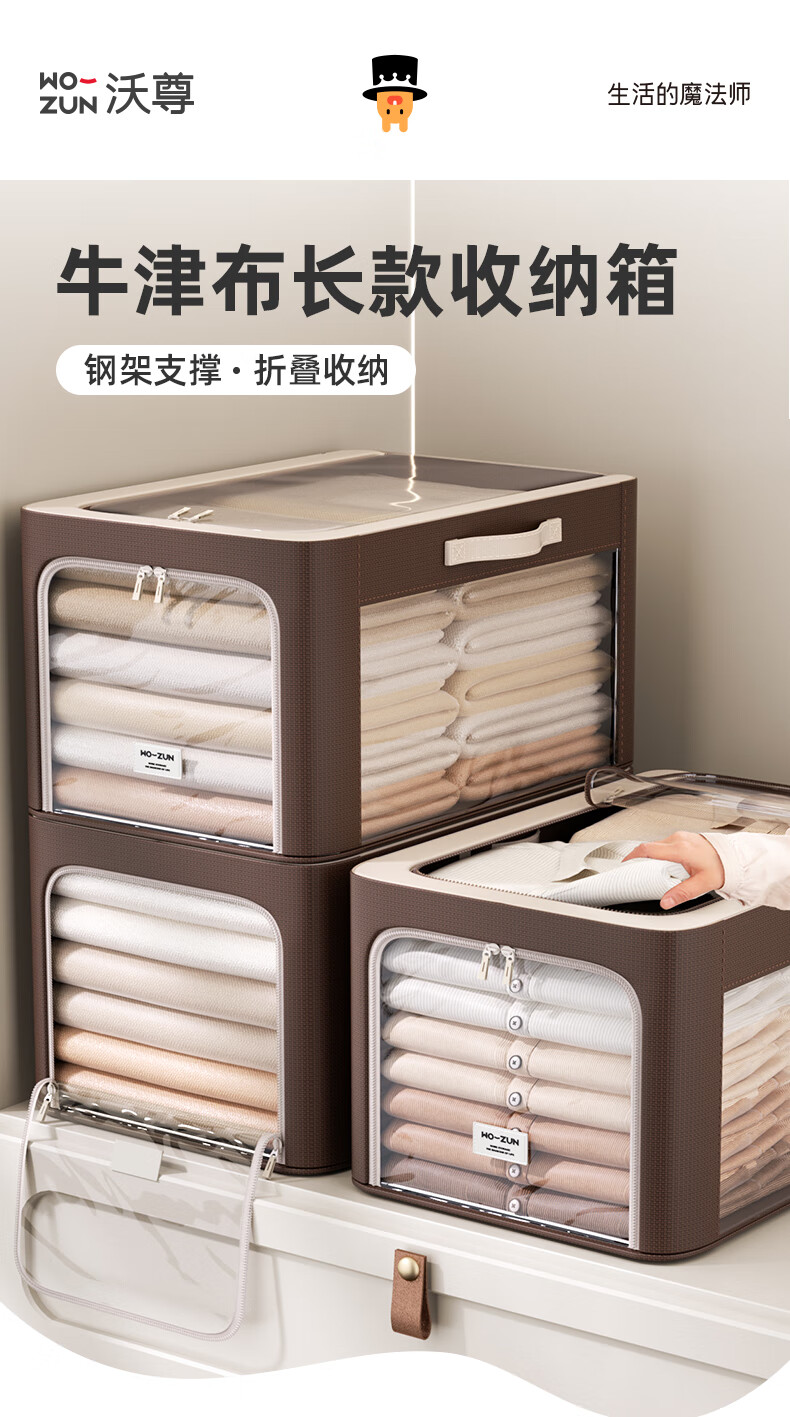 沃尊衣柜衣服收纳箱收纳盒牛津布整理箱透明升级窄长型夹缝衣物储物盒 米色特大号55L【加粗钢架】55*35*30cm